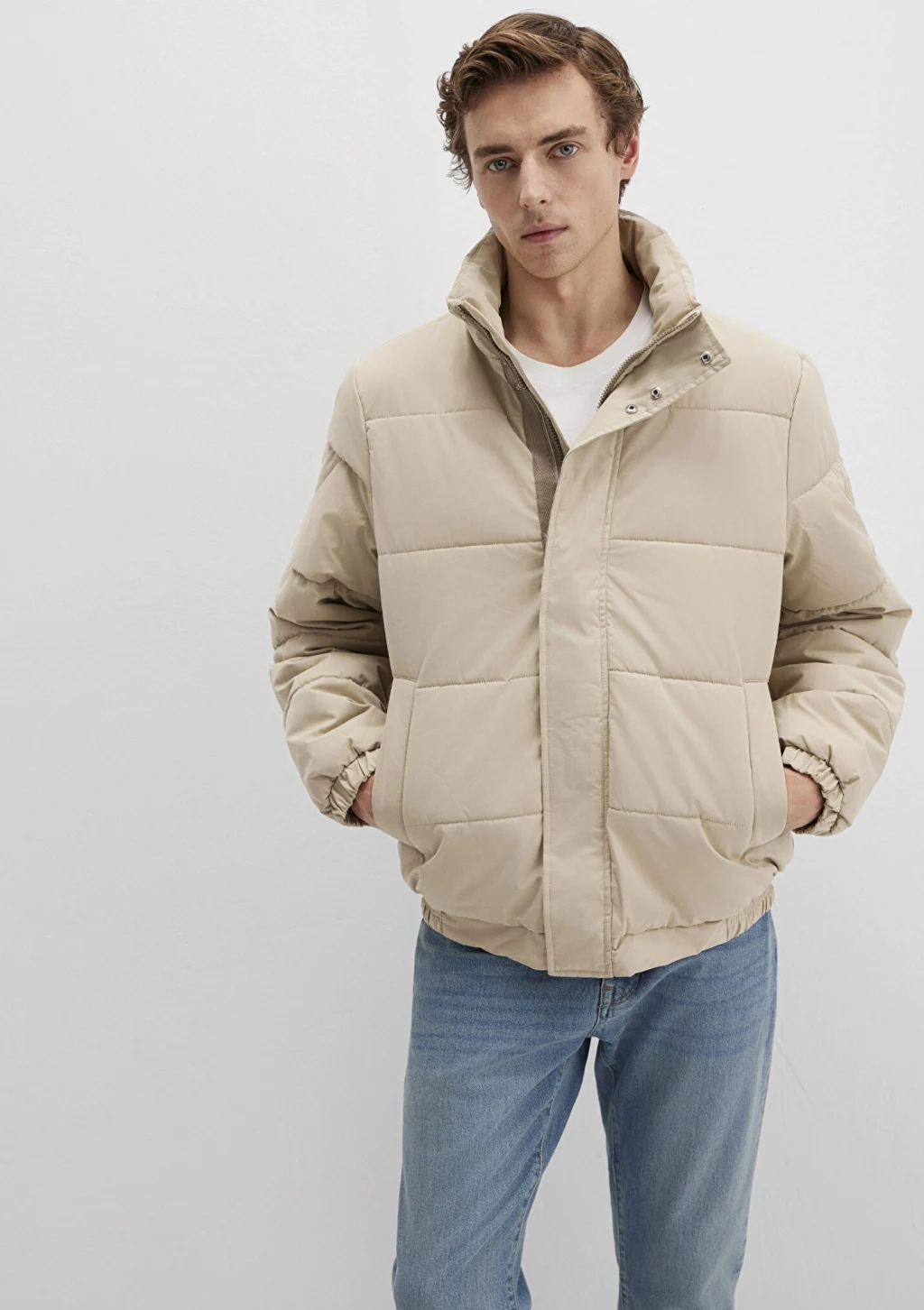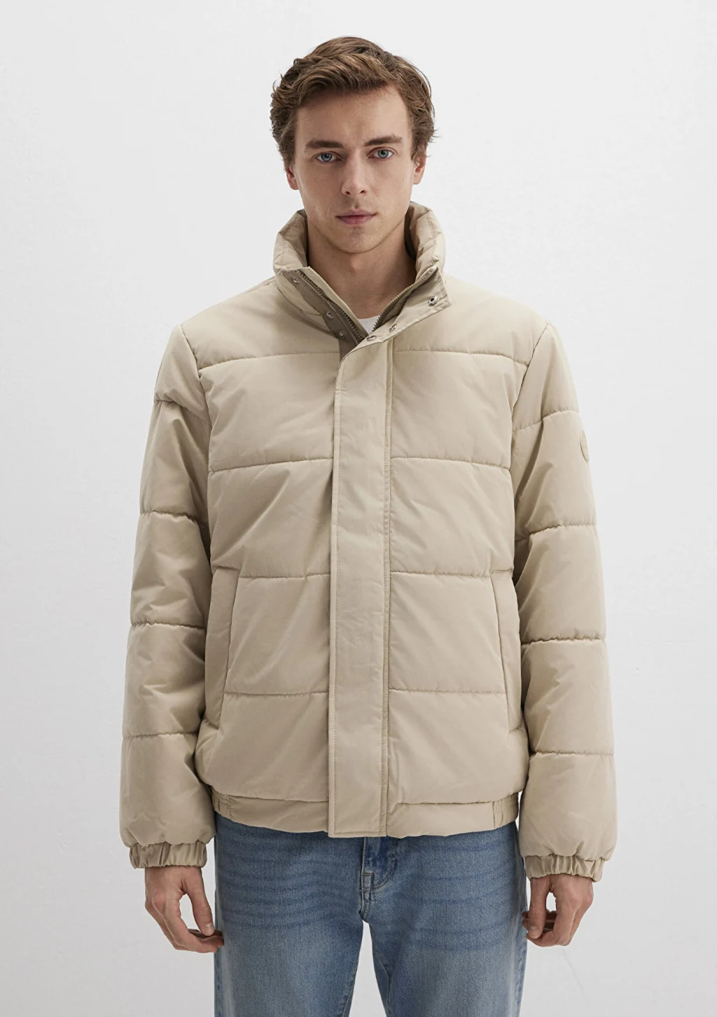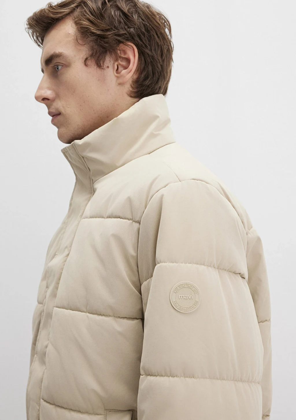 Mavi nin dış giyim koleksiyonundan Dik Yaka Bej Şişme Mont. İki adet yan cep, bir adet iç cep.