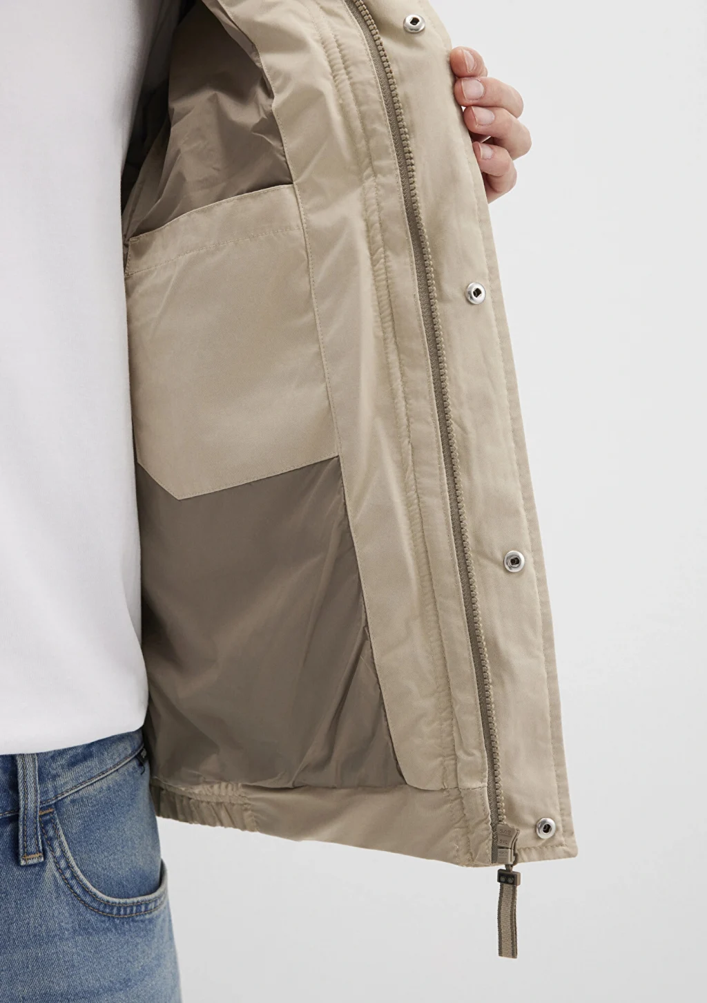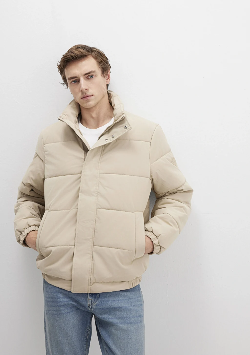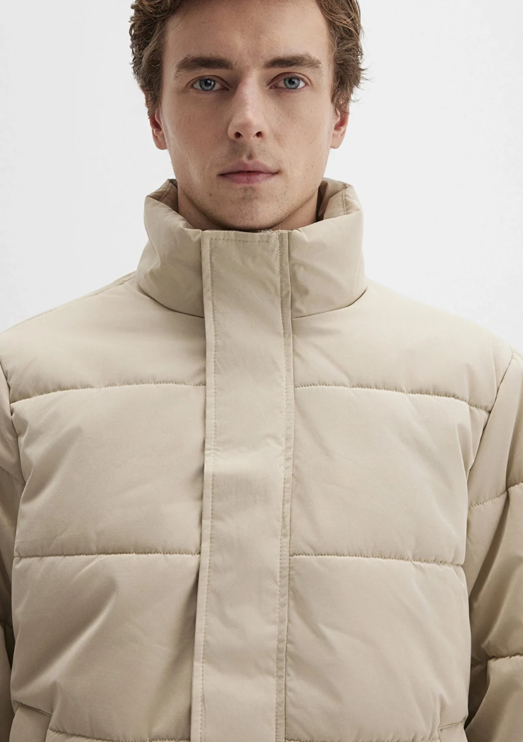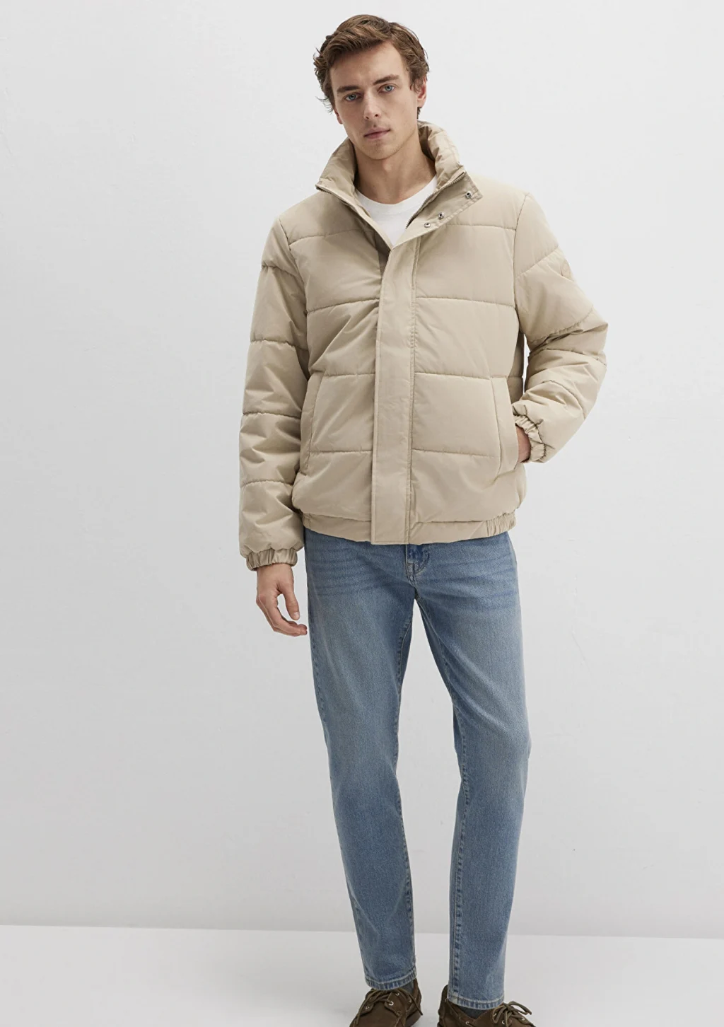 Mavi nin dış giyim koleksiyonundan Dik Yaka Bej Şişme Mont. İki adet yan cep, bir adet iç cep.