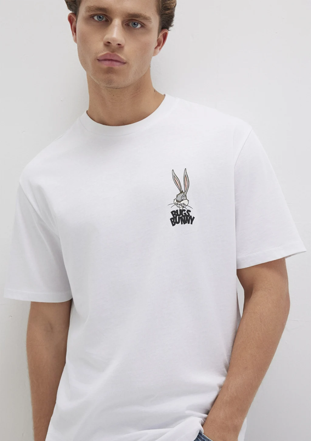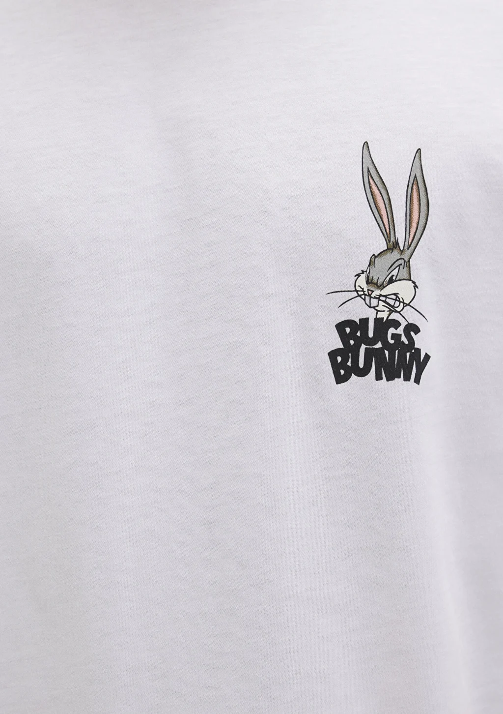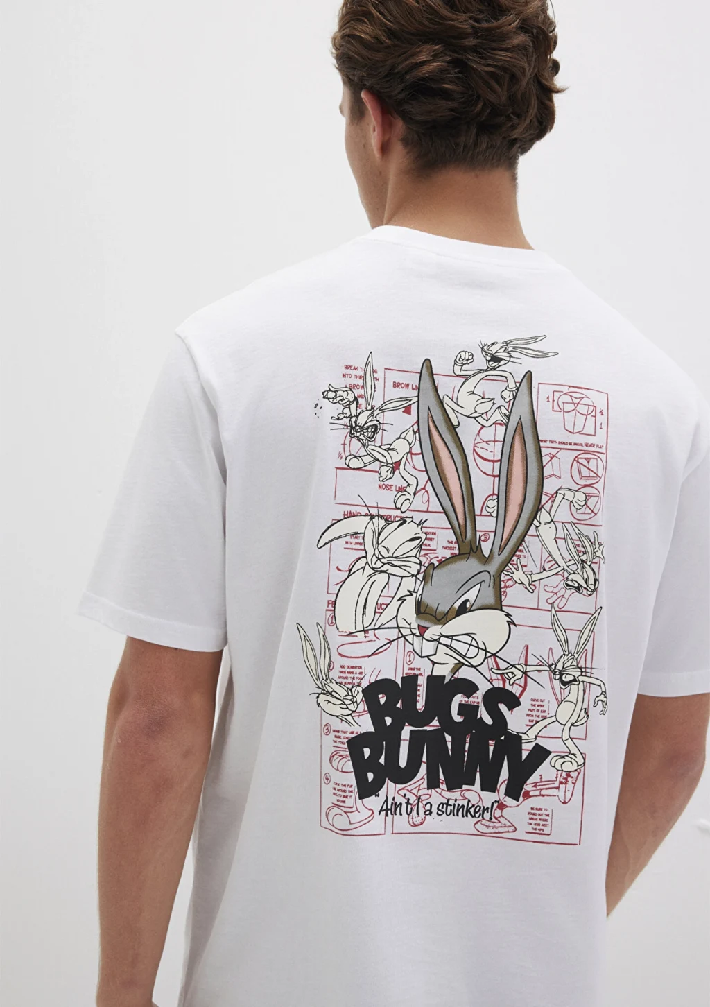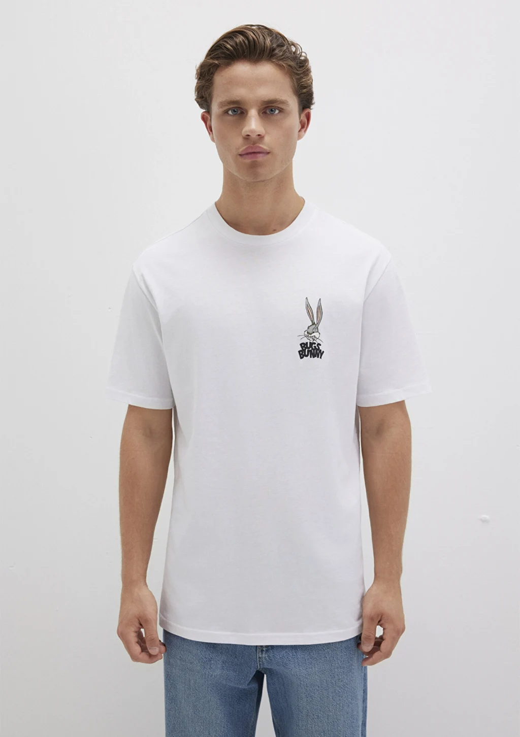 Bugs Bunny Baskılı Beyaz Tişört, yüzde yüz pamuklu orta ağırlıkta kumaştan üretilmiştir. Loose fit, rahat kesimi ve bisiklet yakası ile konforlu bir kullanım sunar. Ön göğüs kısmında küçük Bugs Bunny baskısı ve sırt kısmında büyük, detaylı Bugs Bunny görseli ile dikkat çeker. Kısa kollu tasarımı ve beyaz rengiyle her tarza uyum sağlar. Bugs Bunnynin zeki esprileri ve eğlenceli tavrı, tarzınıza neşe katacak