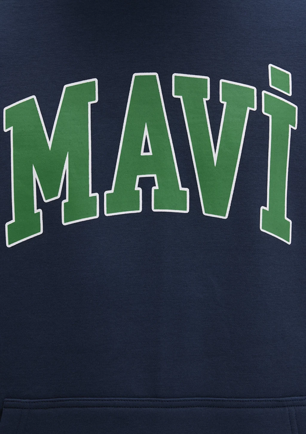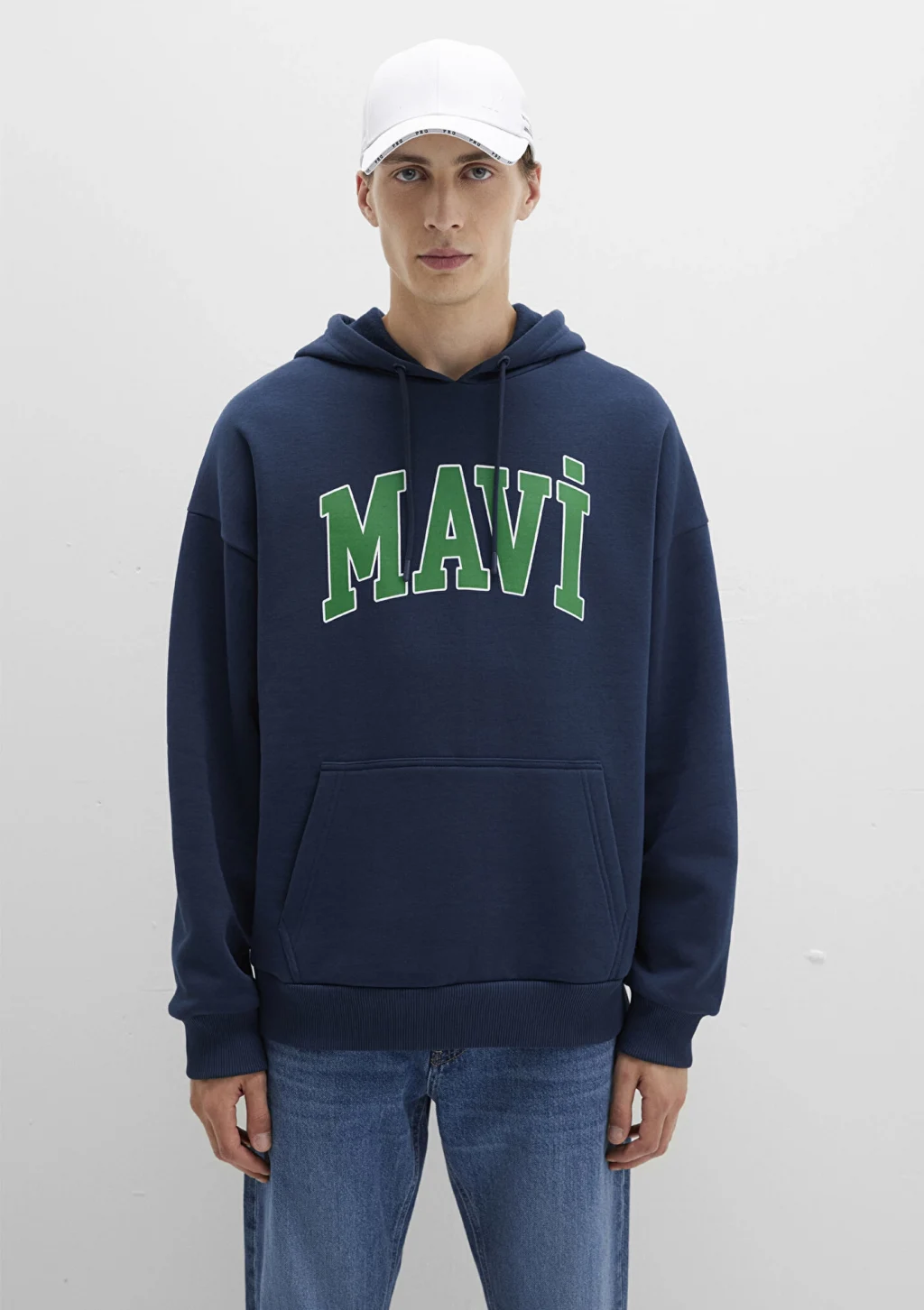 Mavi nin erkek koleksiyonundan Mavi Logo Baskılı Kapüşonlu Lacivert Sweatshirt. Şardonlu, iple ayarlanabilir kapüşon, içi şardonlu kanguru cep.