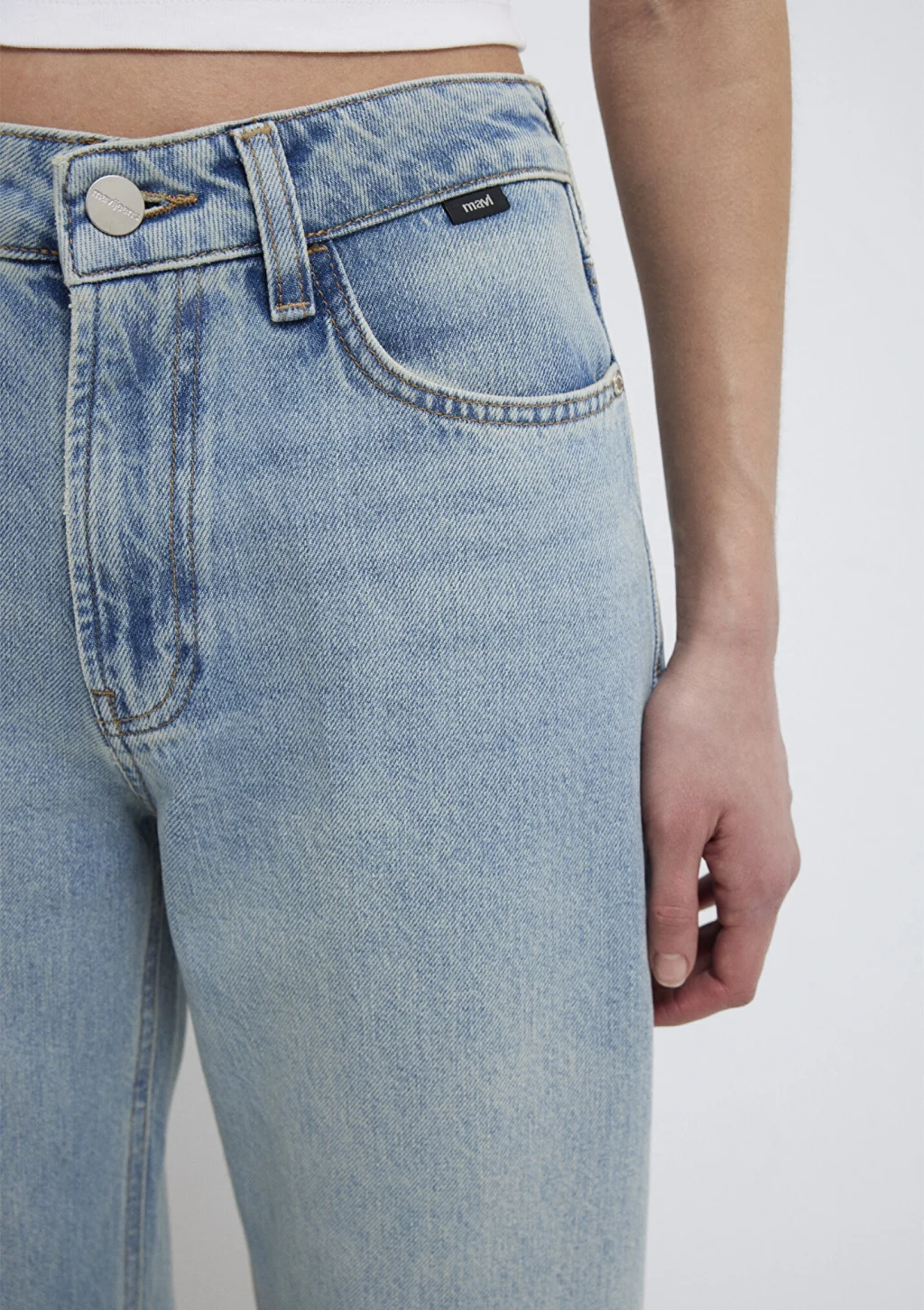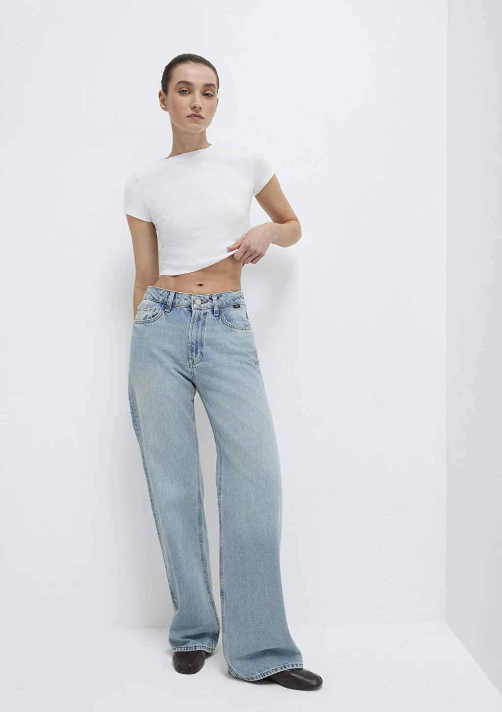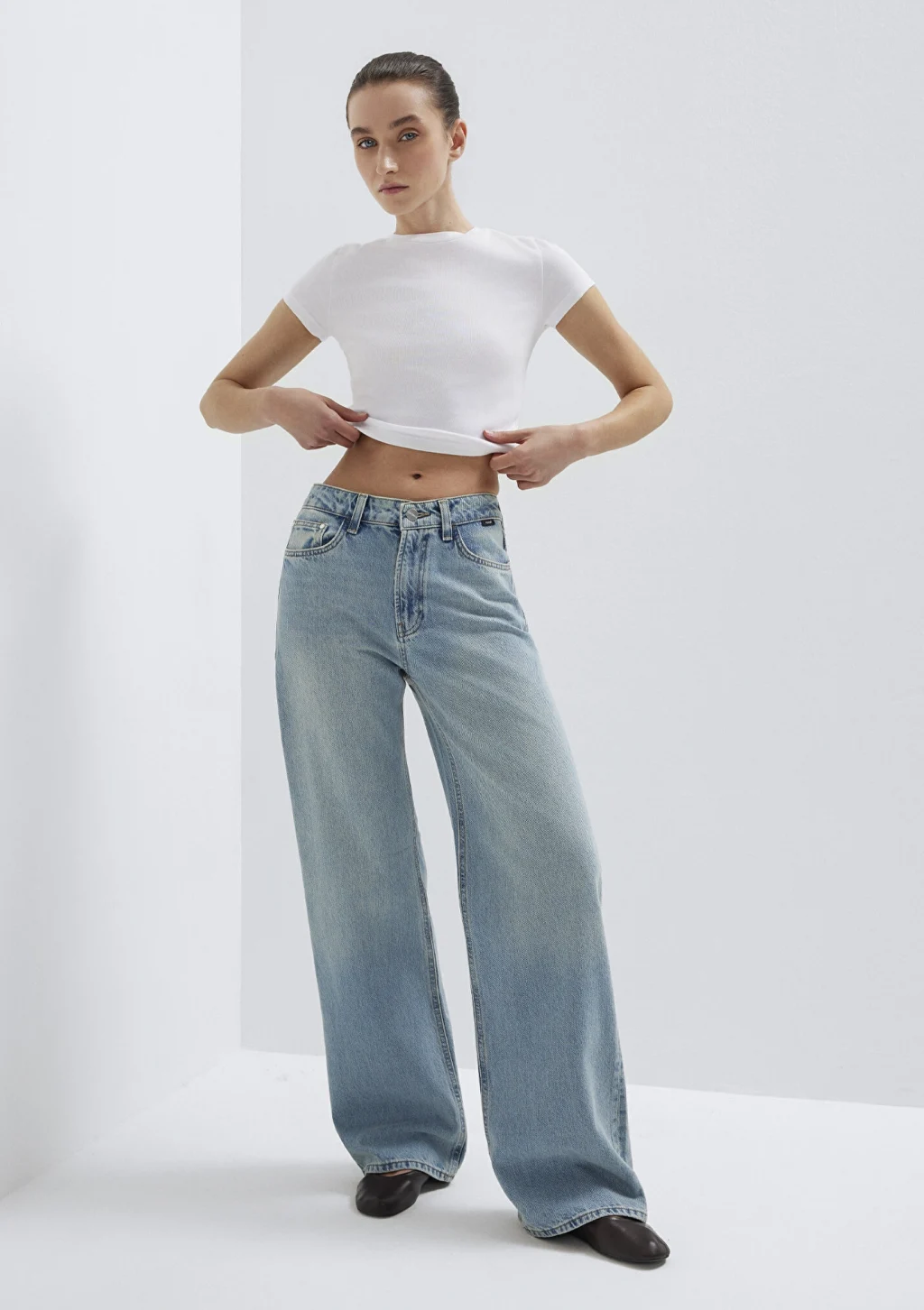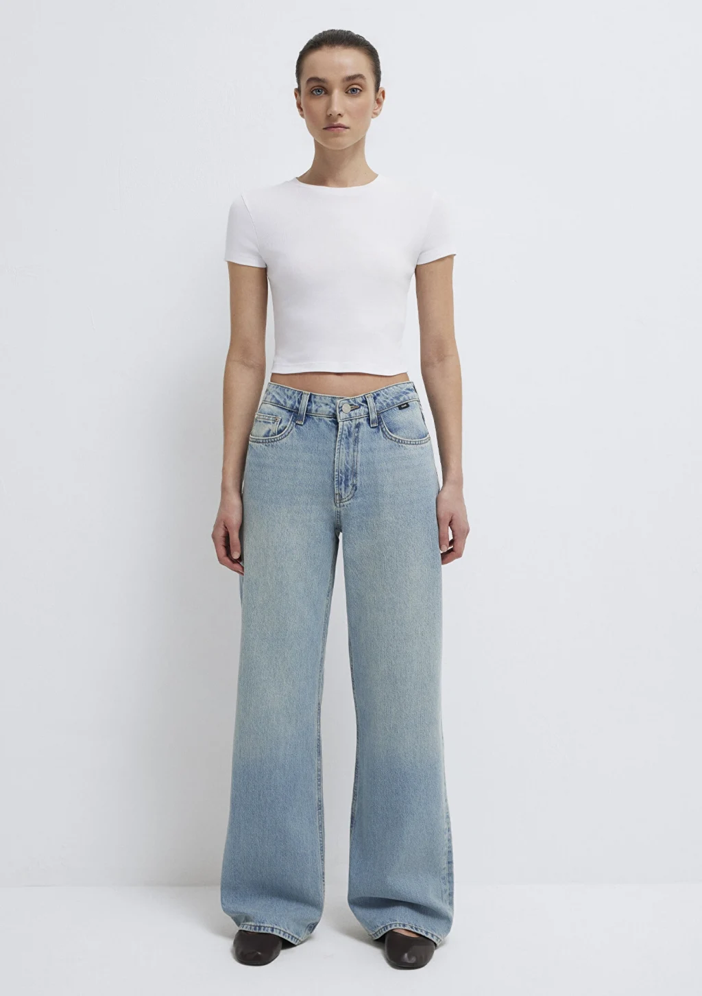 Mavi nin denim koleksiyonundan Malibu Iconic Puslu Açık Mavi. Bel ve basene oturan, basenden sonra açılarak genişleyen Wide Leg Jean. Geniş paça.