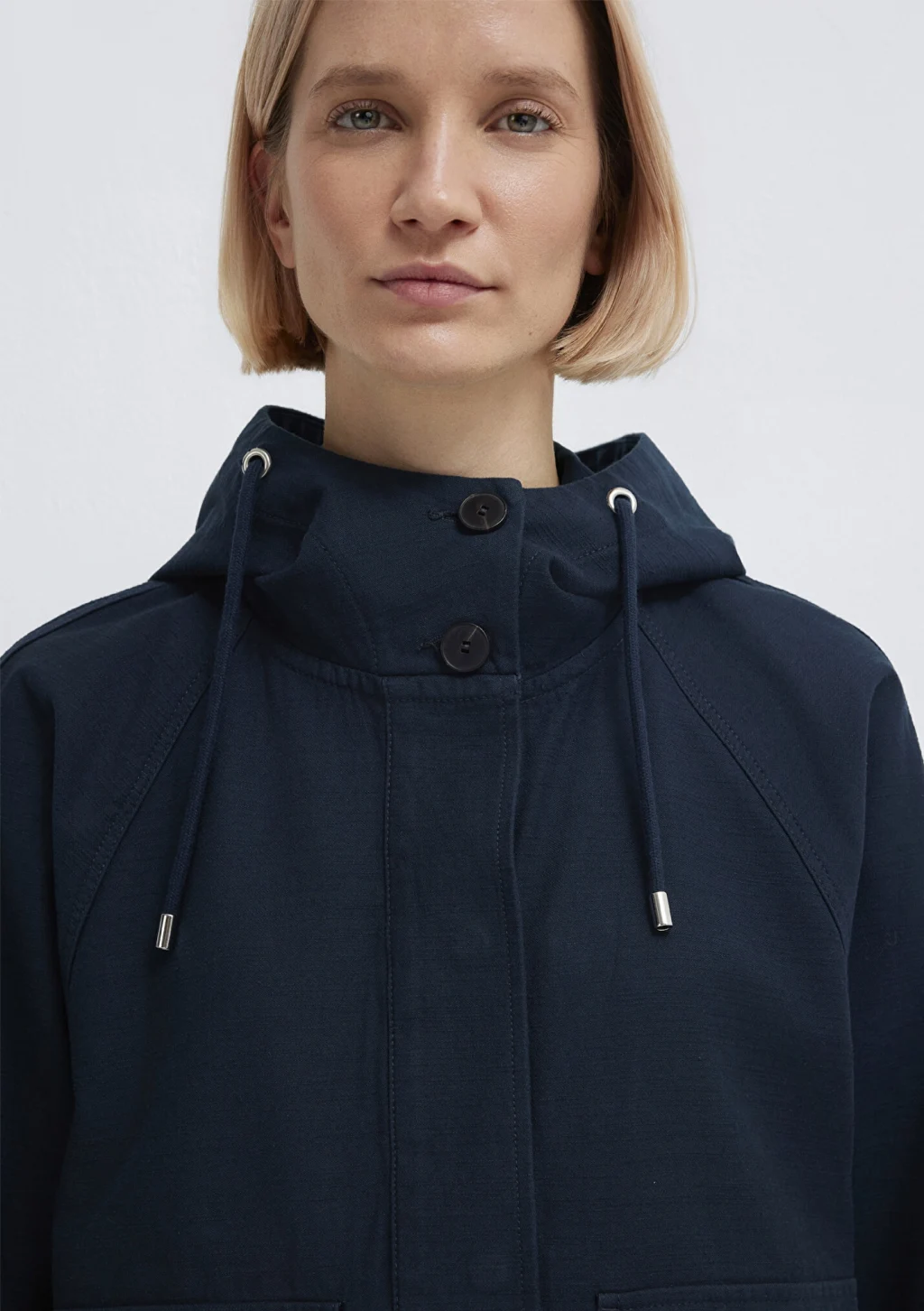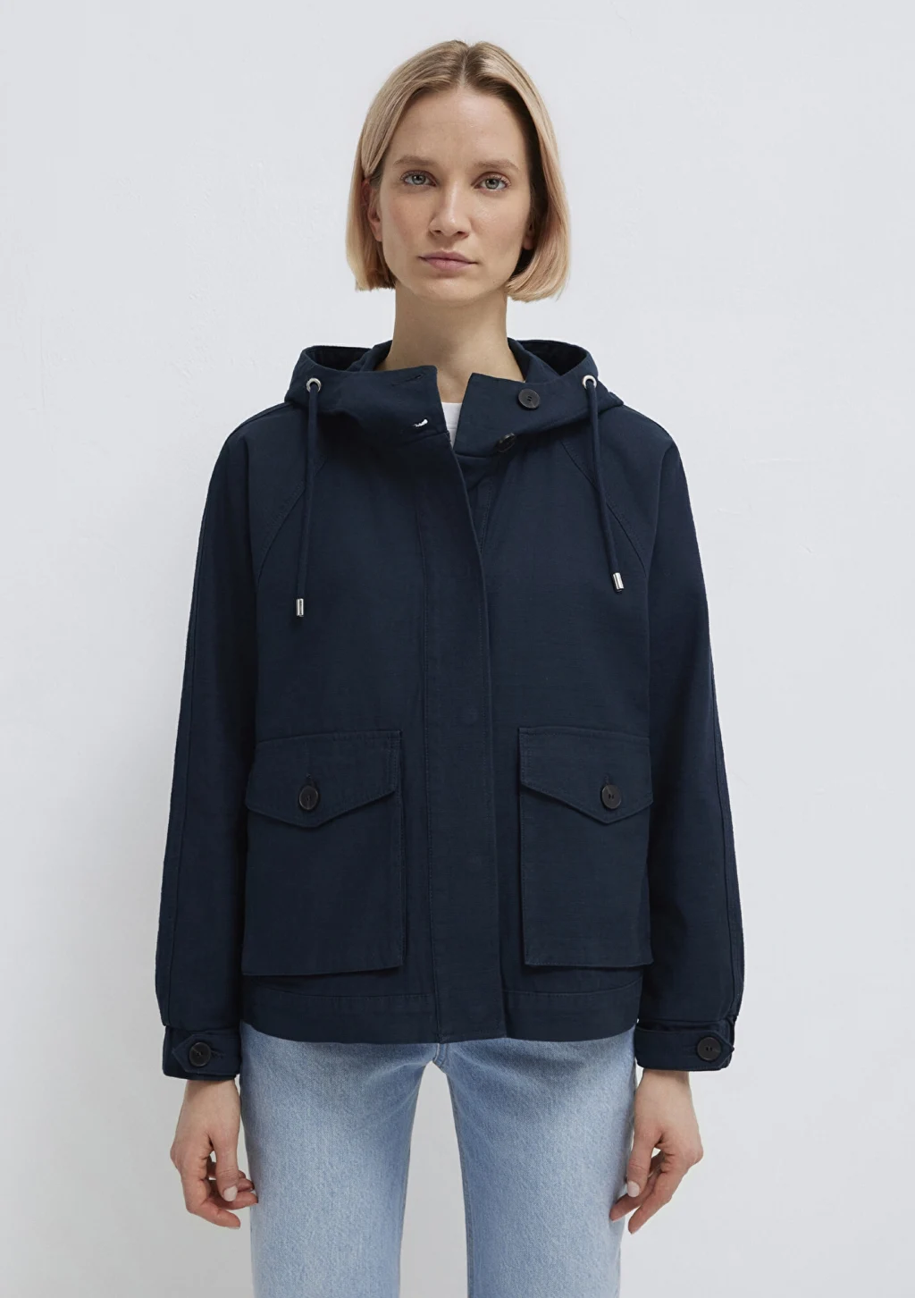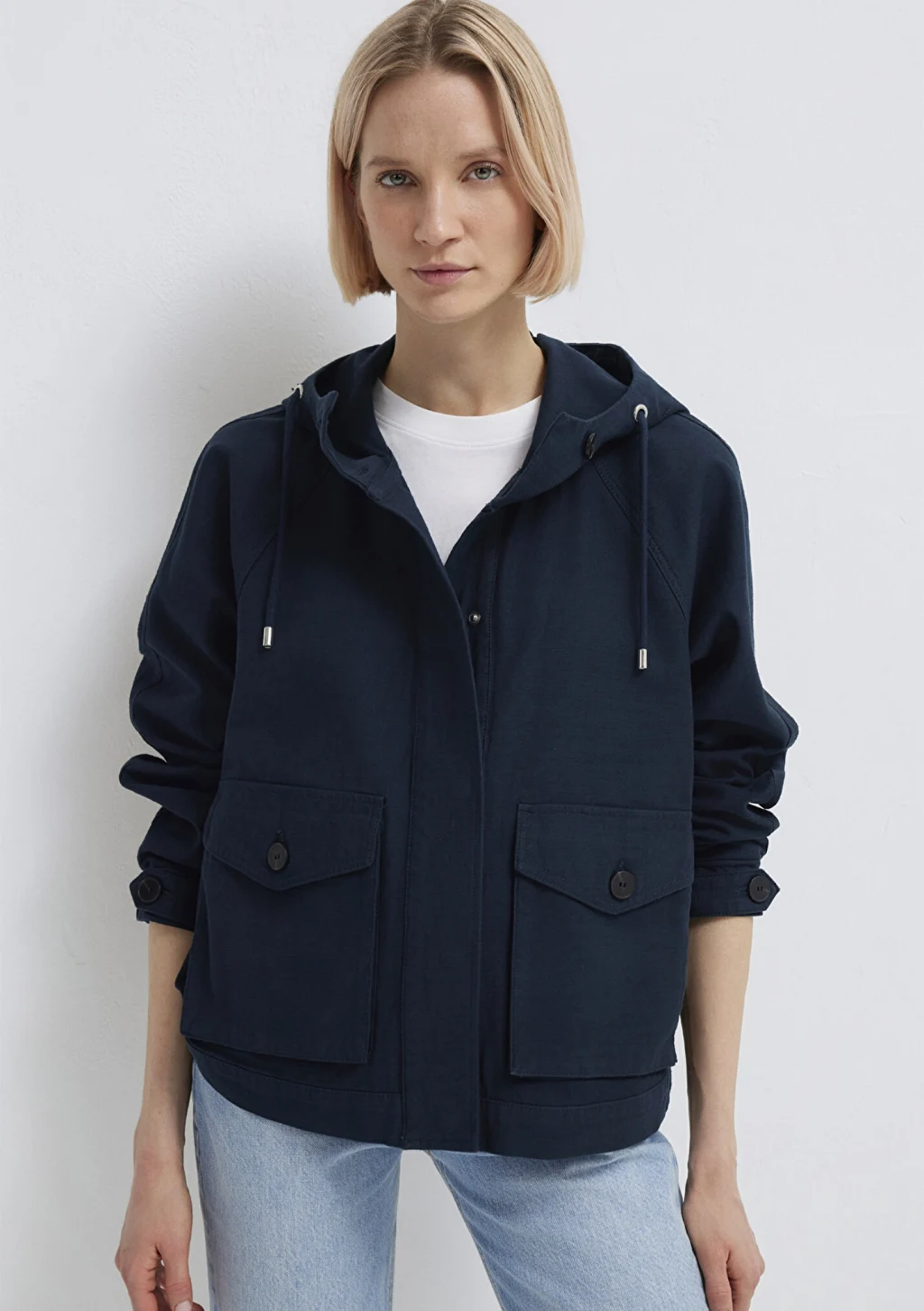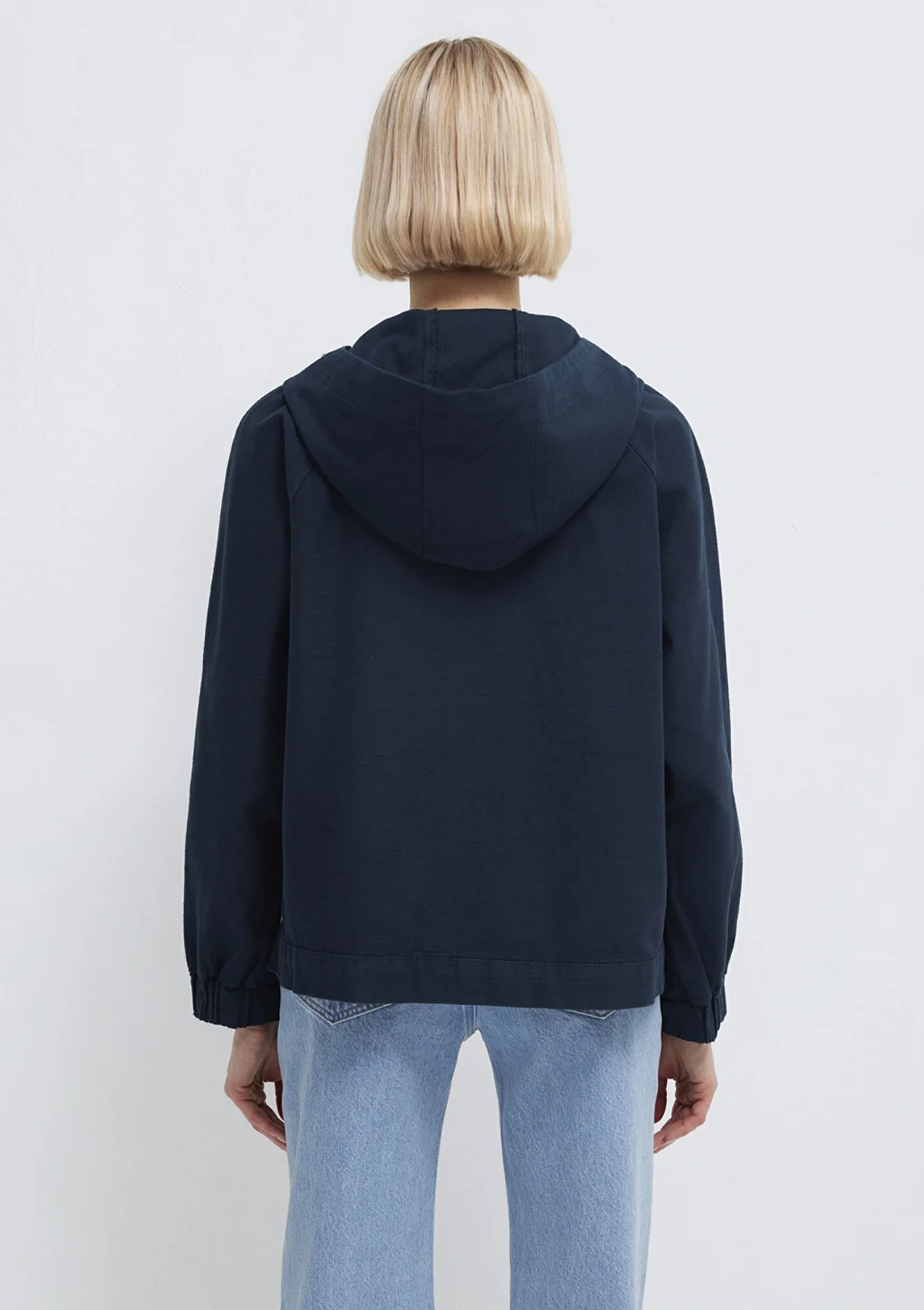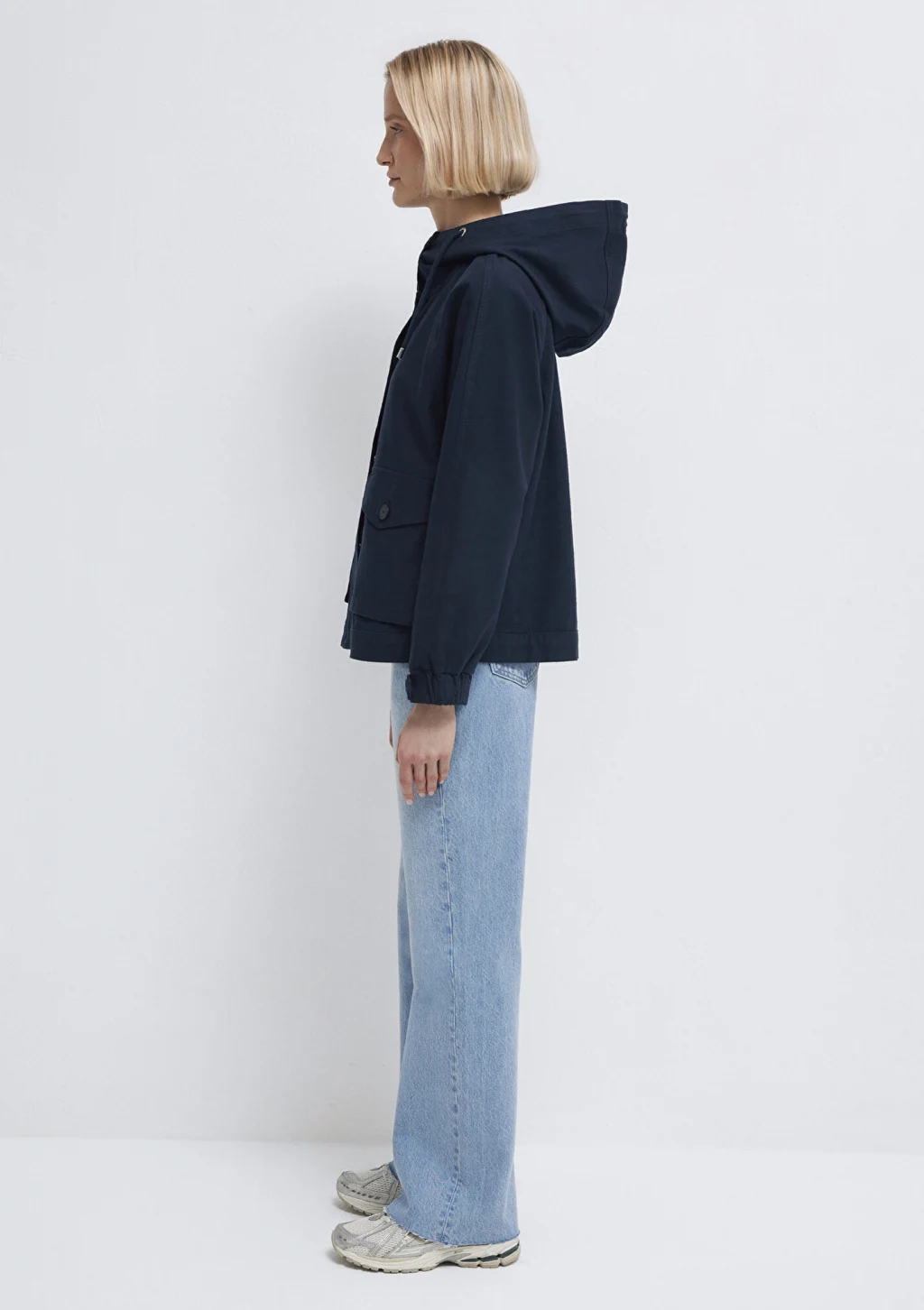 Mavi nin dış giyim koleksiyonundan Kapüşonlu Lacivert Kısa Ceket. İki adet düğmeli kapaklı ön cep, iple ayarlanabilir sabit kapüşon.