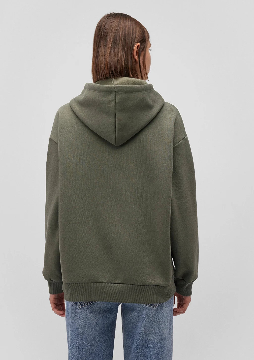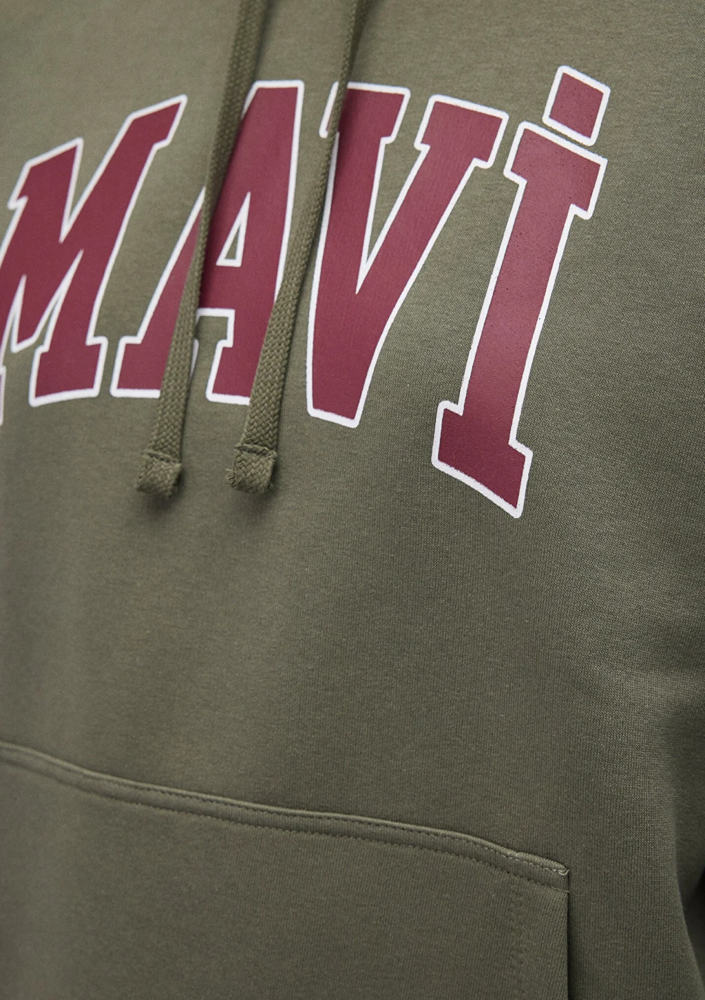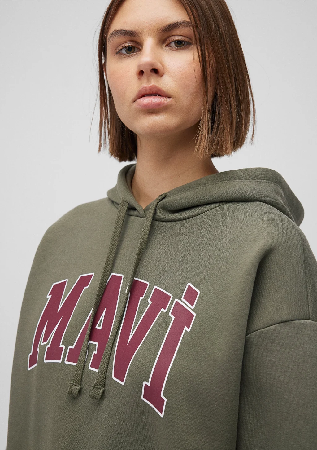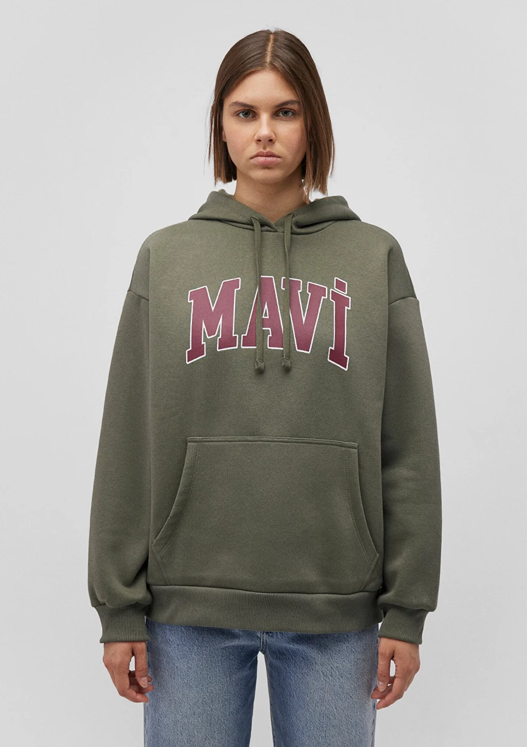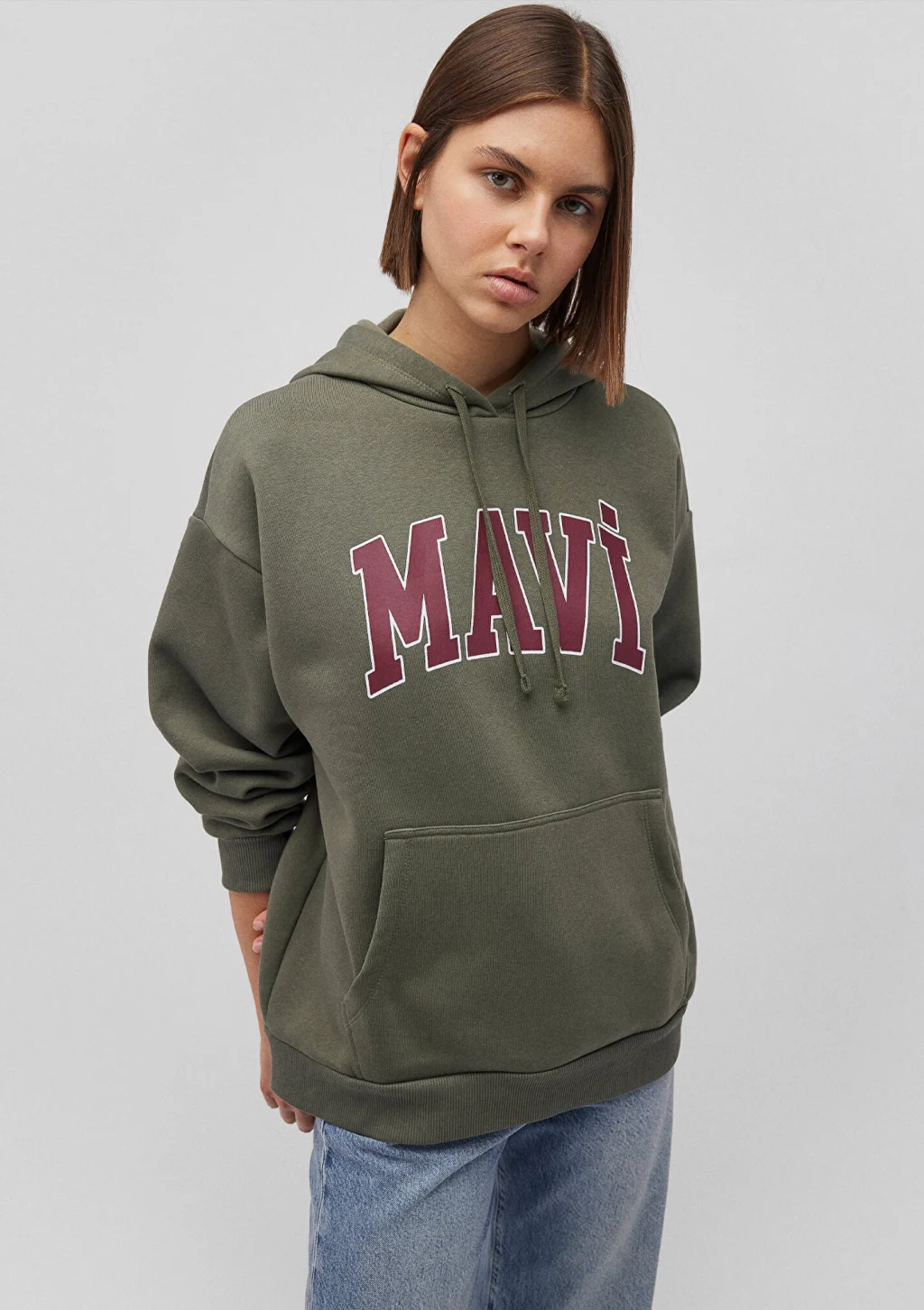 Mavi nin kadın koleksiyonundan Mavi Logo Baskılı Kapüşonlu Haki Sweatshirt. Şardonlu, iple ayarlanabilir kapüşon, içi şardonlu kanguru cep.