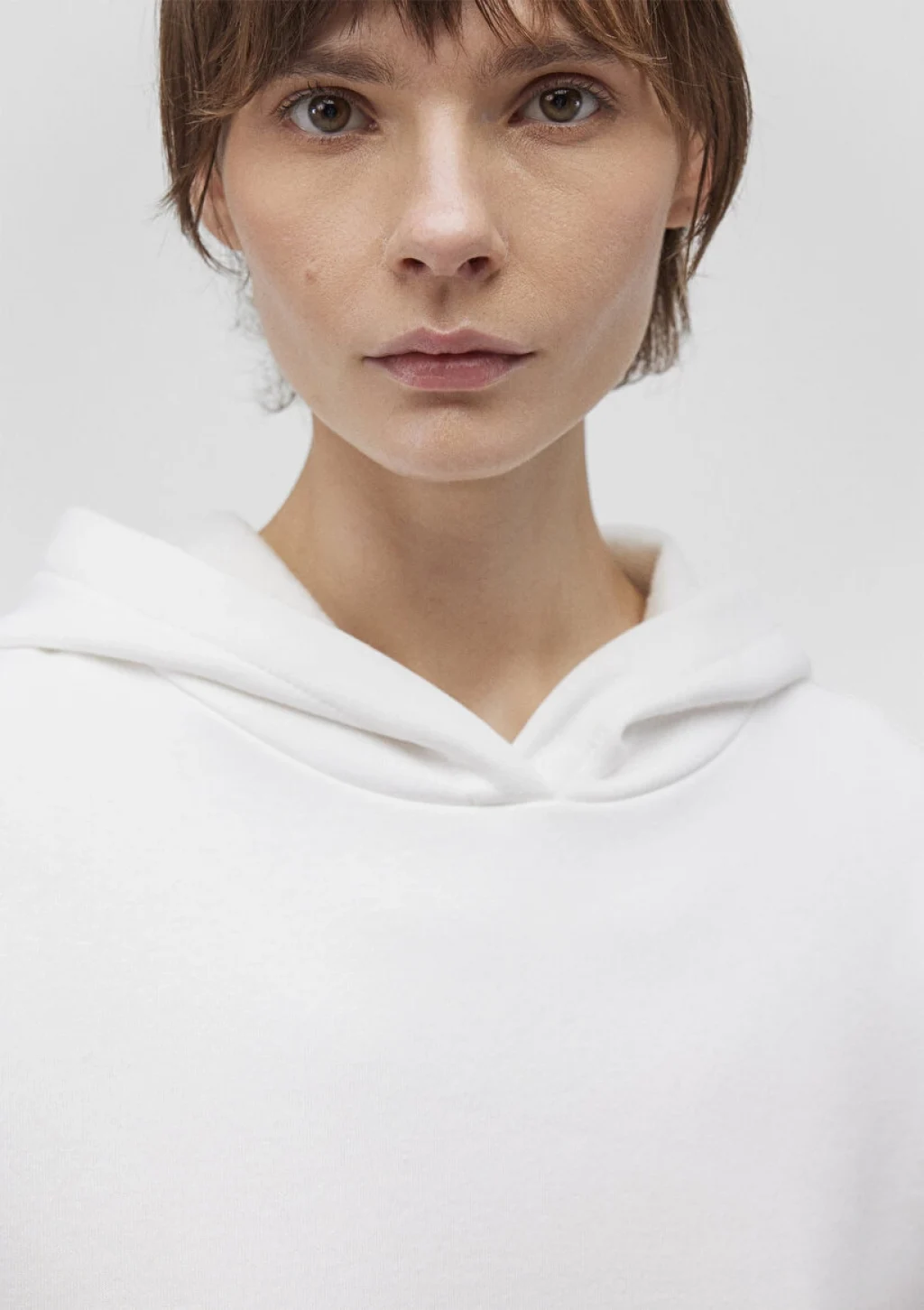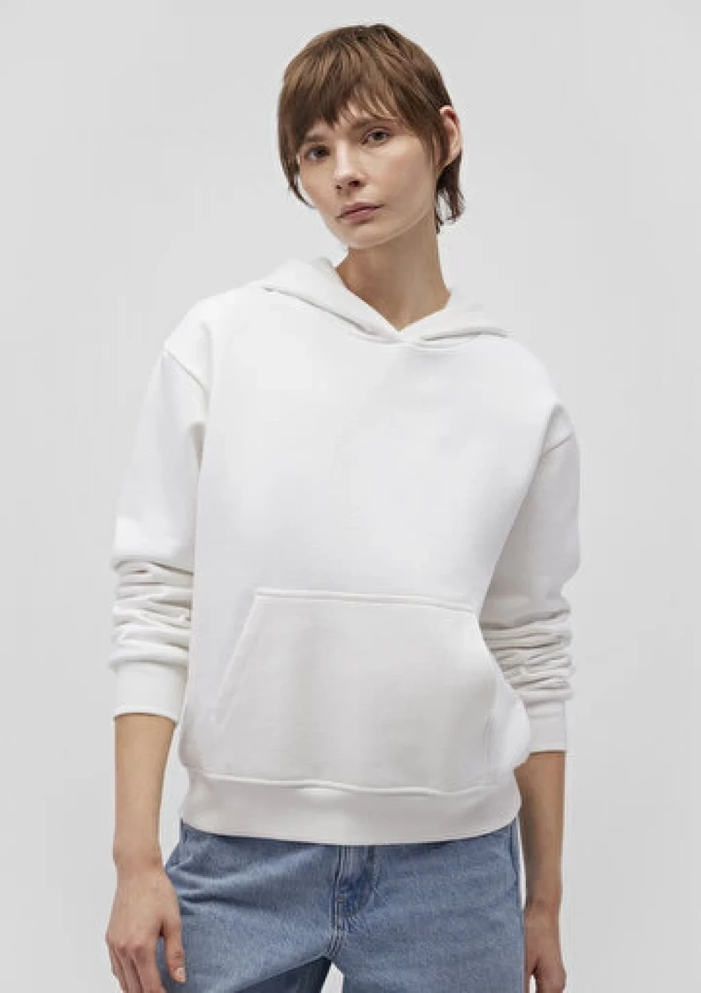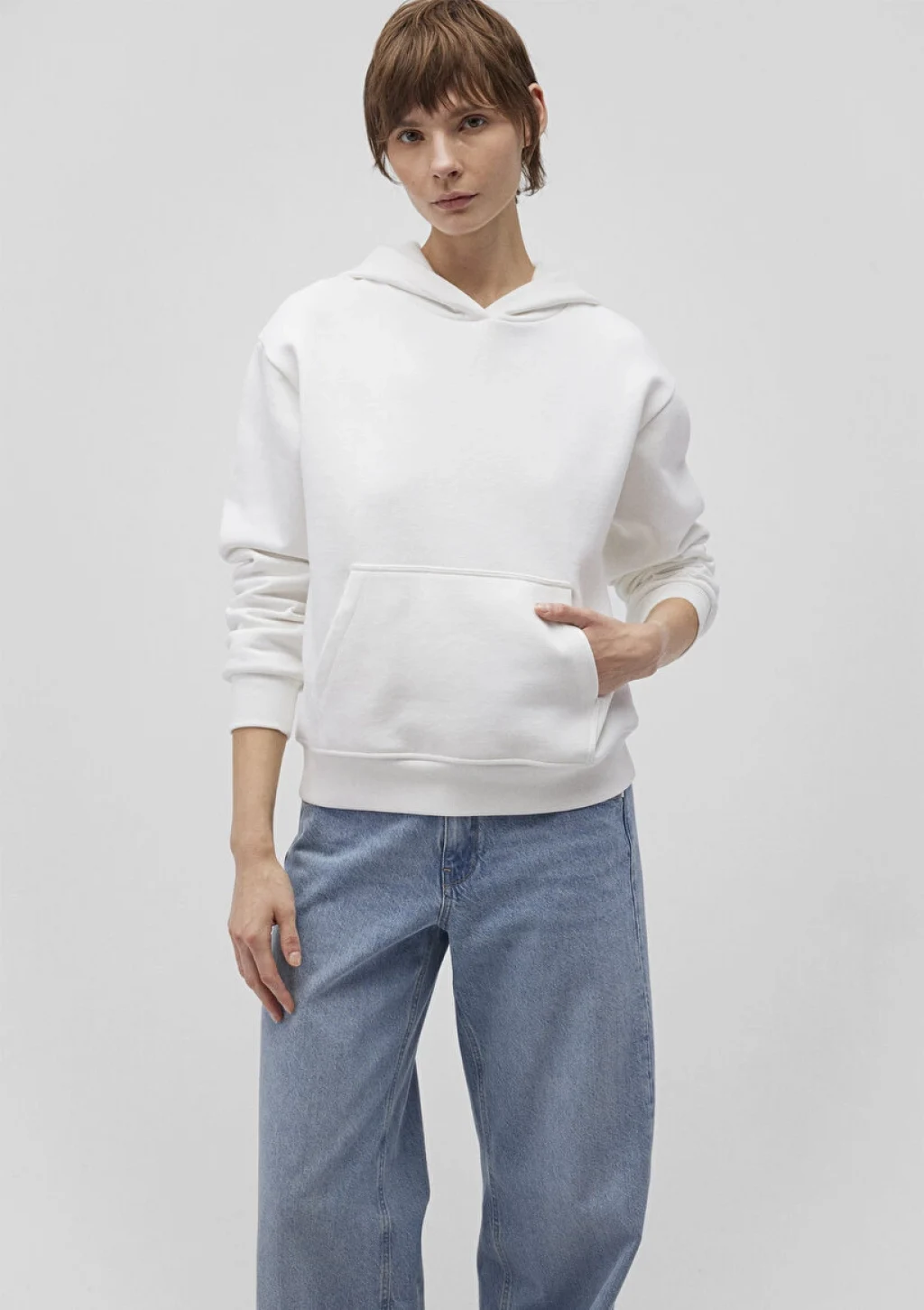 Mavi nin kadın koleksiyonundan Kapüşonlu Beyaz Basic Sweatshirt. Ürün özellikleri, şardonlu, kanguru cepli, kapüşonlu, cep içi şardonlu.