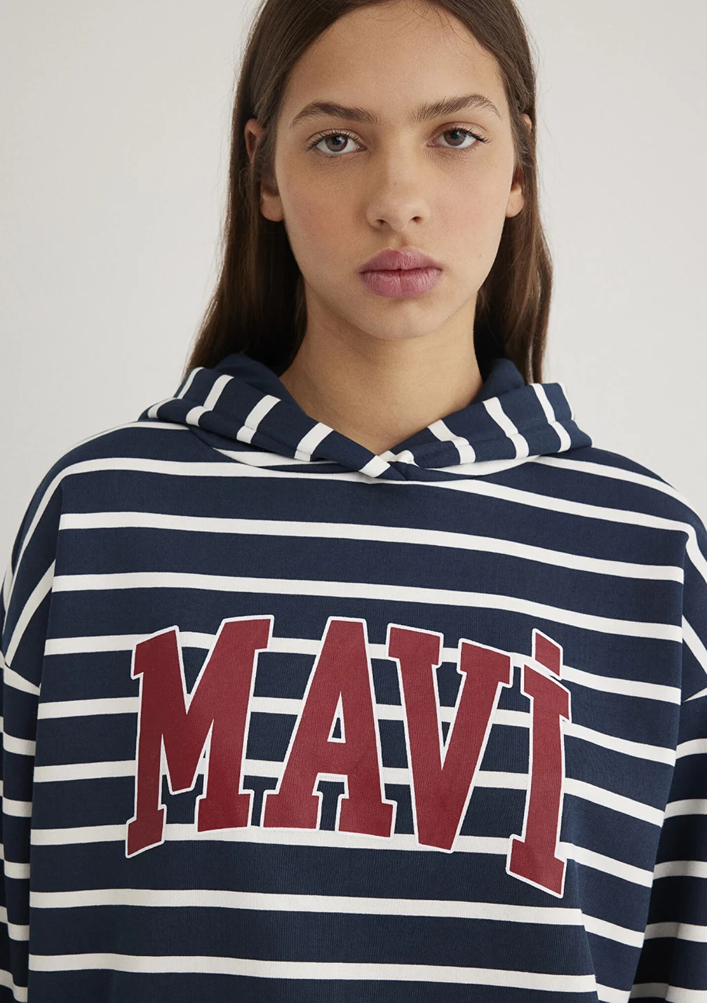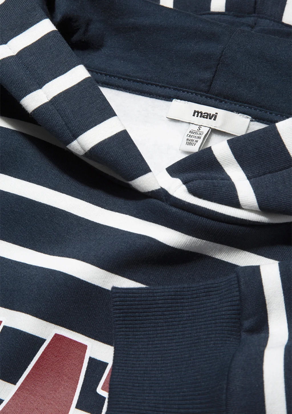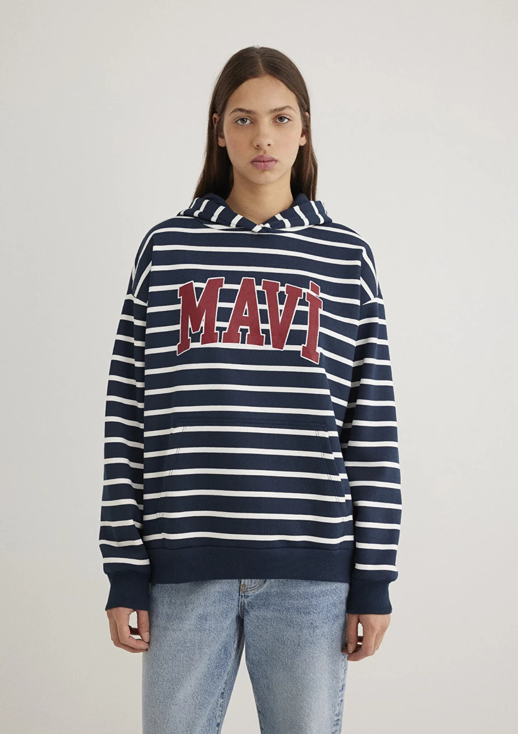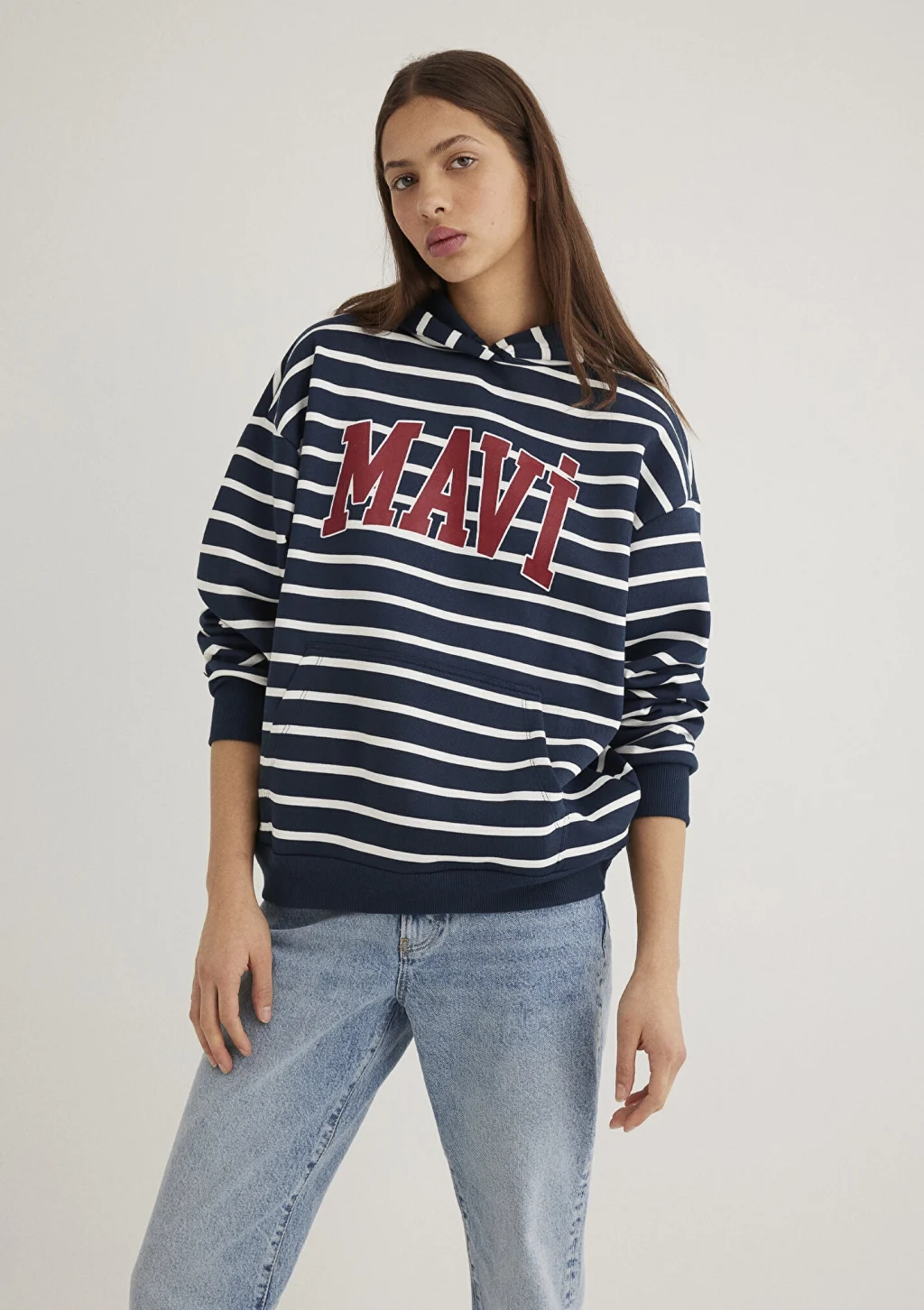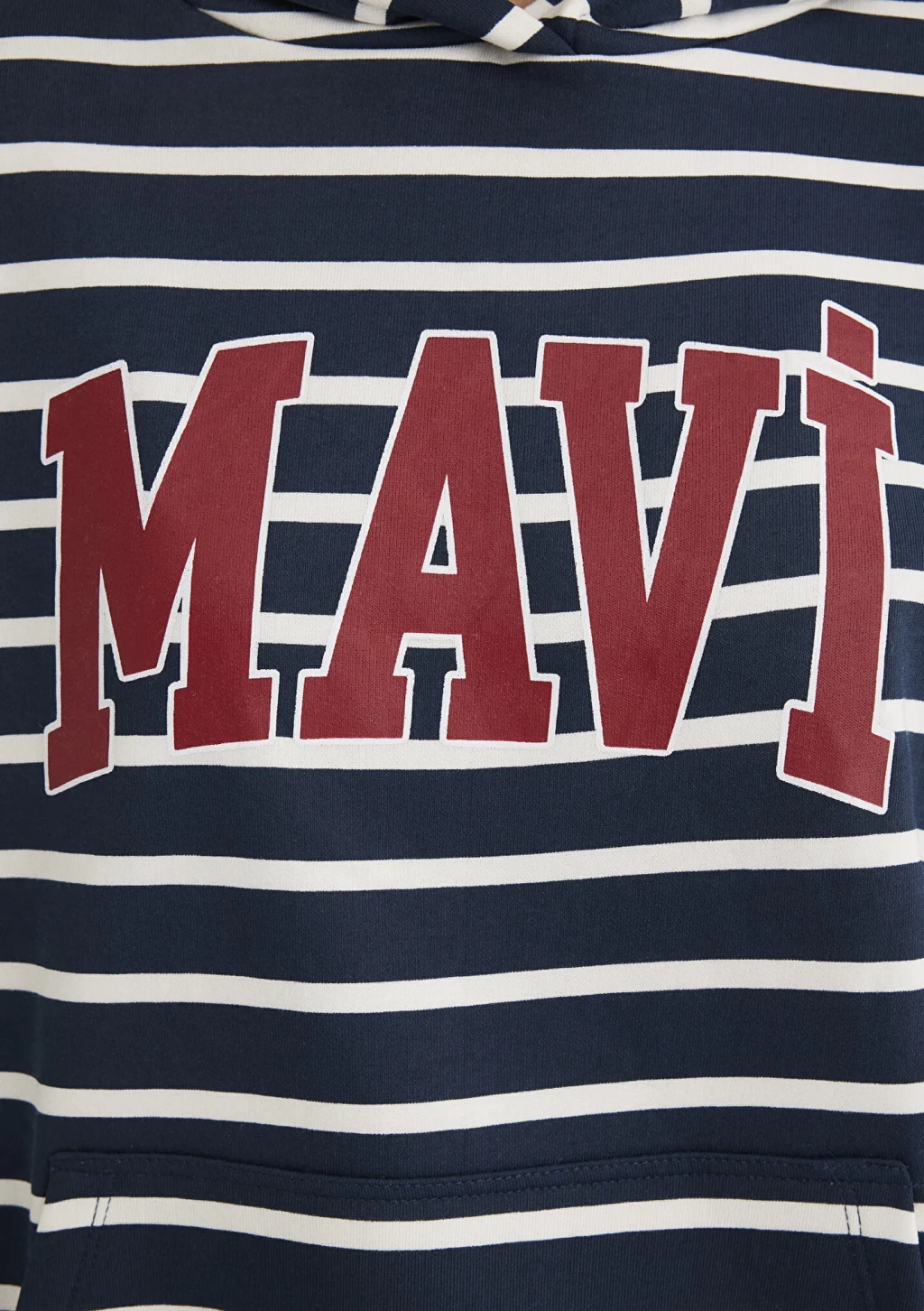 Mavi nin kadın koleksiyonundan Mavi Logo Baskılı Lacivert Çizgili Sweatshirt. Şardonlu, kapüşonlu, içi şardonlu kanguru cep.