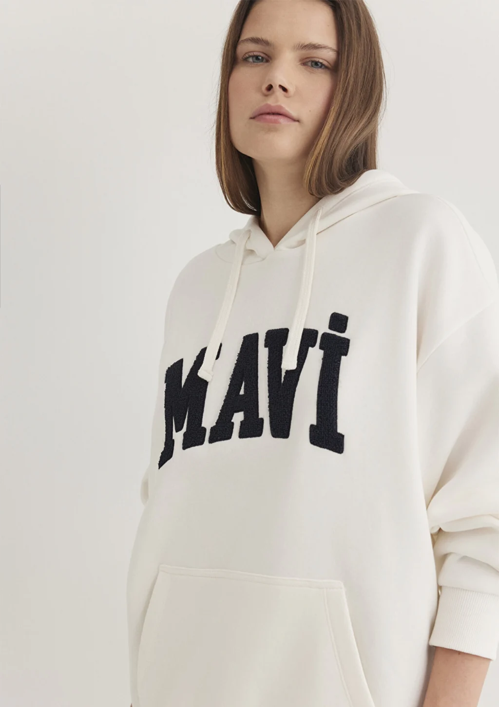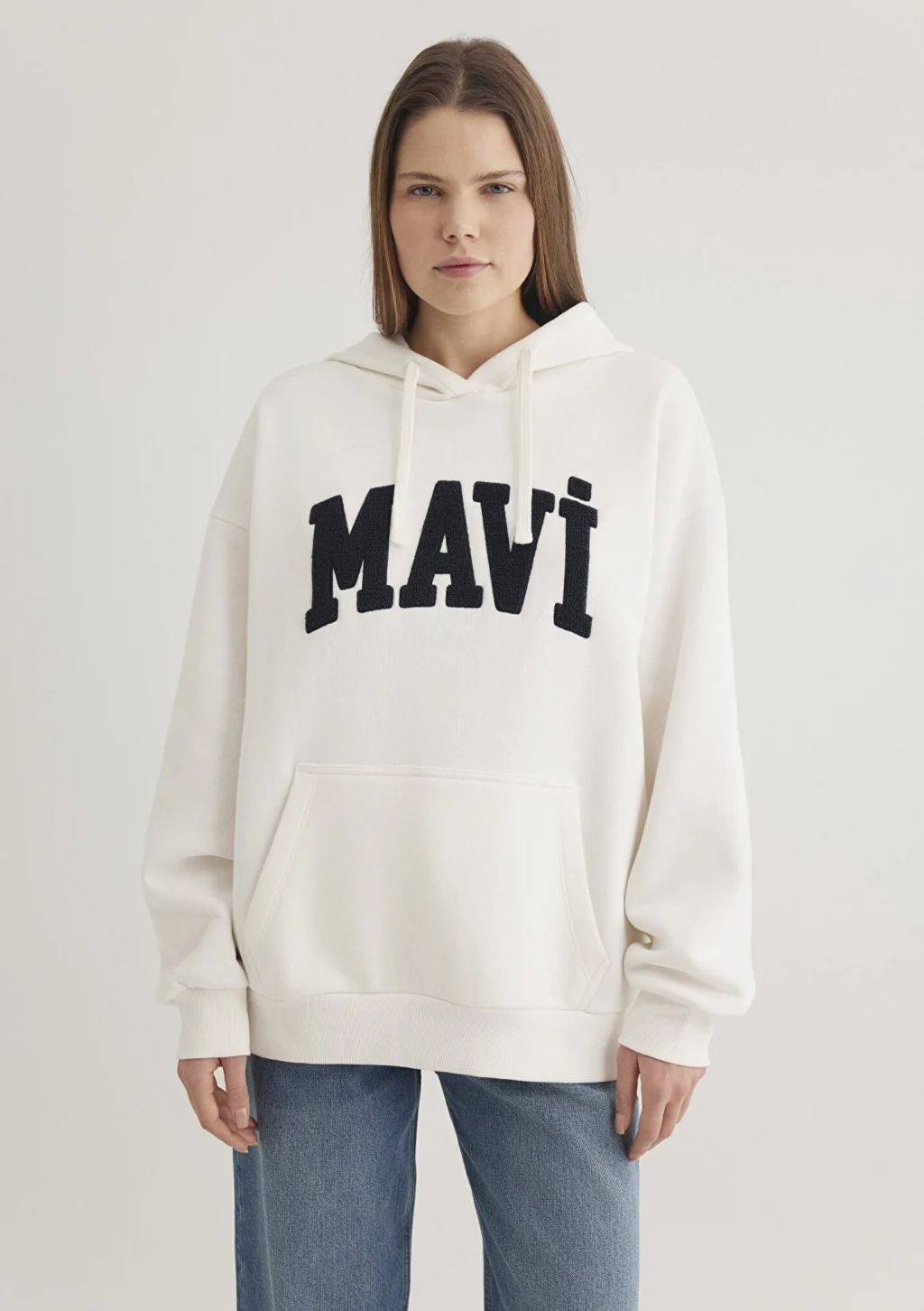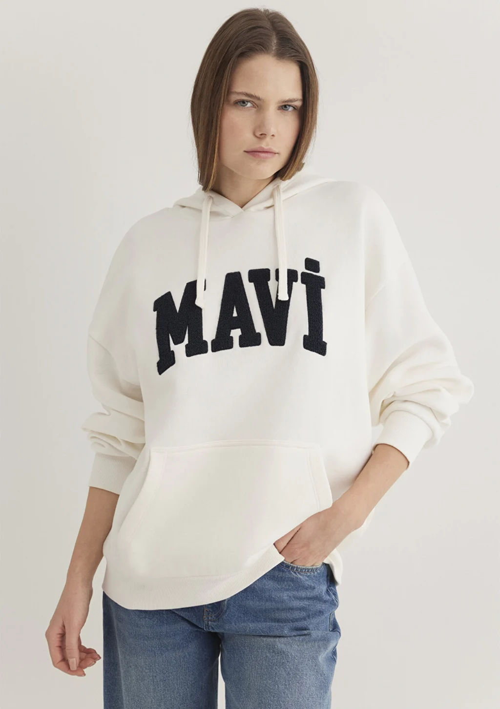 Mavi nin kadın koleksiyonundan Mavi Logo Patchli Beyaz Sweatshirt. Şardonlu, iple ayarlanabilir kapüşon, içi şardonlu kanguru cep.