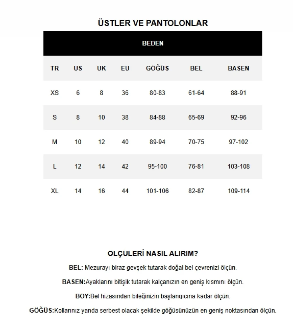 Boy: 182 cm / Bel: 63 cm / Göğüs: 81 cm / Kalça: 91 cm
