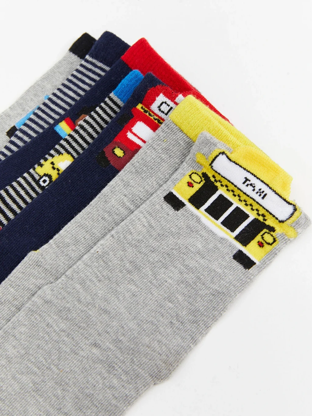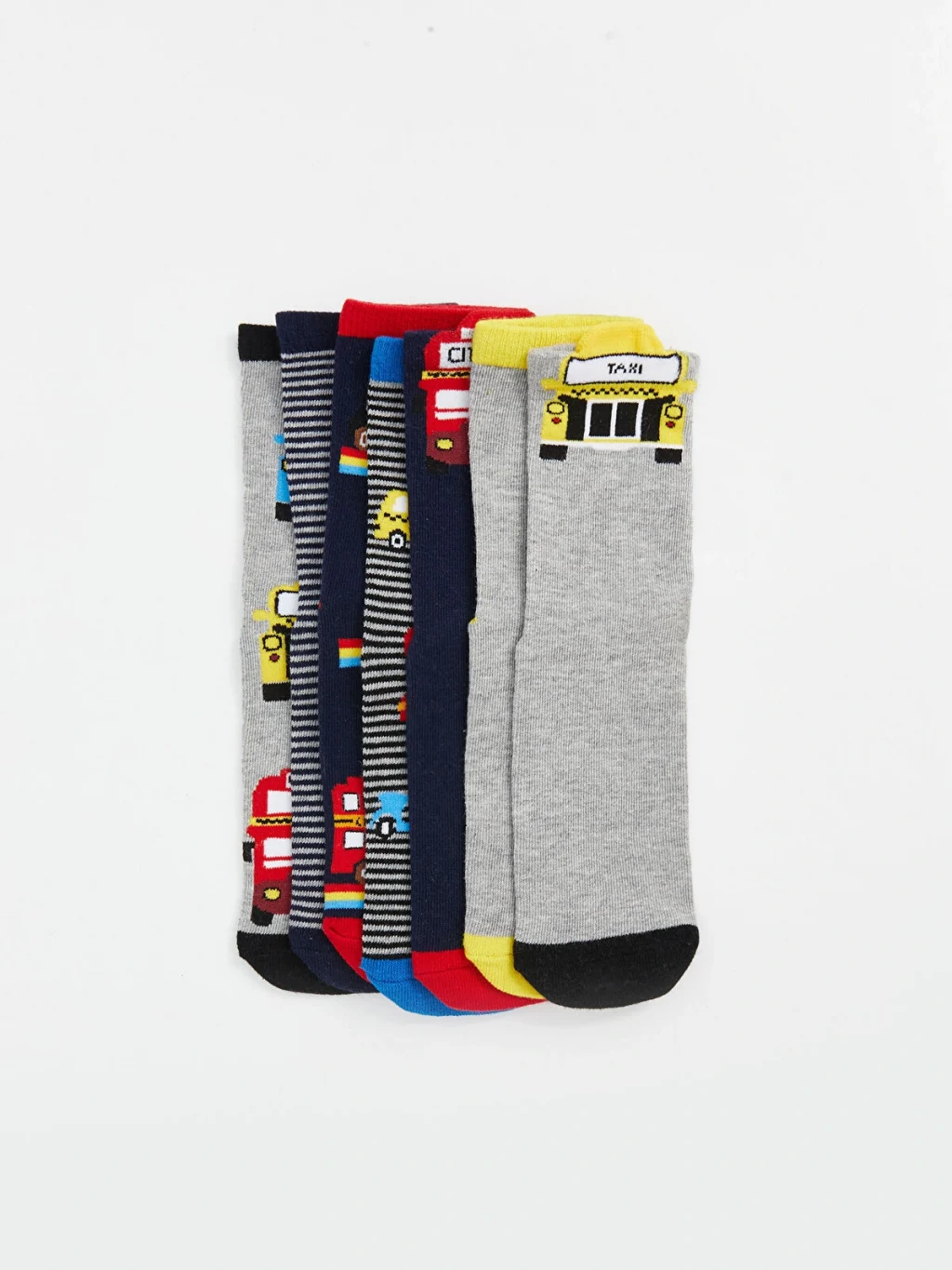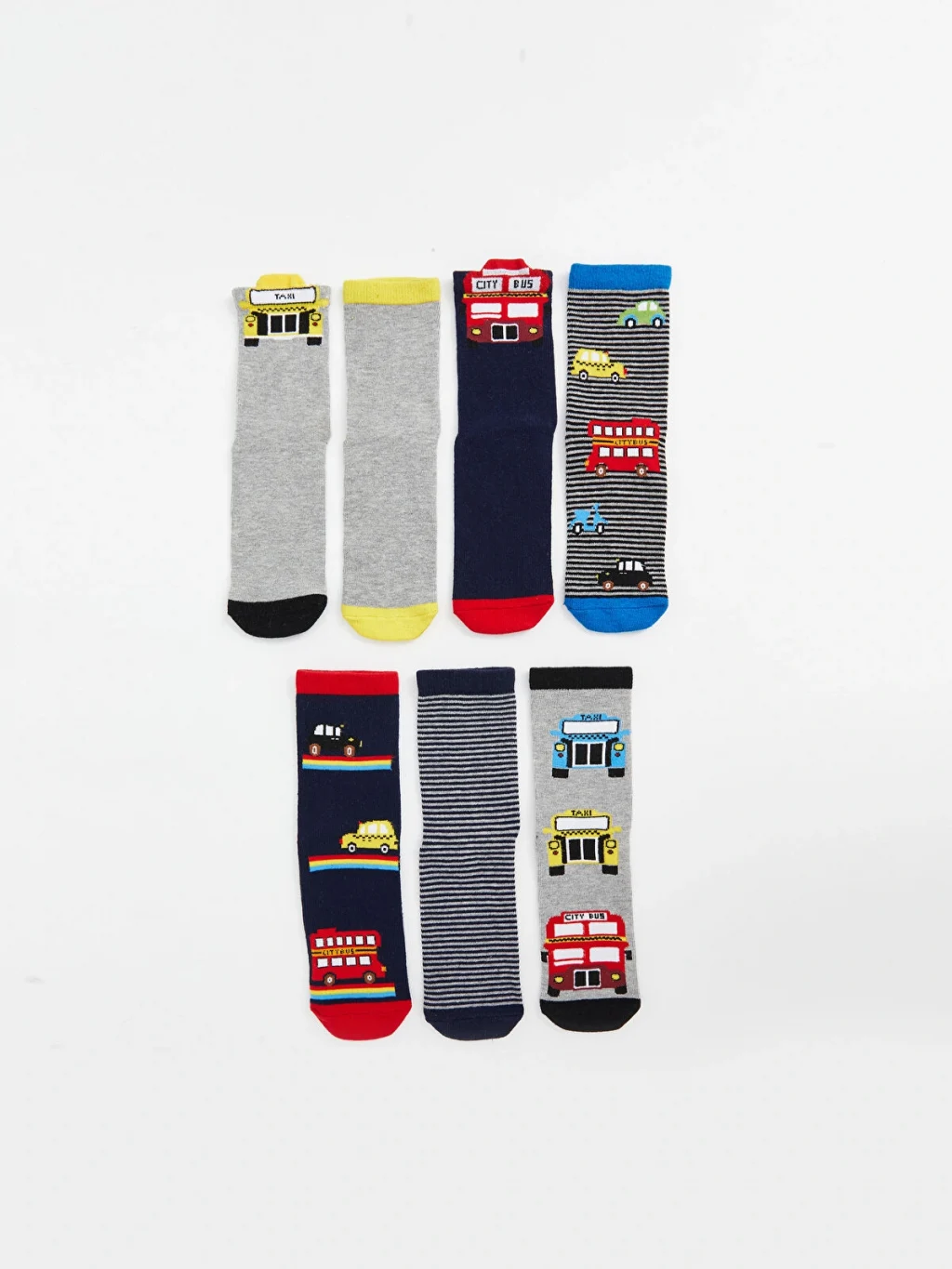 Erkek çocuk için 7 çiftten oluşan soket çorap seti, taşıt desenli ve çizgili farklı modellerden oluşur.