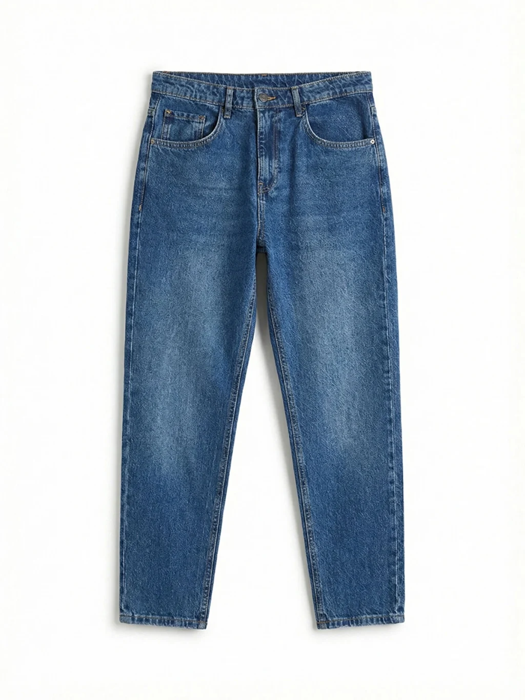 Bol kesimli erkek jean pantolon, pamuklu denim kumaştan üretilmiştir, beş cepli tasarıma sahip olup fermuar ve düğme kapamalıdır.