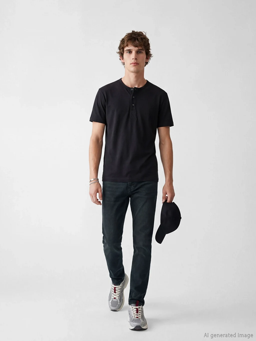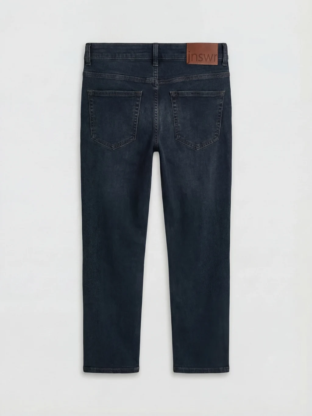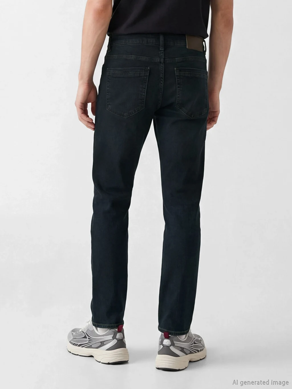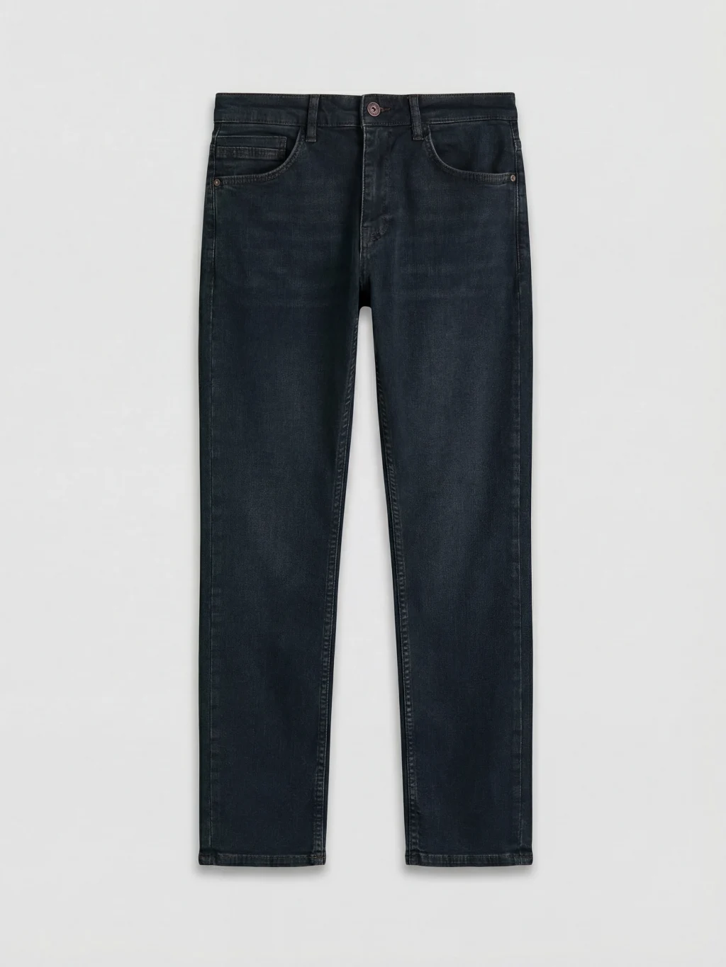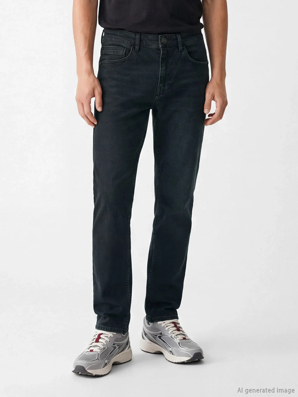 Dar kesimli erkek jean pantolon, beş cepli tasarıma sahiptir ve fermuar ve düğme kapamalıdır.