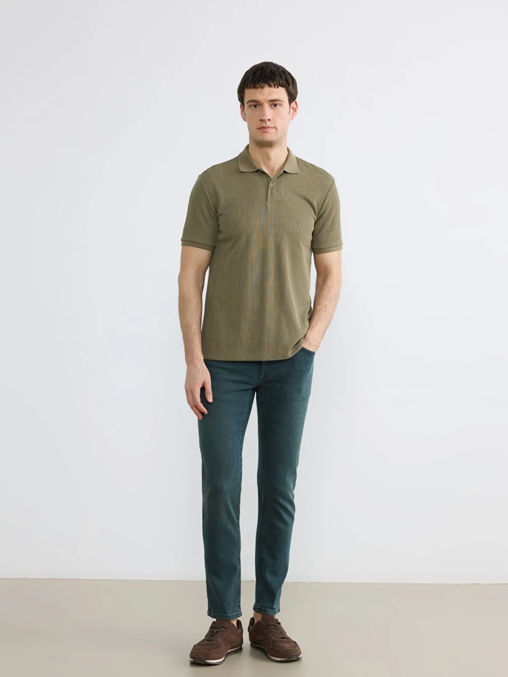 Dar kesimli erkek jean pantolon, pamuklu denim kumaştan üretilmiştir. Beş cepli tasarıma sahiptir ve fermuar ile düğme kapamalıdır.