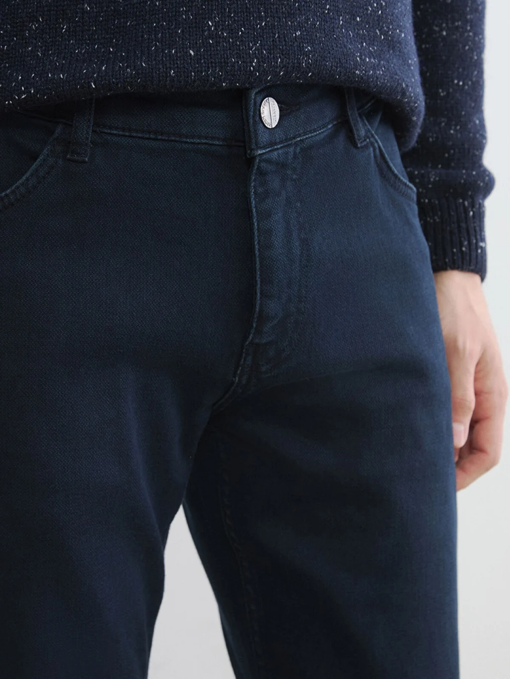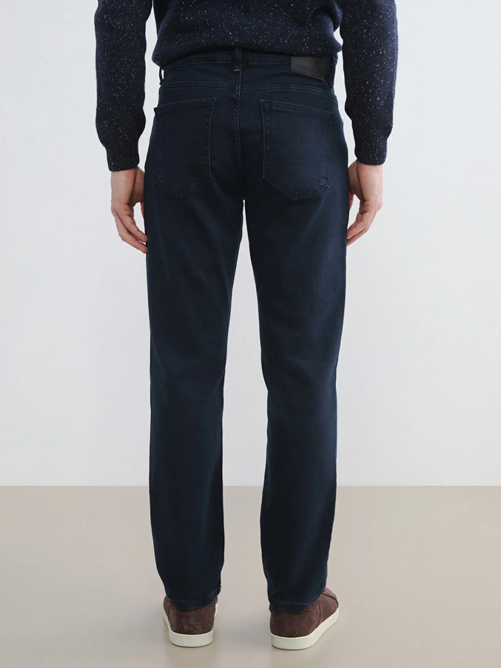 Standart kalıp erkek jean pantolon, Pamuk içerikli esnek denim kumaştan üretilmiştir. Beş cepli tasarıma sahip olup fermuar ve düğme kapamalıdır.
