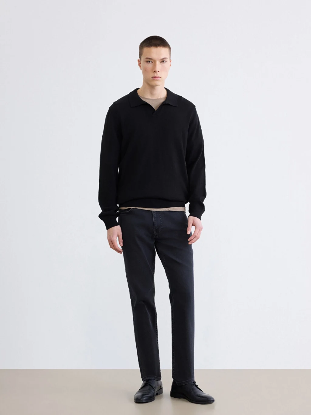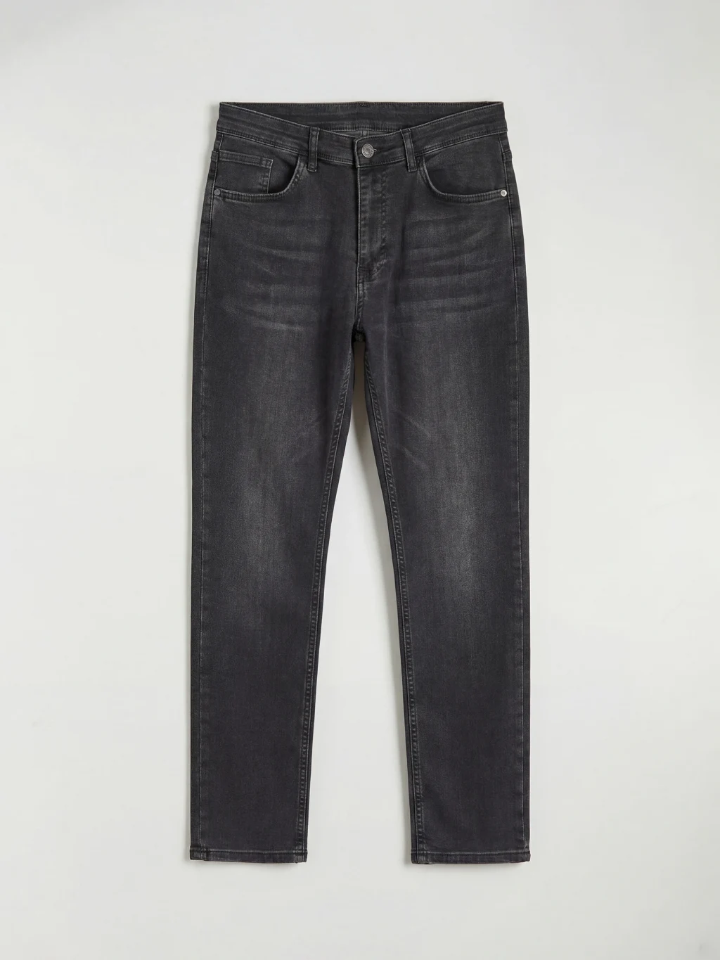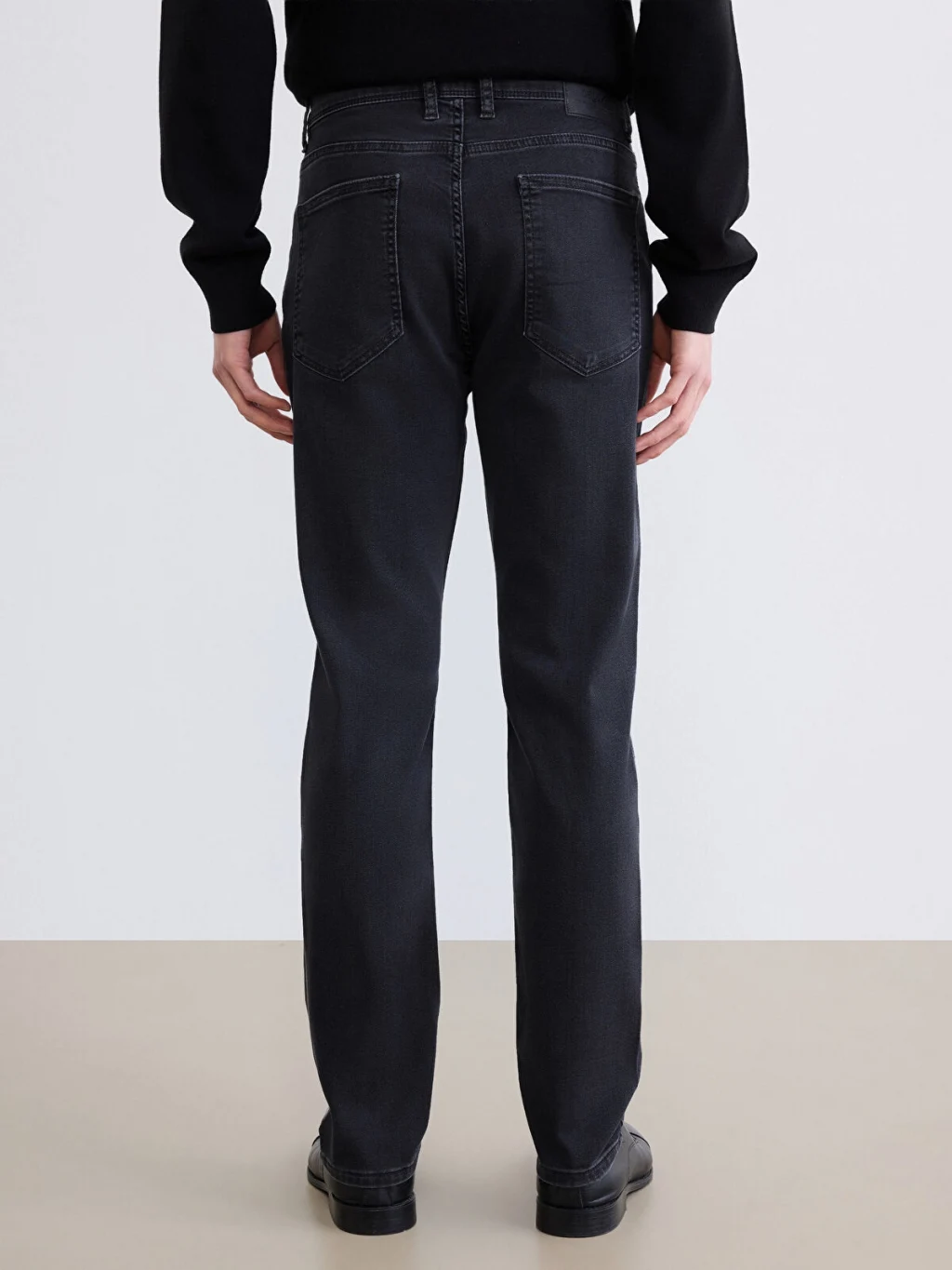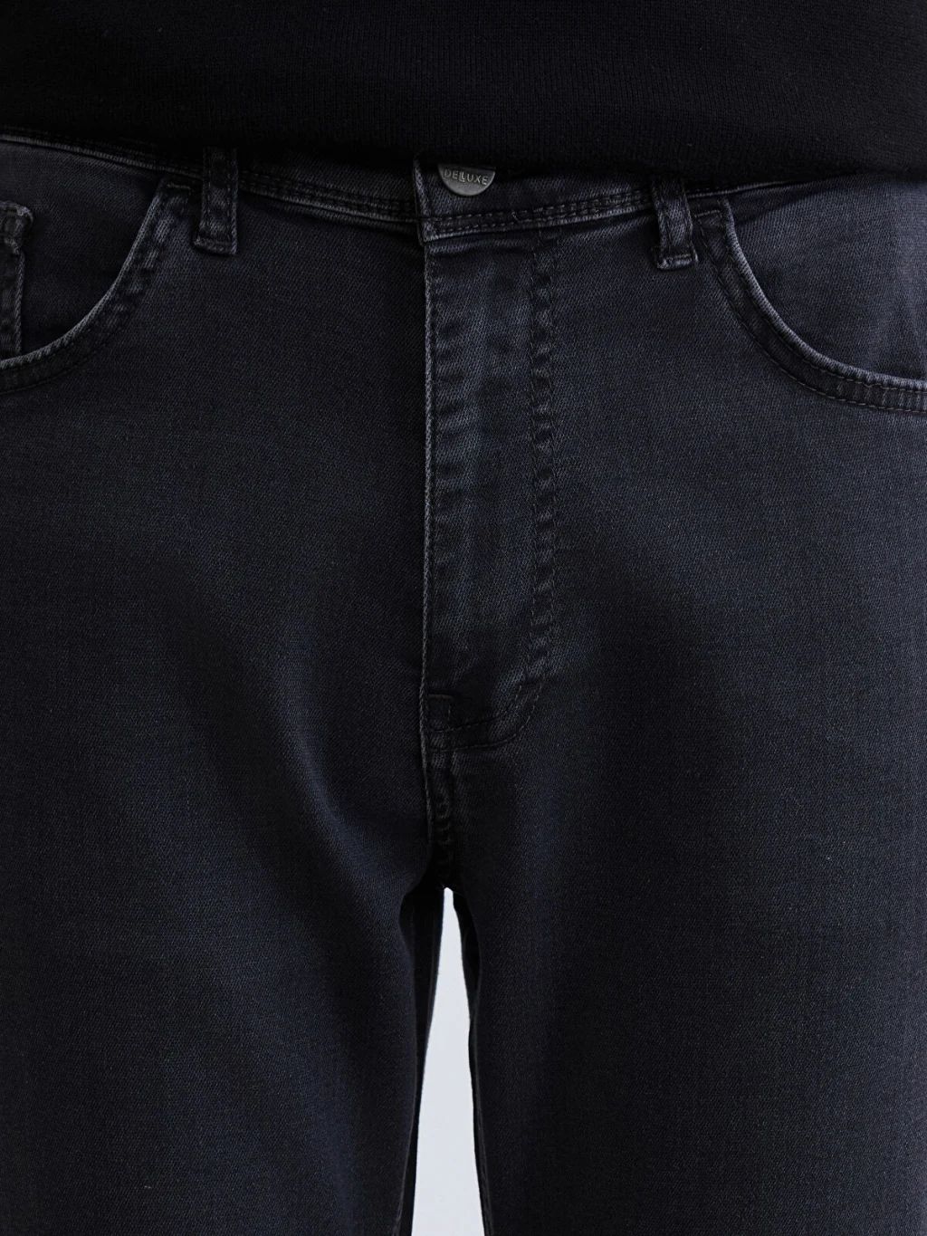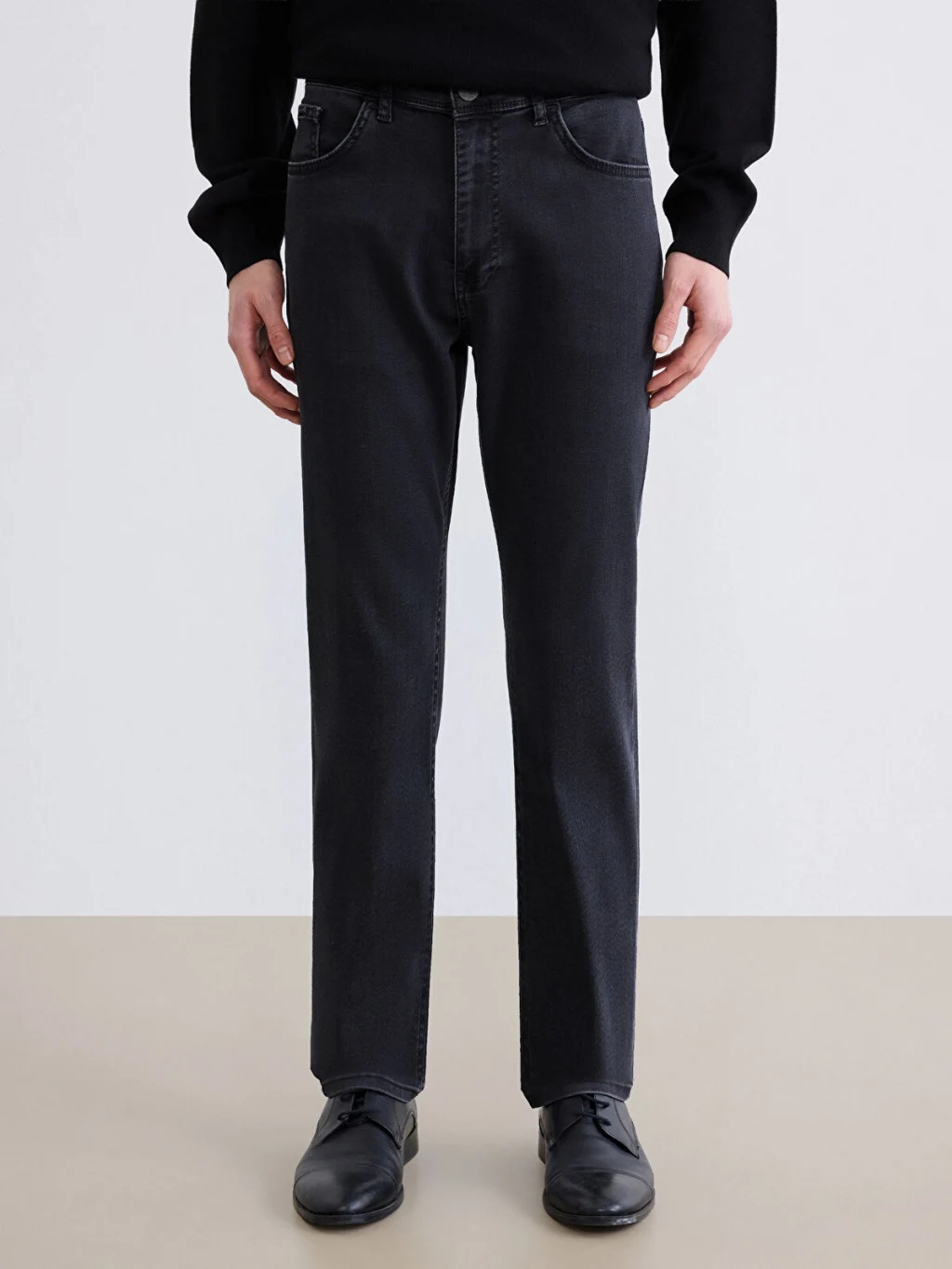 Standart kalıp erkek jean pantolon, beş cepli tasarıma sahiptir ve fermuar ile düğme kapamalıdır.
