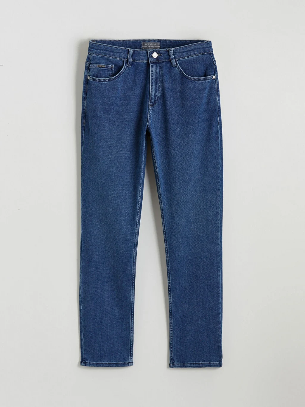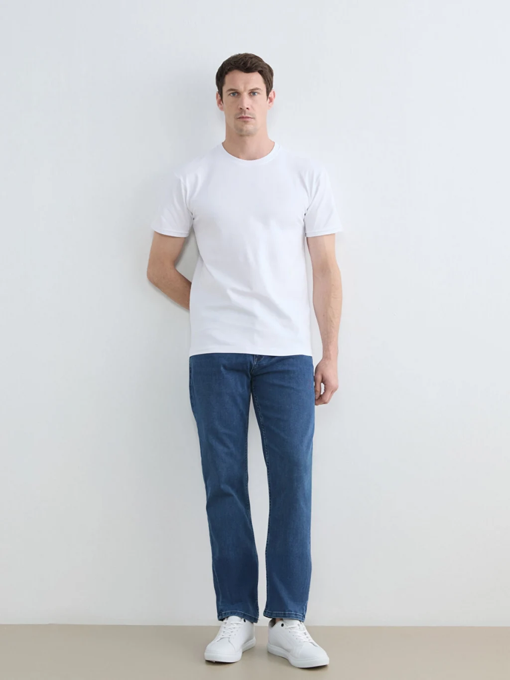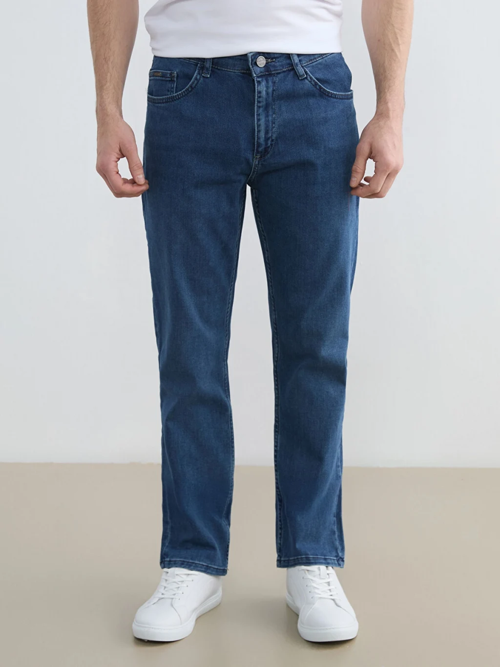 Beş cepli tasarıma sahip, fermuar ve düğme kapamalı erkek jean pantolon, %100 Pamuk kumaştan üretilmiştir.