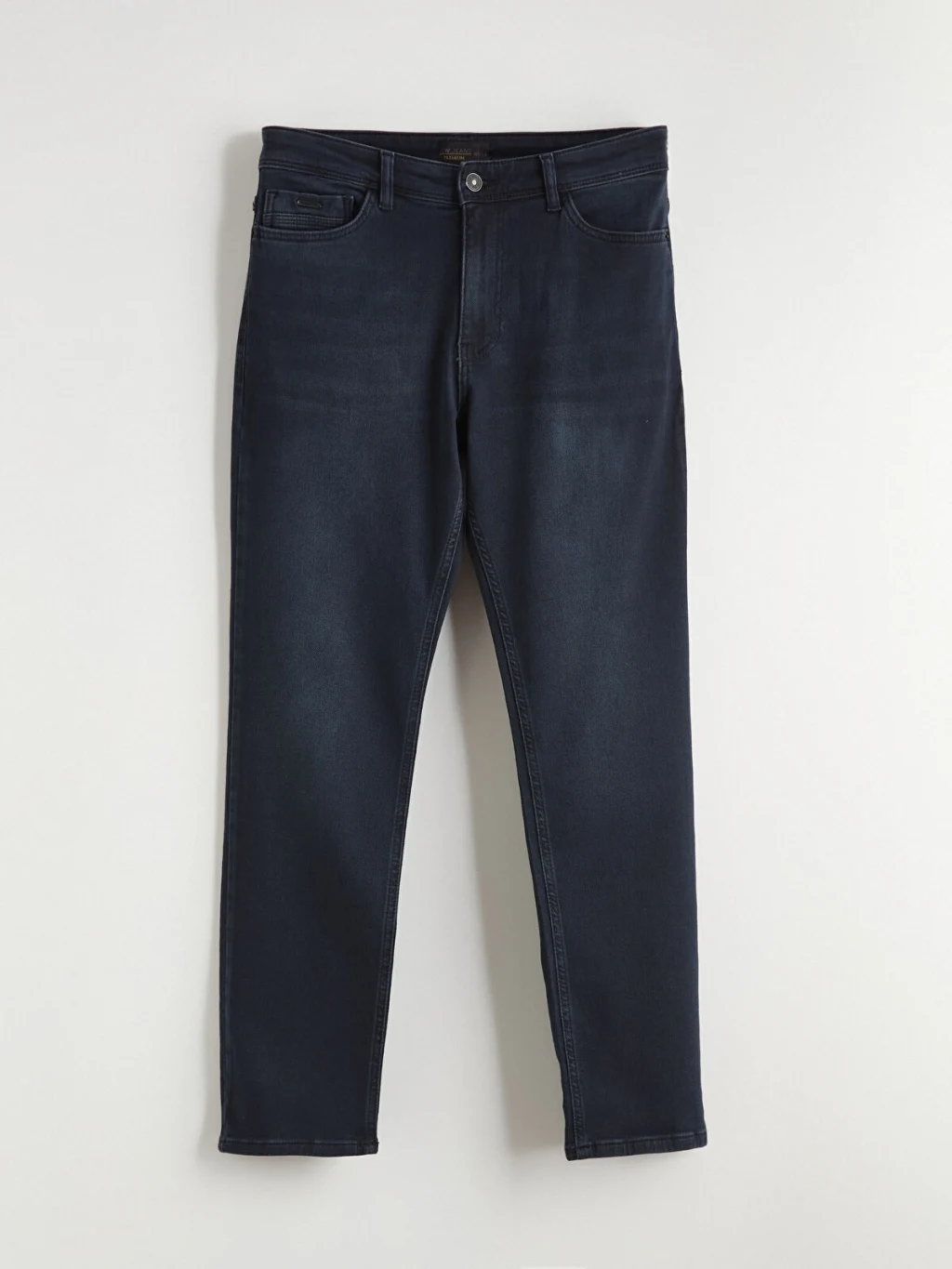 Standart kalıp erkek jean pantolon, %100 Pamuk içeriğe sahiptir. Beş cepli tasarıma sahip olup fermuar ve düğme kapamalıdır.