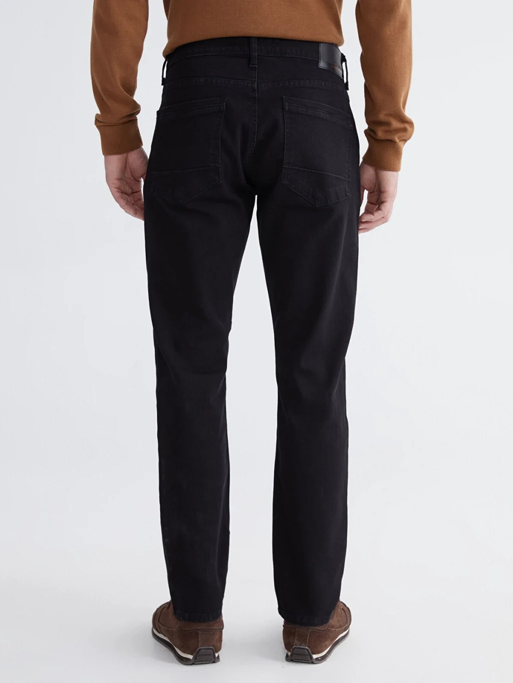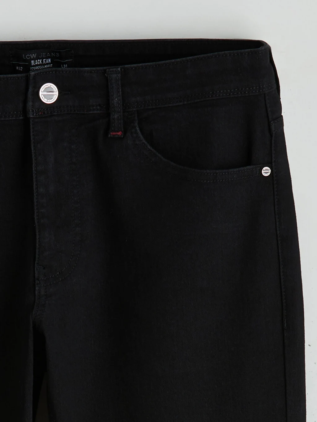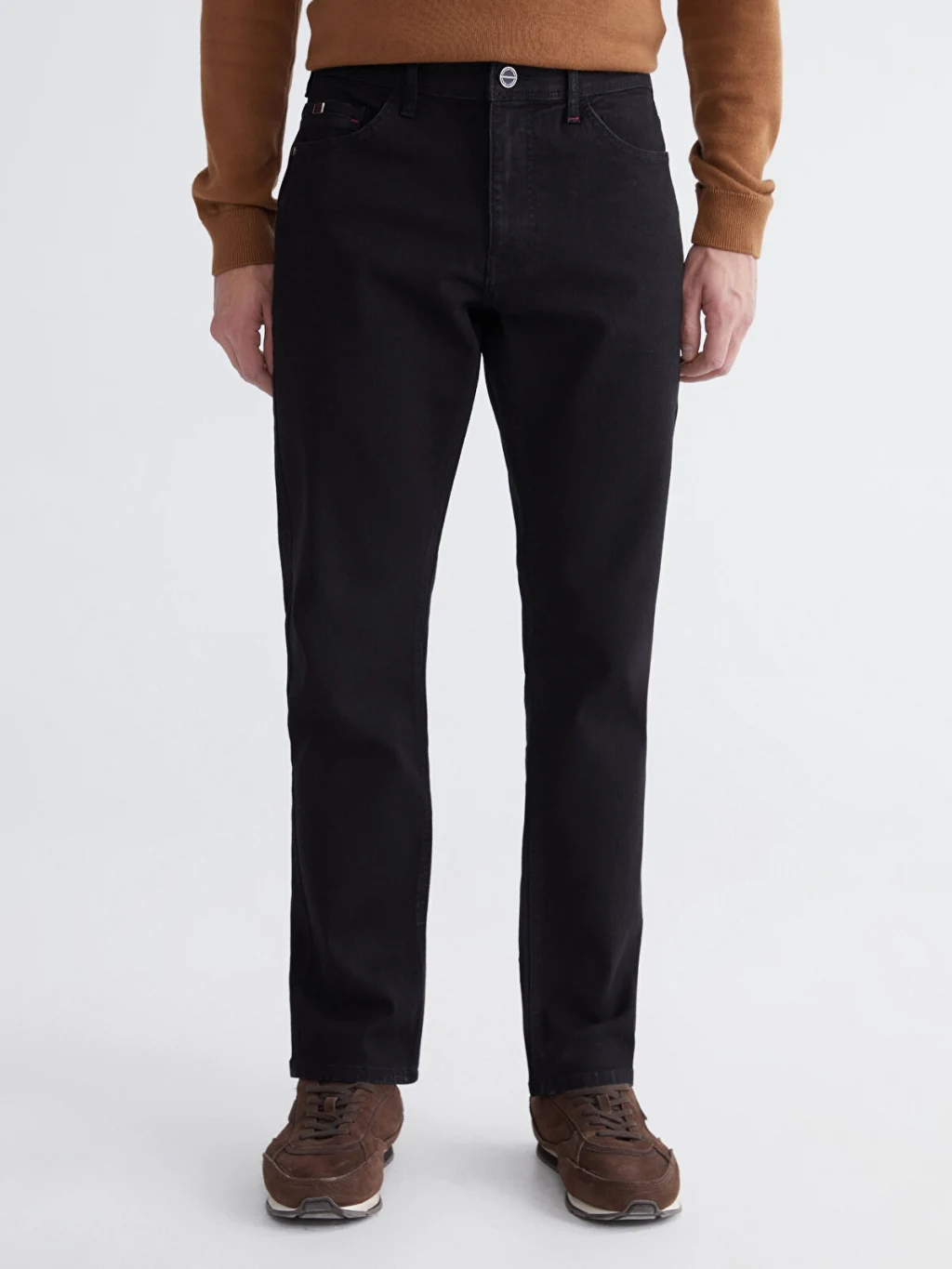 Yüksek pamuk içeren kumaştan üretilmiş, standart kalıplı erkek jean pantolon, beş cepli tasarıma sahiptir ve fermuar ile düğme kapamalıdır.