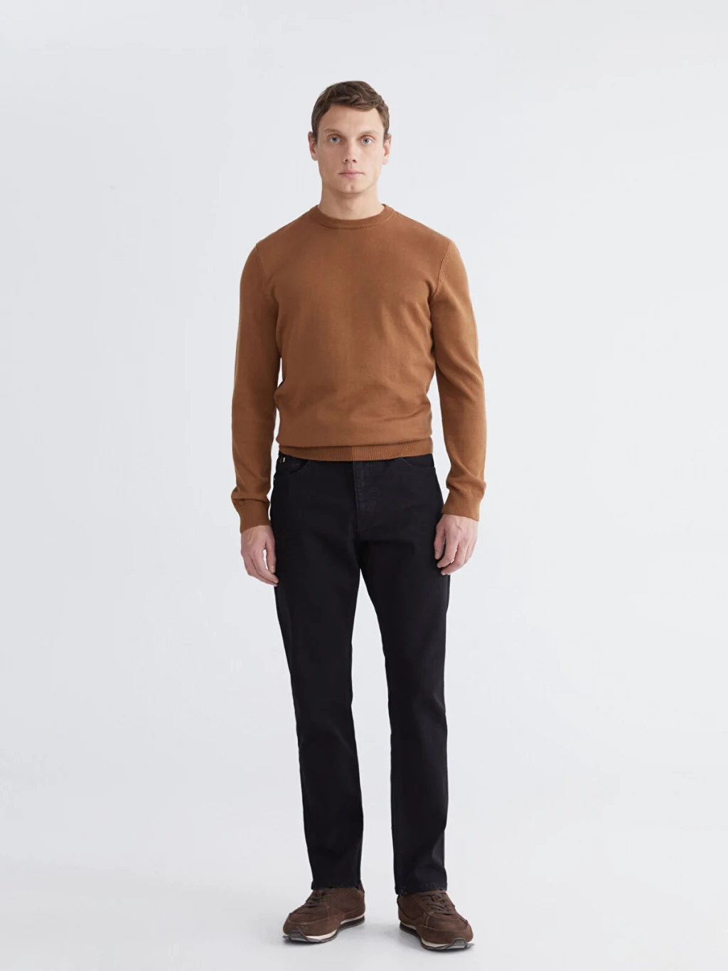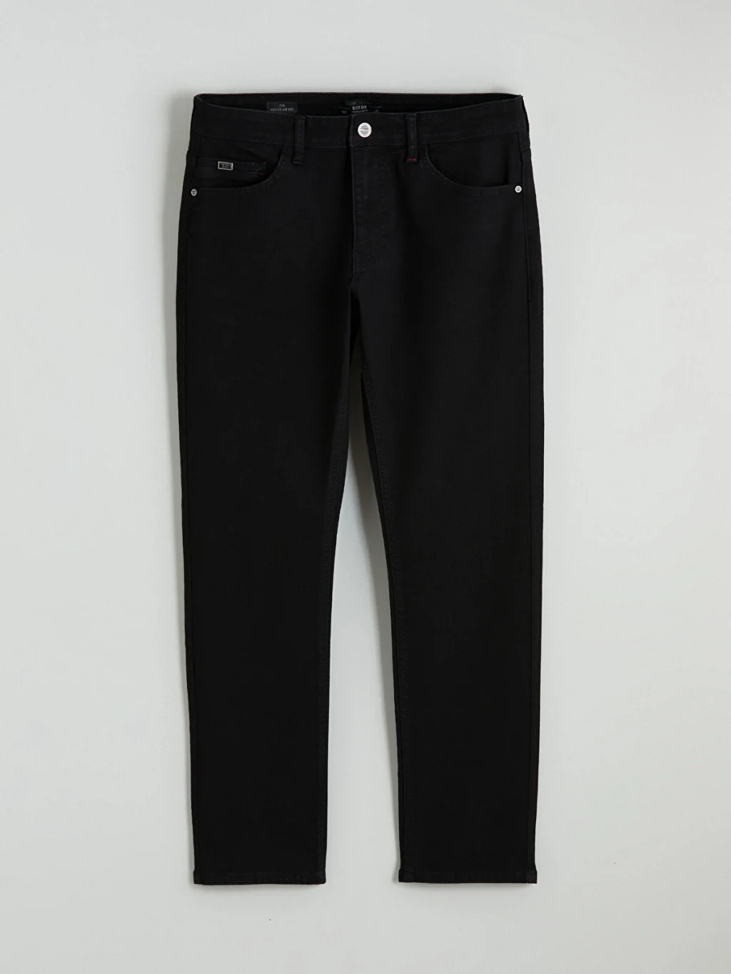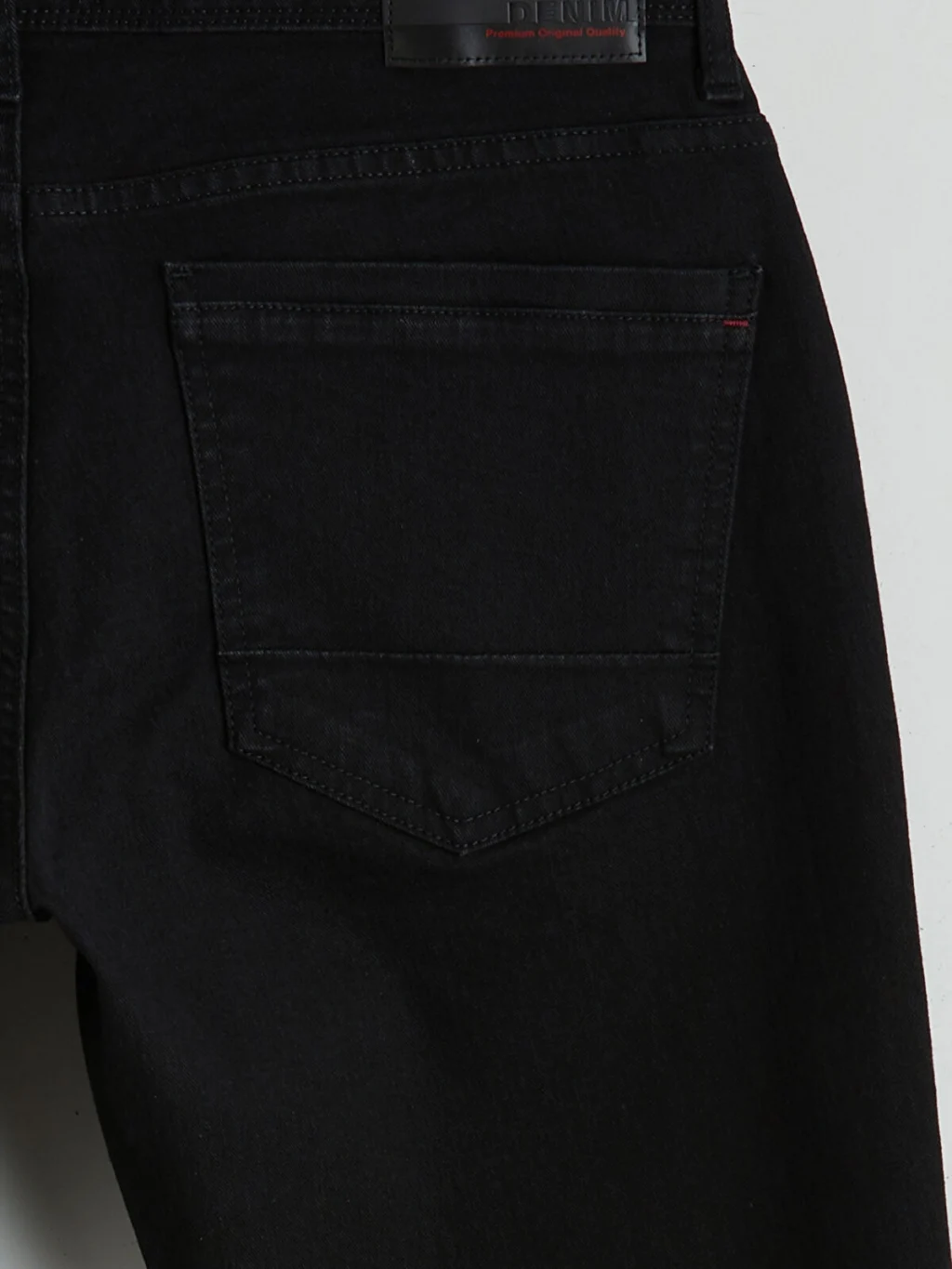 Yüksek pamuk içeren kumaştan üretilmiş, standart kalıplı erkek jean pantolon, beş cepli tasarıma sahiptir ve fermuar ile düğme kapamalıdır.