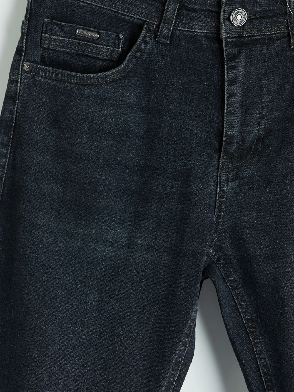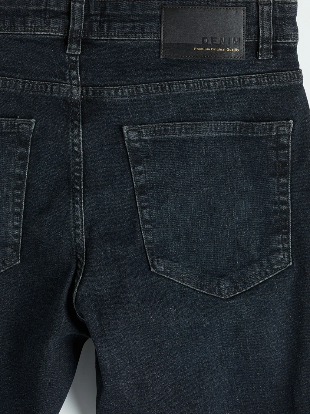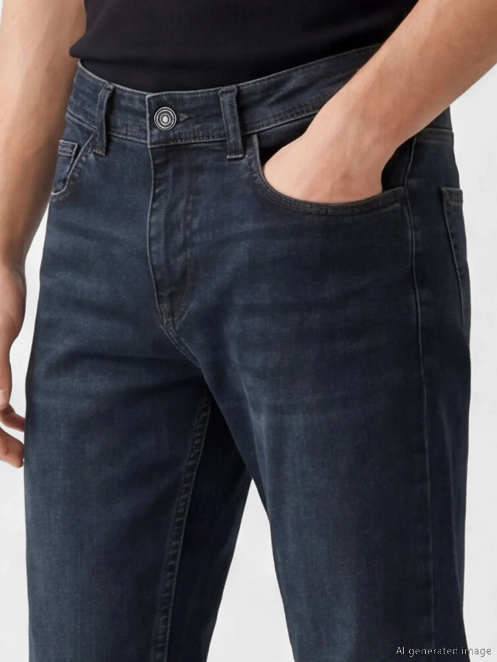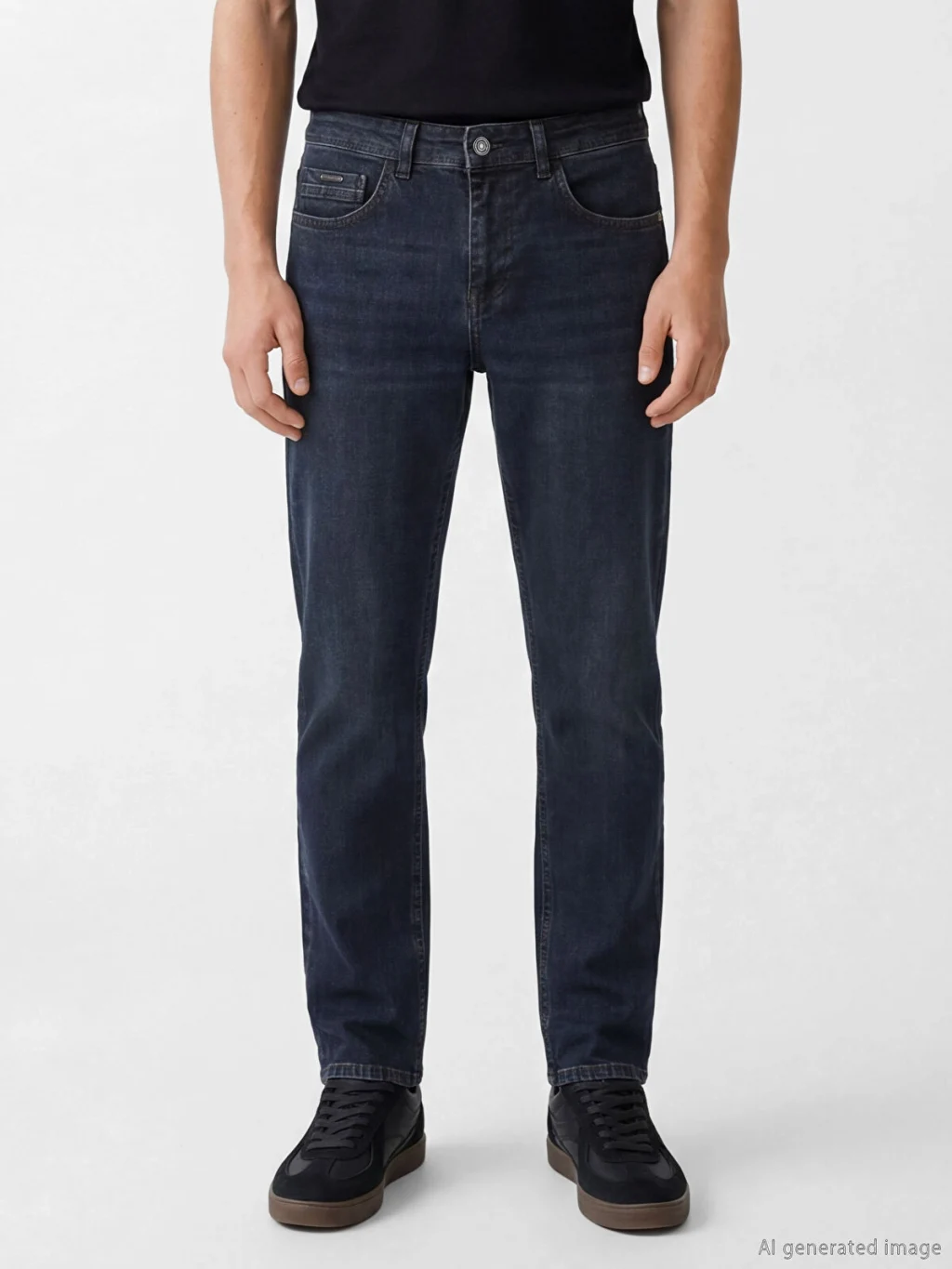 Pamuklu denim kumaştan üretilmiş erkek jean pantolon, beş cepli tasarıma sahiptir ve fermuar ve düğme kapamalıdır.