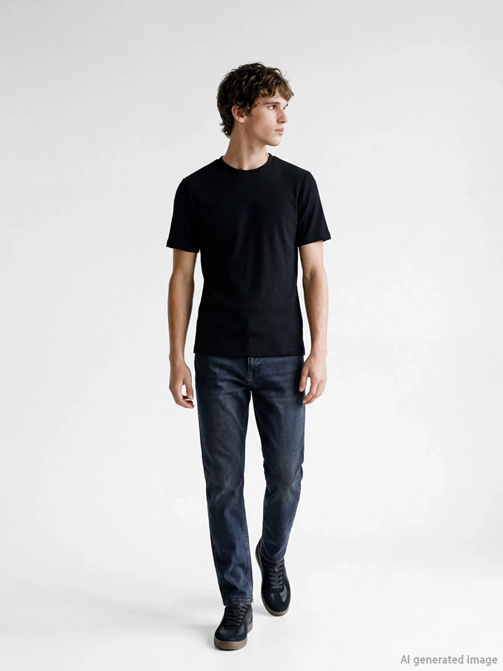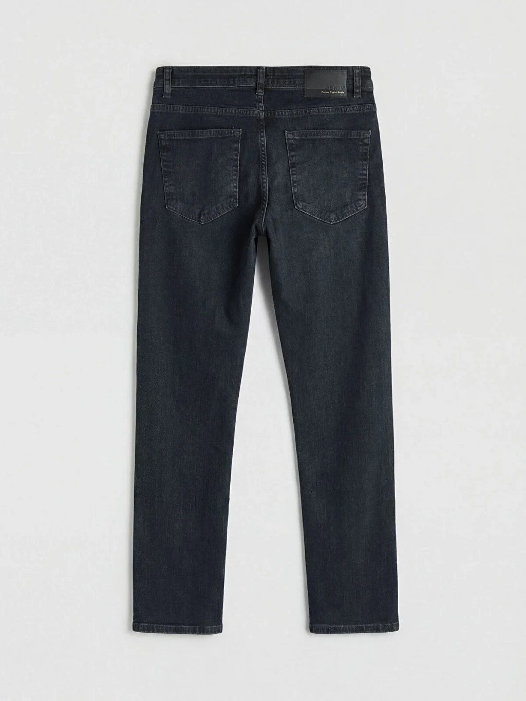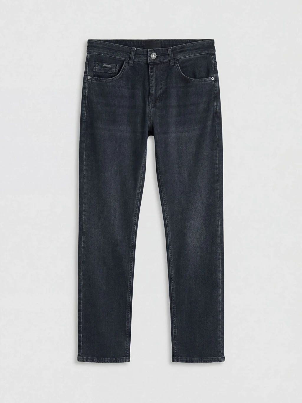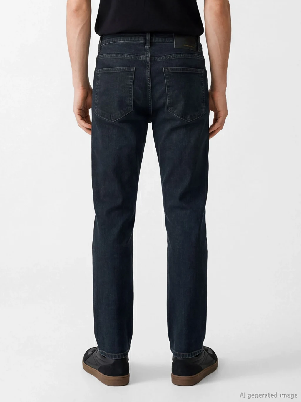 Pamuklu denim kumaştan üretilmiş erkek jean pantolon, beş cepli tasarıma sahiptir ve fermuar ve düğme kapamalıdır.