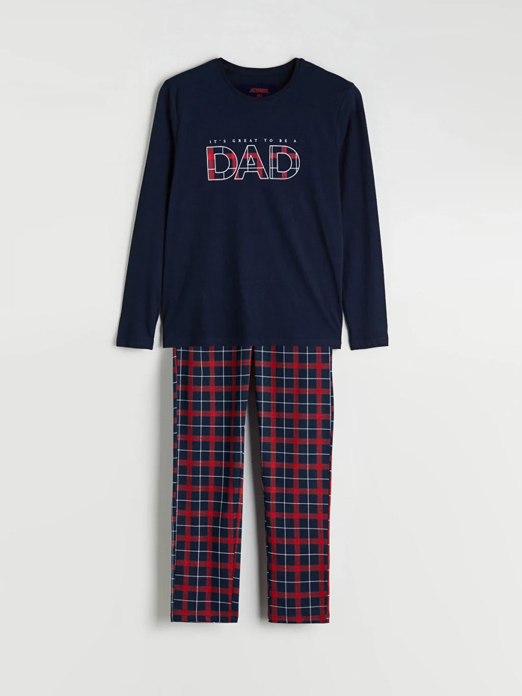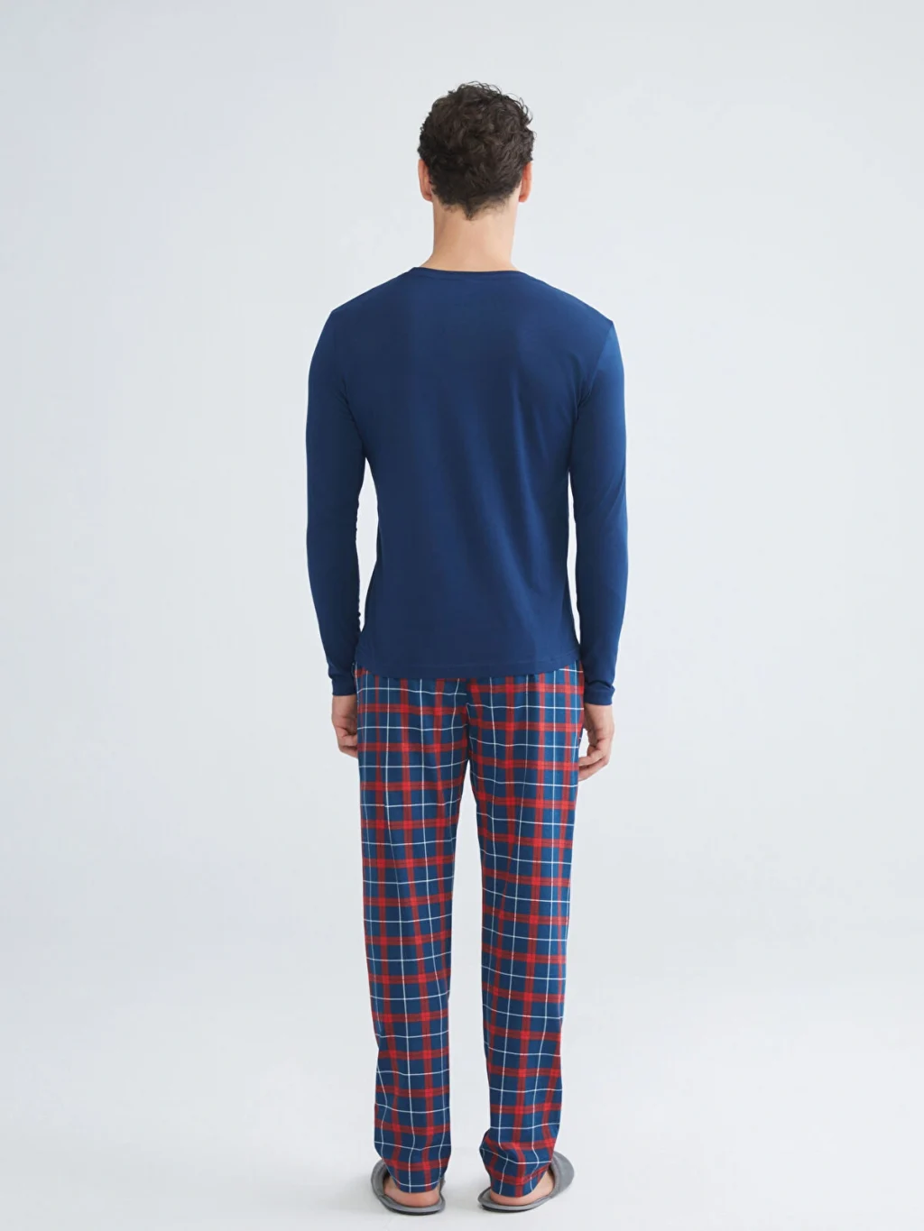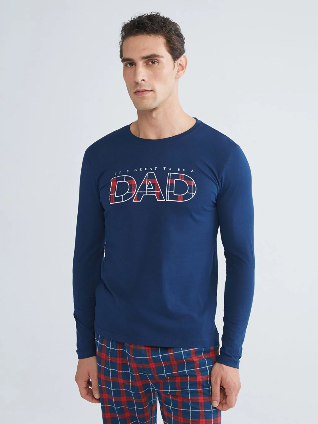 Penye kumaştan üretilen erkek pijama takımı, bisiklet yaka, uzun kollu ve baskılı üst ile kareli desenli alttan oluşmaktadır.