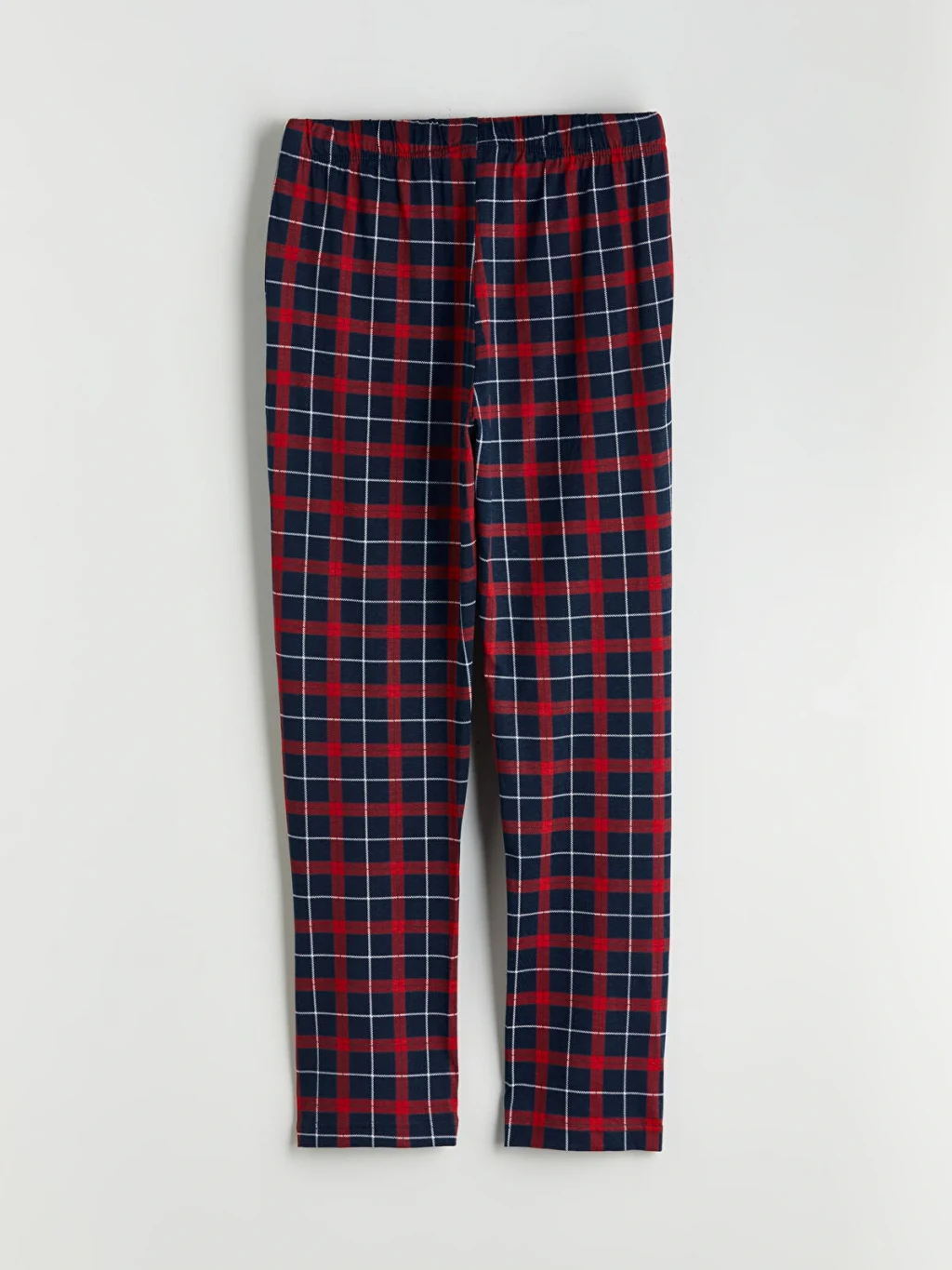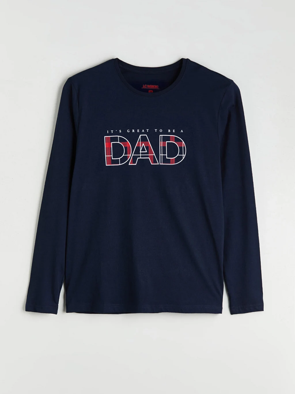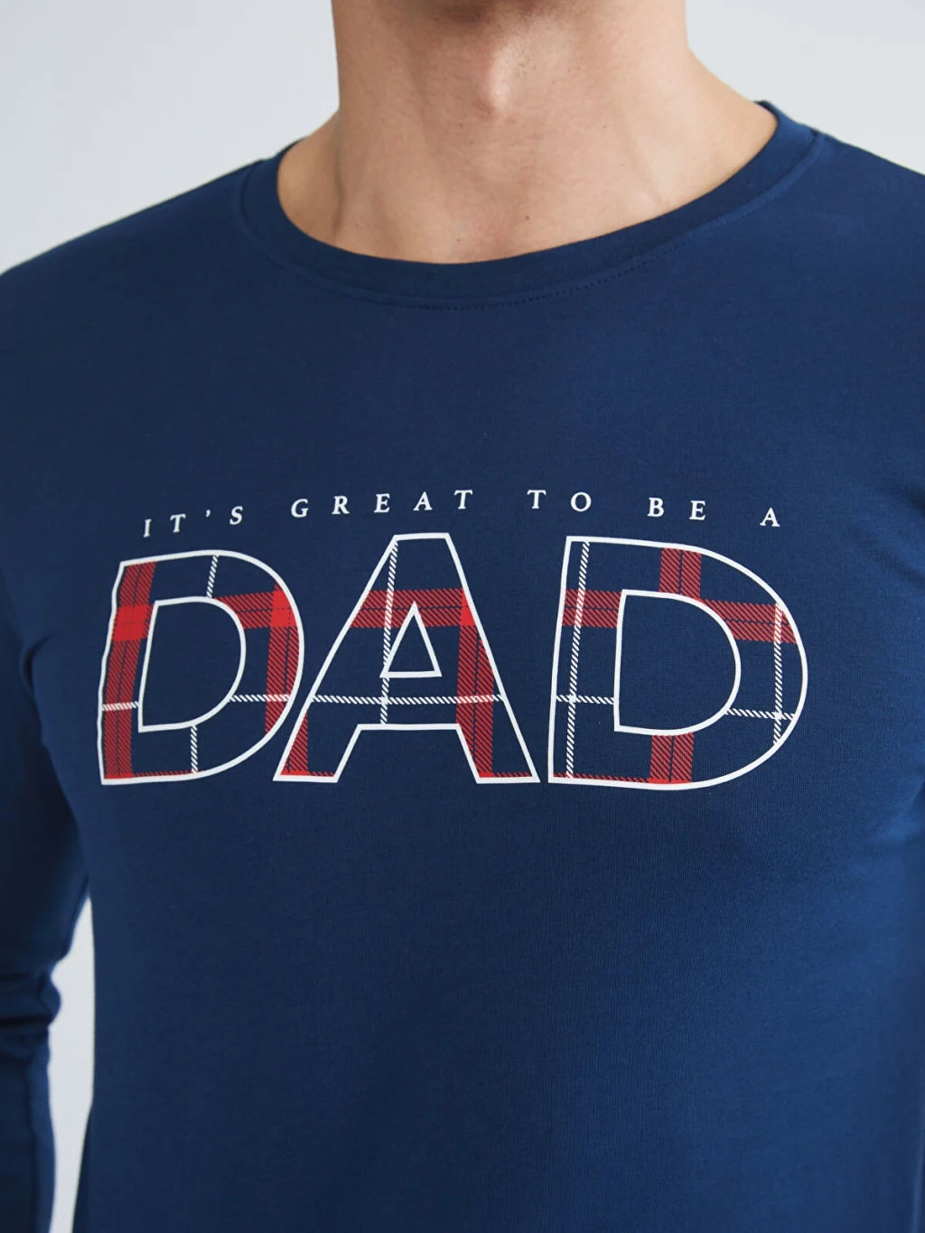 Penye kumaştan üretilen erkek pijama takımı, bisiklet yaka, uzun kollu ve baskılı üst ile kareli desenli alttan oluşmaktadır.