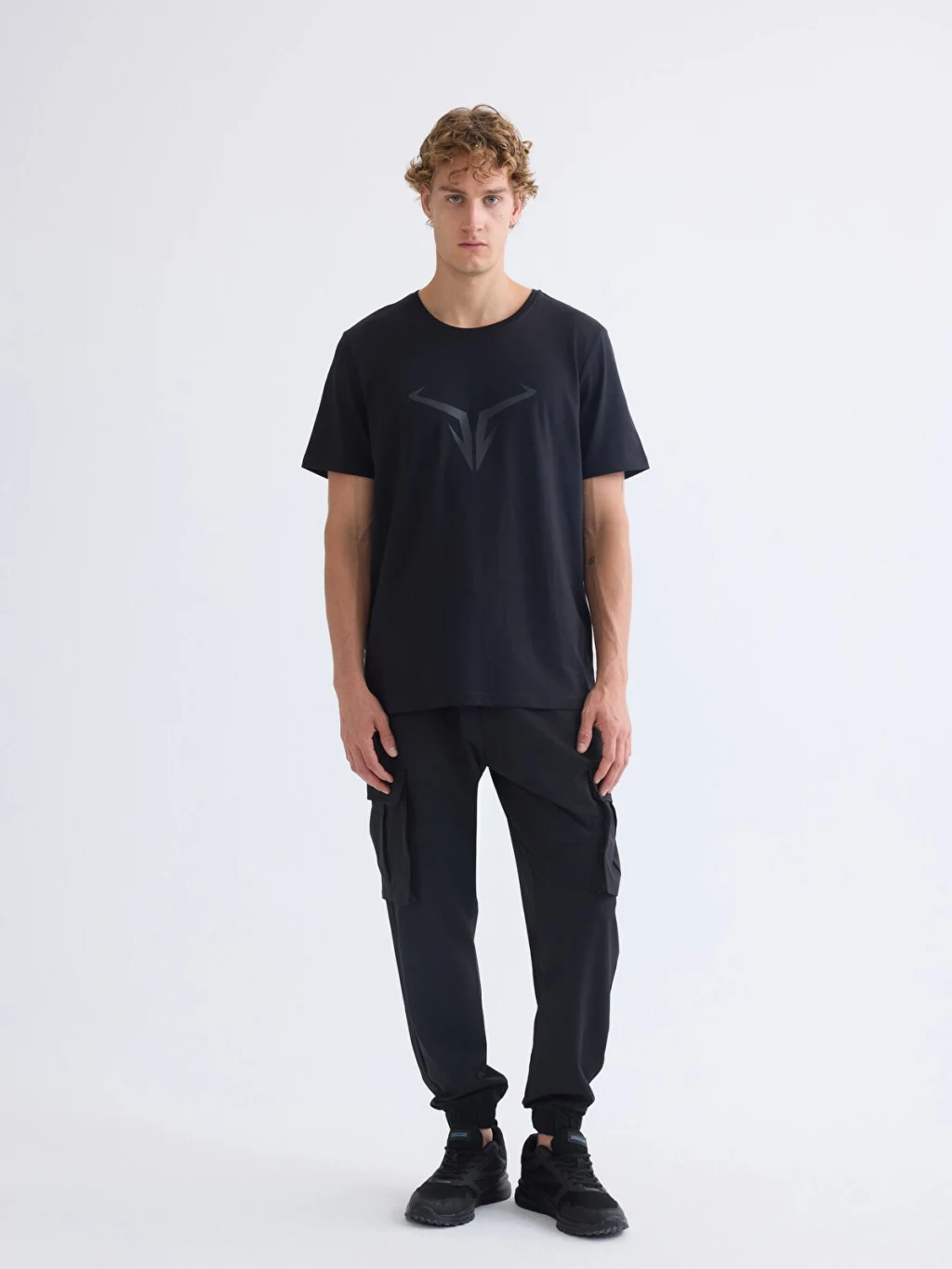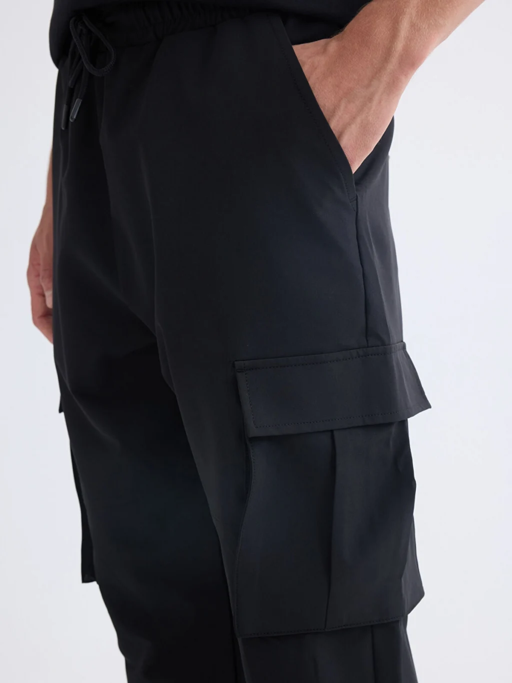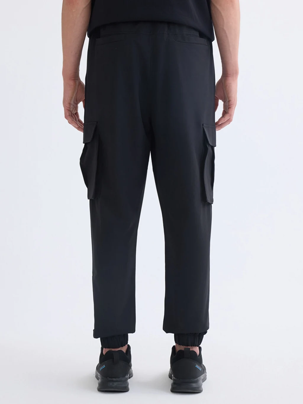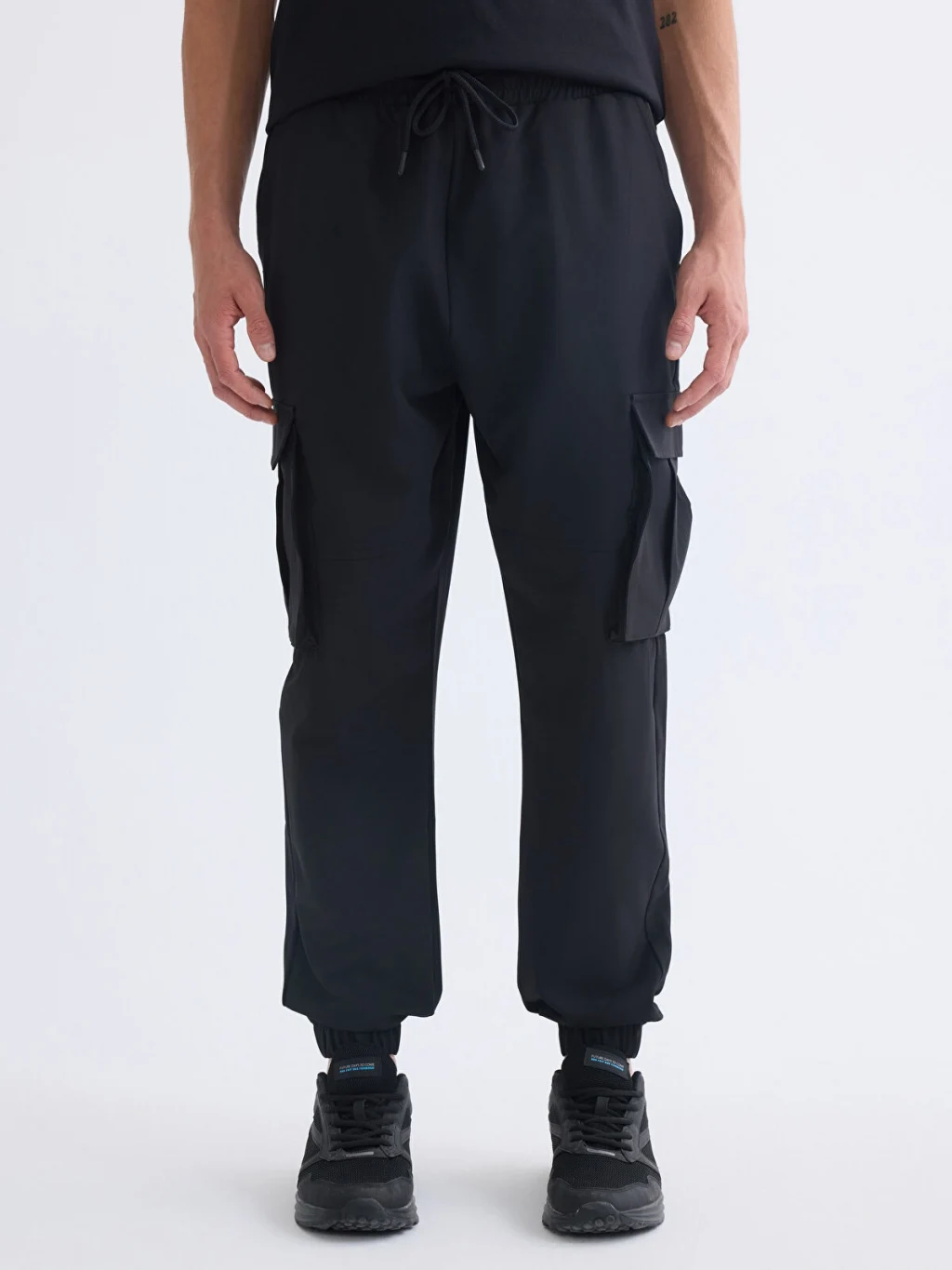 Beli ve paçaları lastikli erkek eşofman altı, jogger kesime ve yanlarda kapaklı kargo ceplere sahiptir.