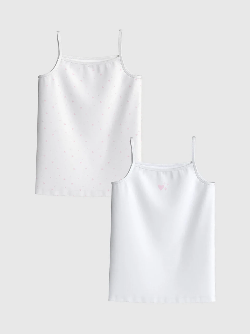 %100 pamuk kumaştan üretilen kız çocuk atlet, ip askılıdır. Set, biri kalp desenli diğeri kalp baskılı iki adet atletten oluşur.