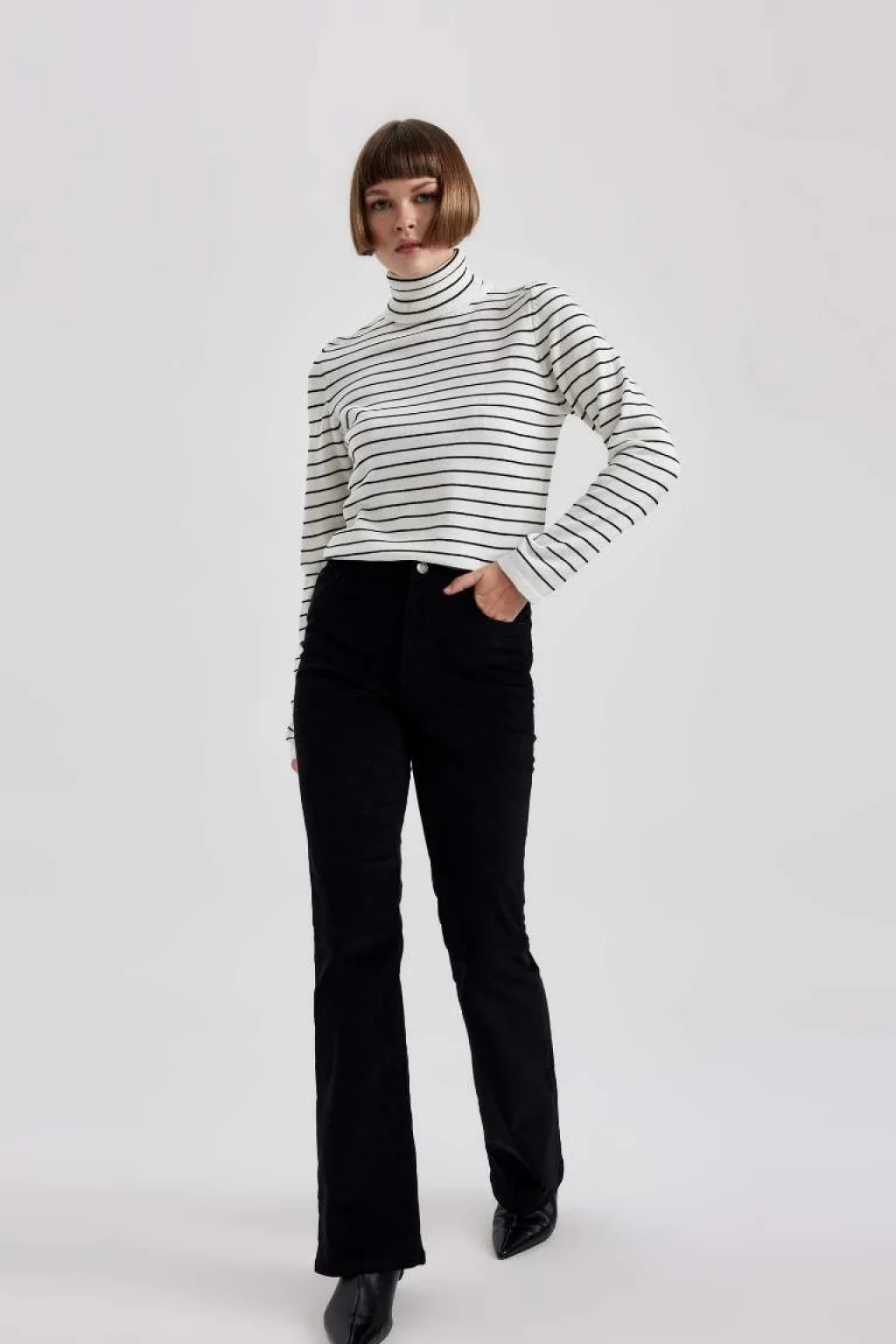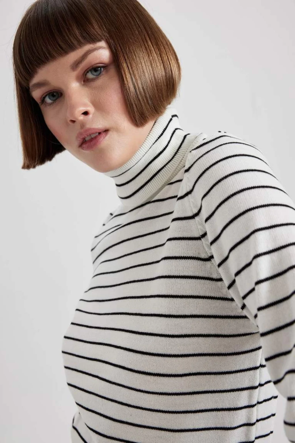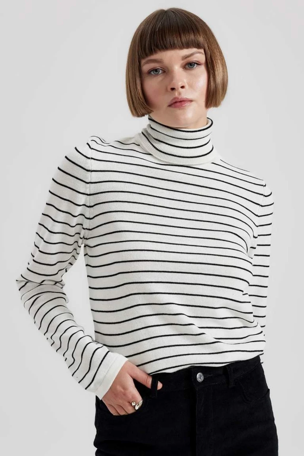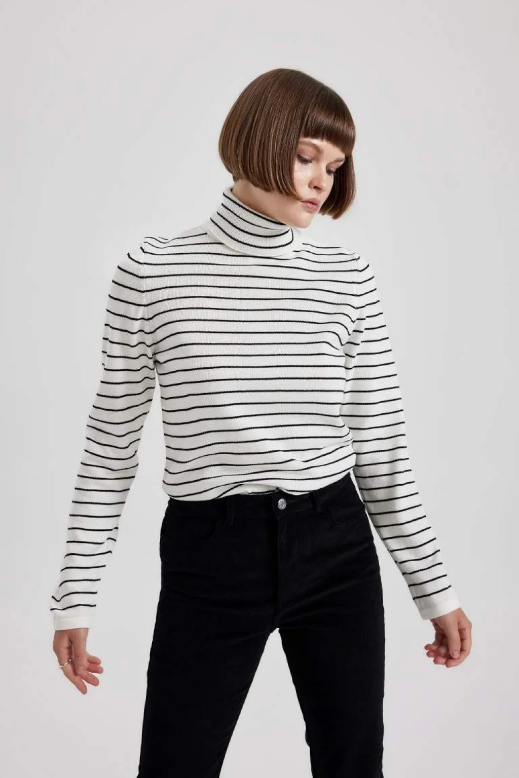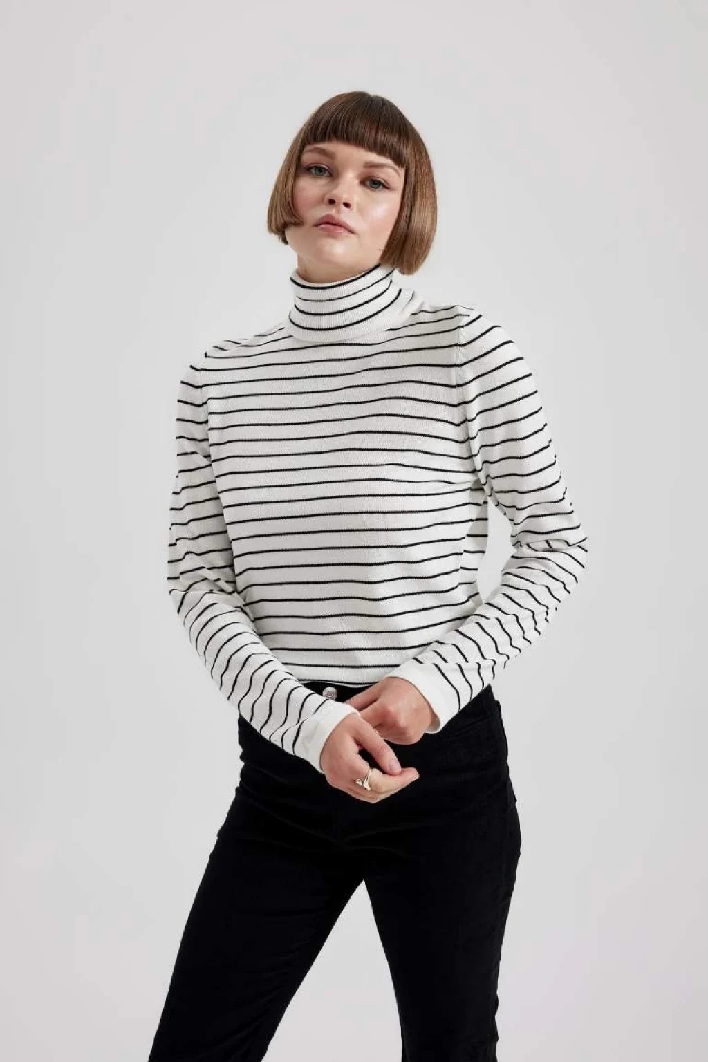 Basic trend görünümlü ile günlük giyiminizde sıkça kullanacağınız,yün şort, boyfriend jean ve yüksek bel suni deri şort ve pantolonlarınızla rahatlıkla kombinleyebileceğiniz, crop fit mükemmel kalıbıyla DeFacto Kadın Regular Fit Balıkçı Yaka Kazak.