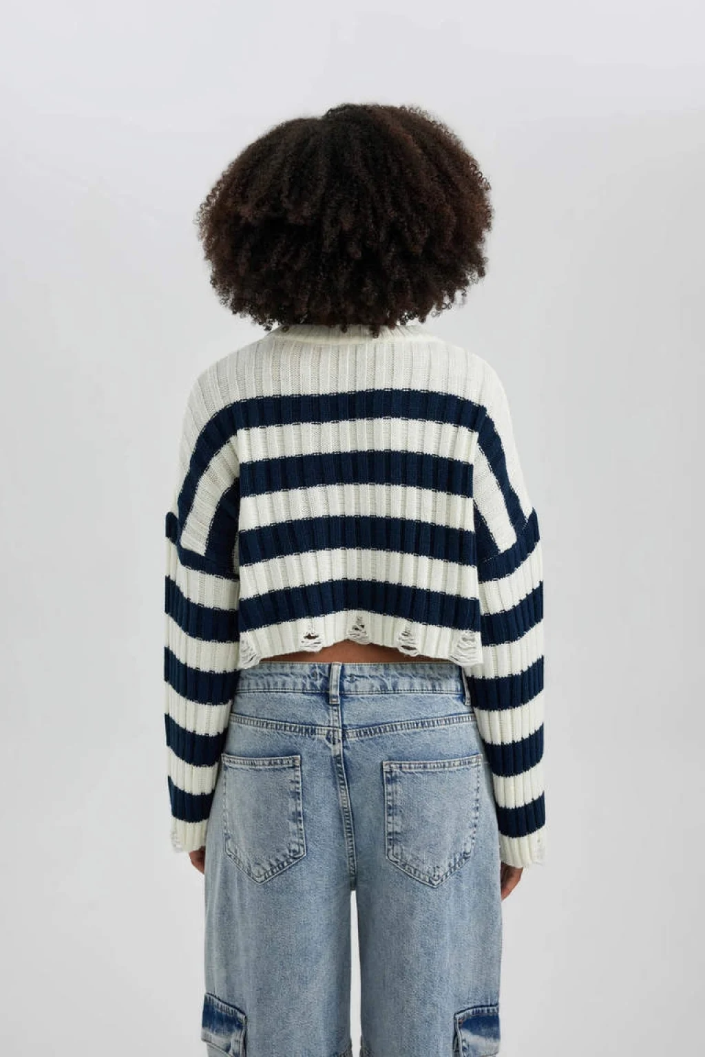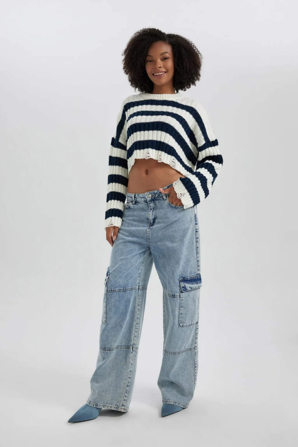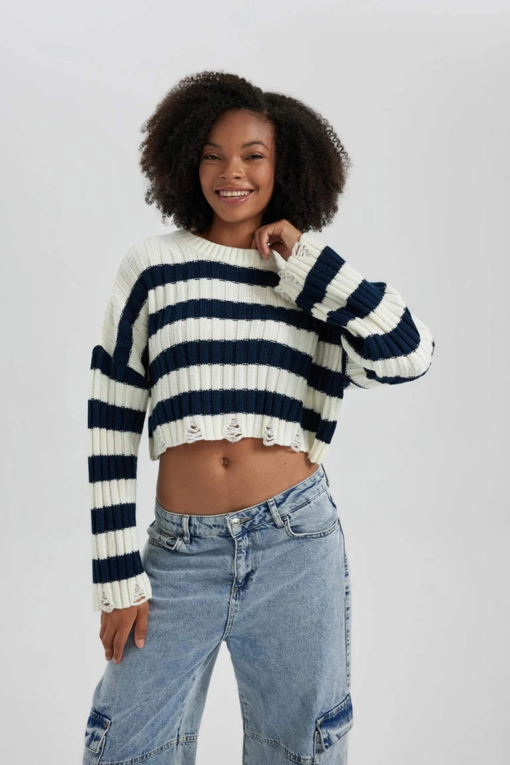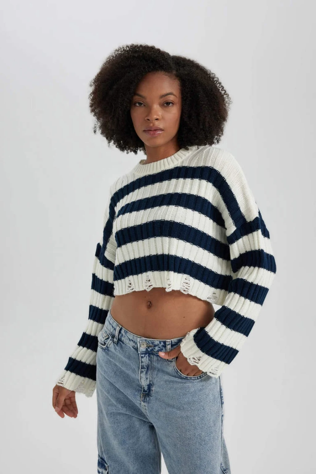Trend görünümlü örgüsü, delik geçişli modeli ile günlük giyiminizde sıkça kullanacağınız, örgü desenli yün şort, boyfriend jean ve yüksek bel suni deri şort ve pantolonlarınızla rahatlıkla kombinleyebileceğiniz, crop fit mükemmel kalıbıyla DeFacto Kadın Coool Regular Fit Bisiklet Yaka Triko Kazak.