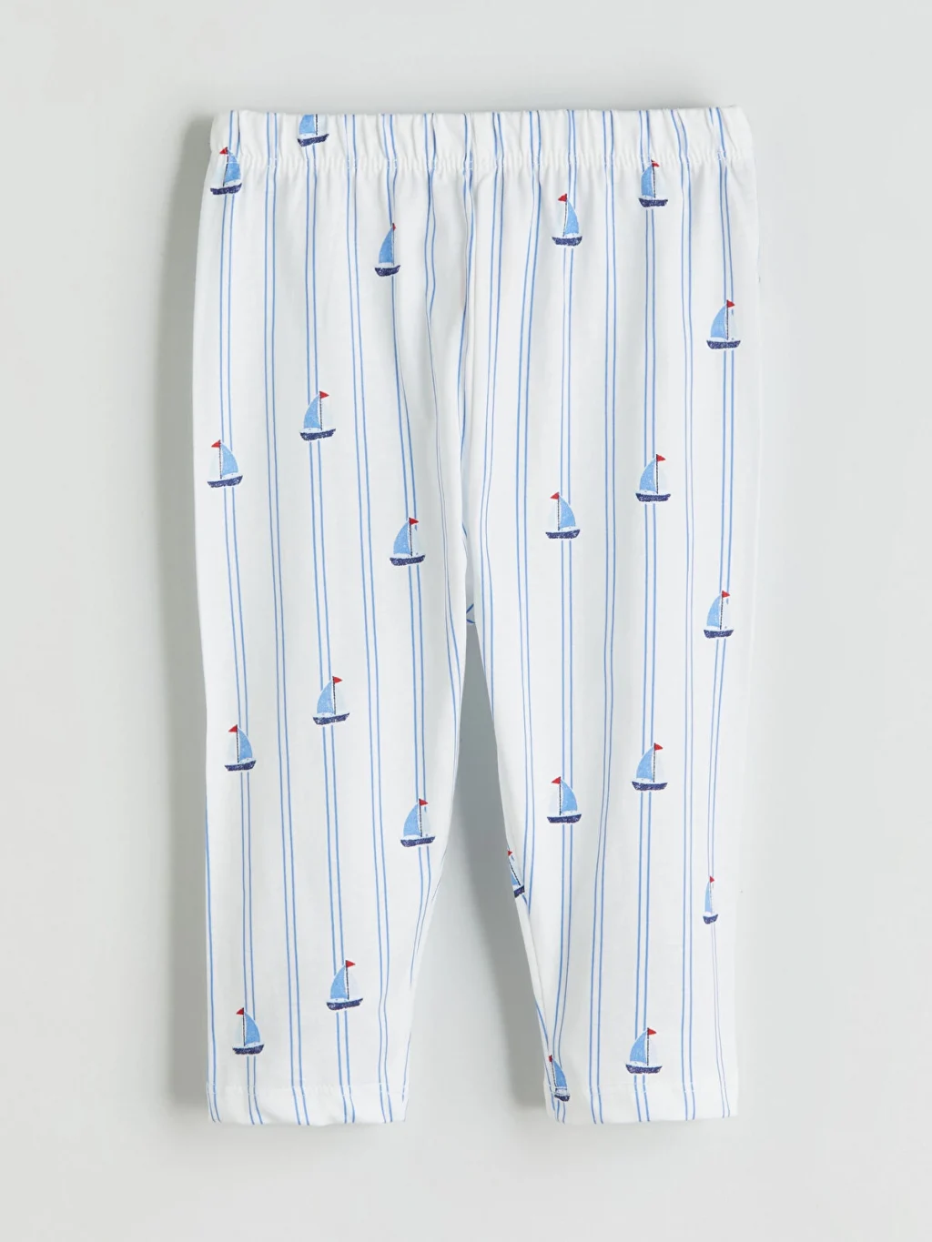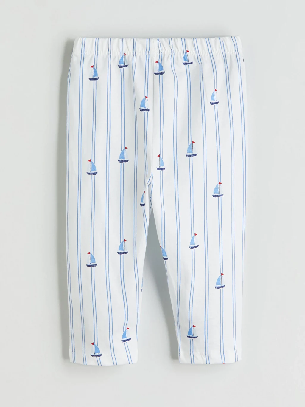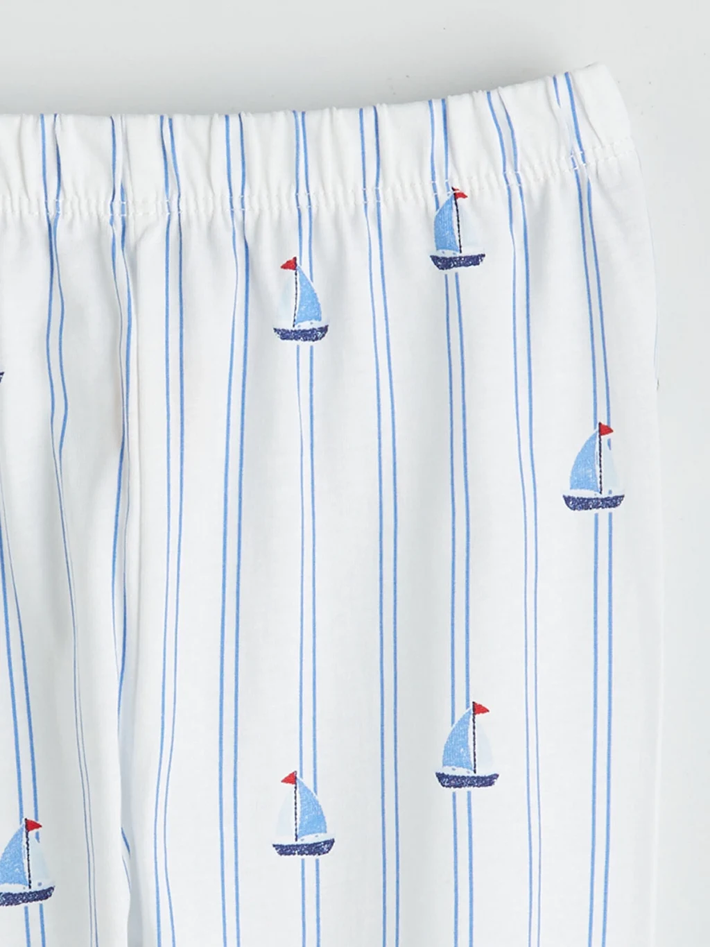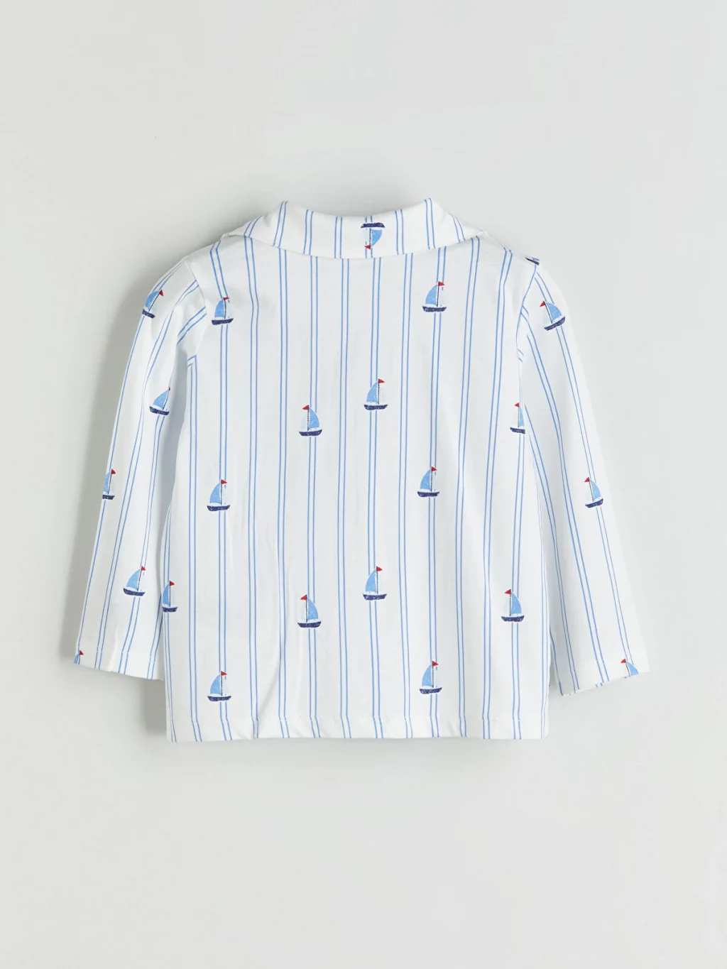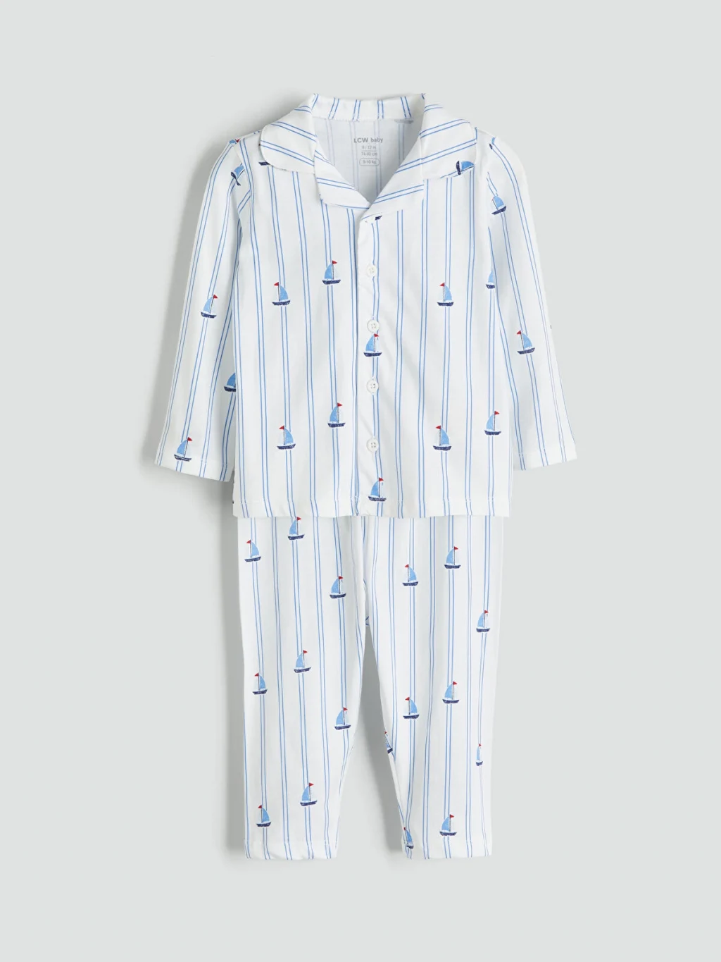 Çizgili ve desenli erkek bebek pijama takımı, %100 pamuk penye kumaştandır. Gömlek yakalı, uzun kollu üst önden düğmelidir ve pijama altından oluşur.