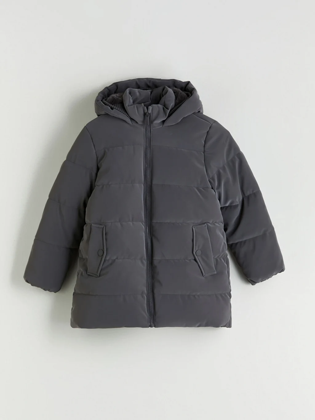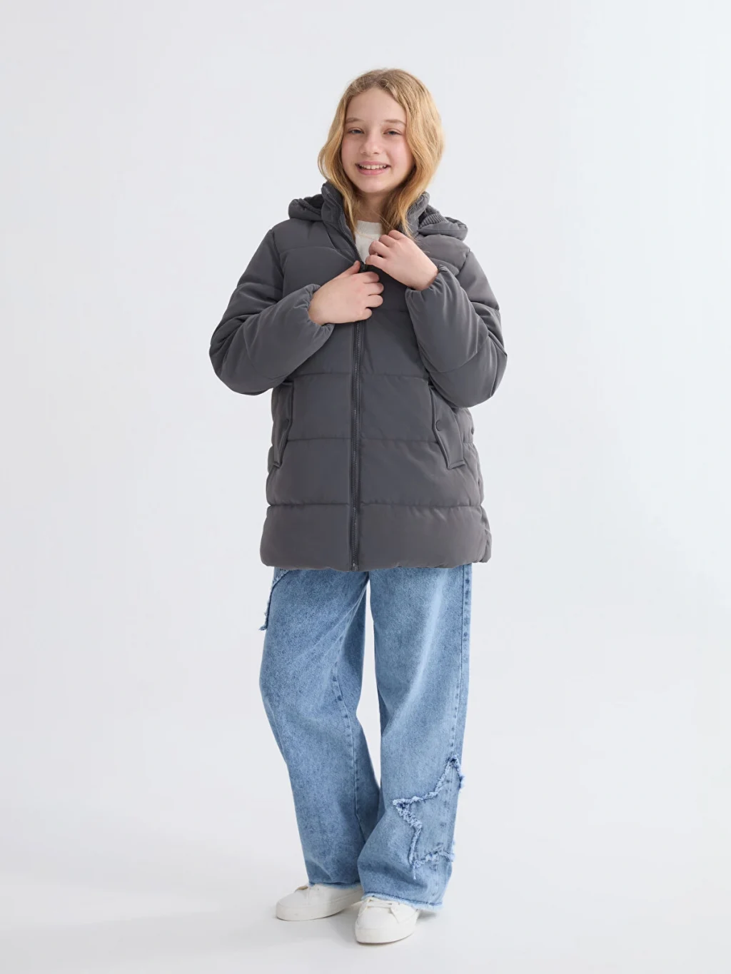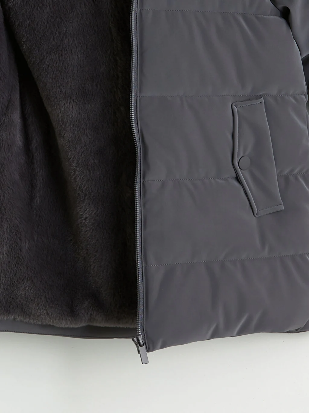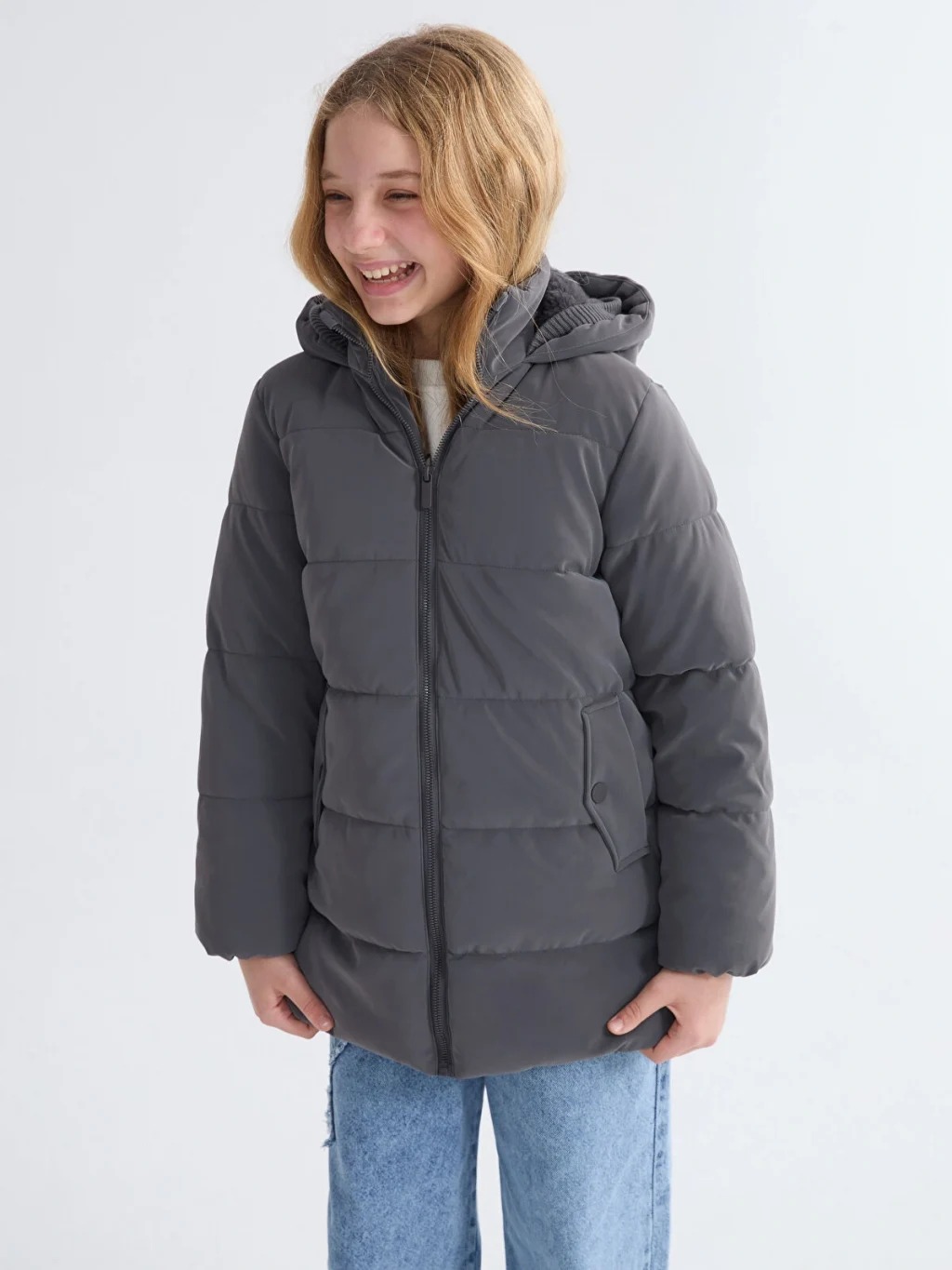 Su itici kumaştan üretilmiş kız çocuk mont, pelüş astarlıdır. Kapüşonlu ve fermuar kapamalı tasarıma sahiptir.