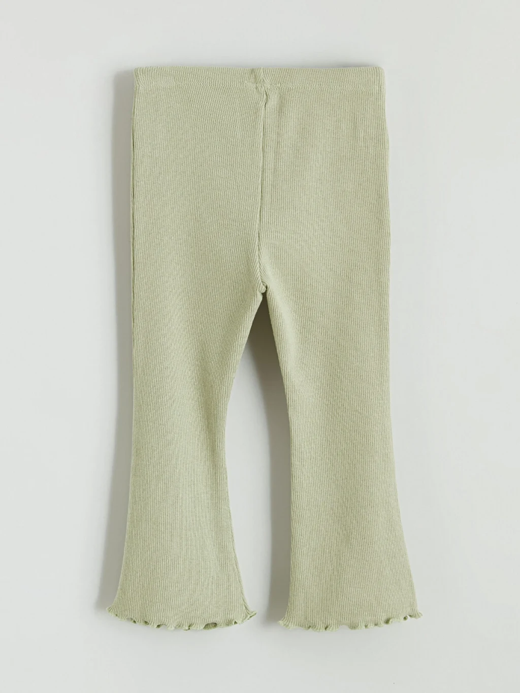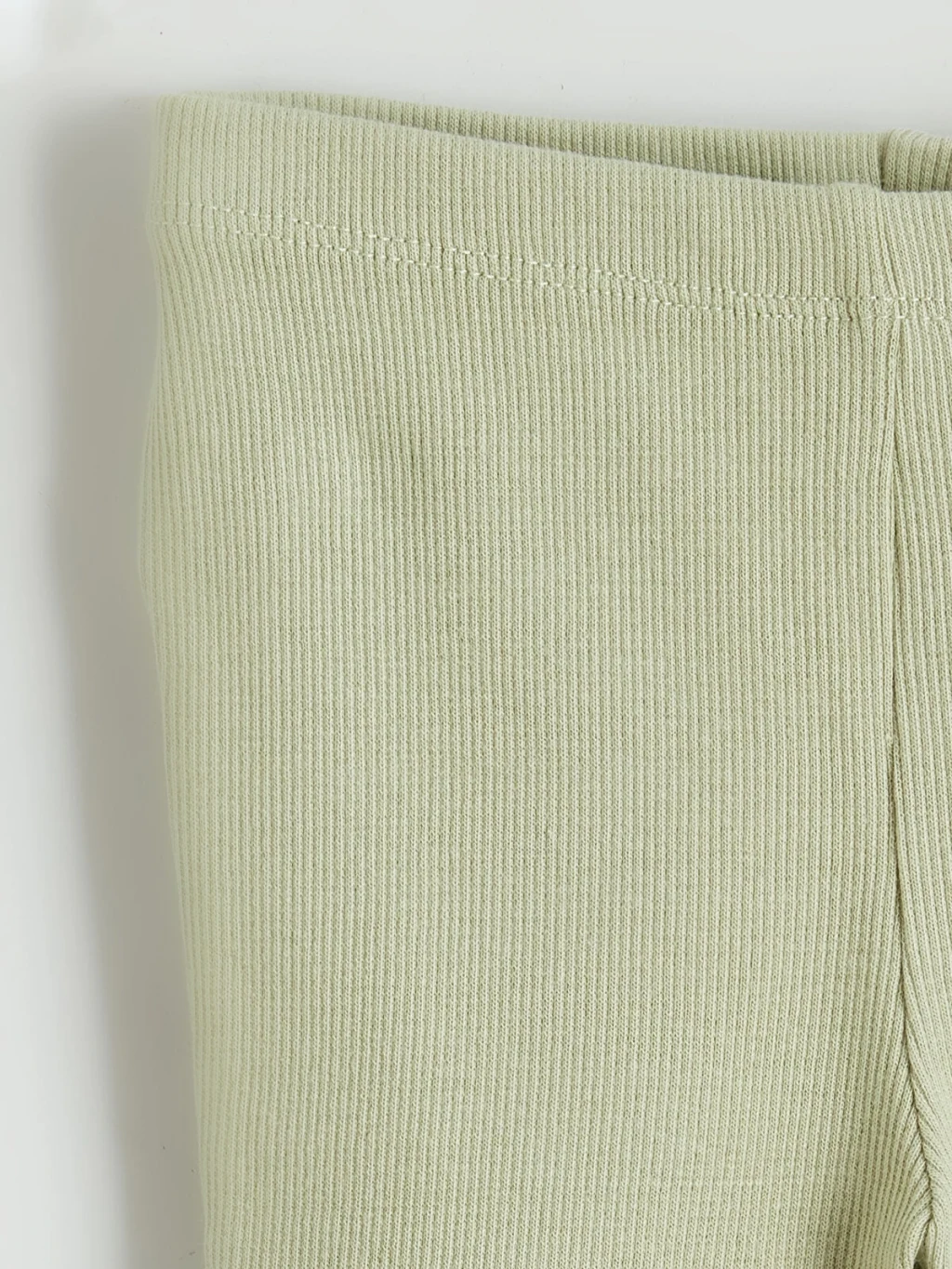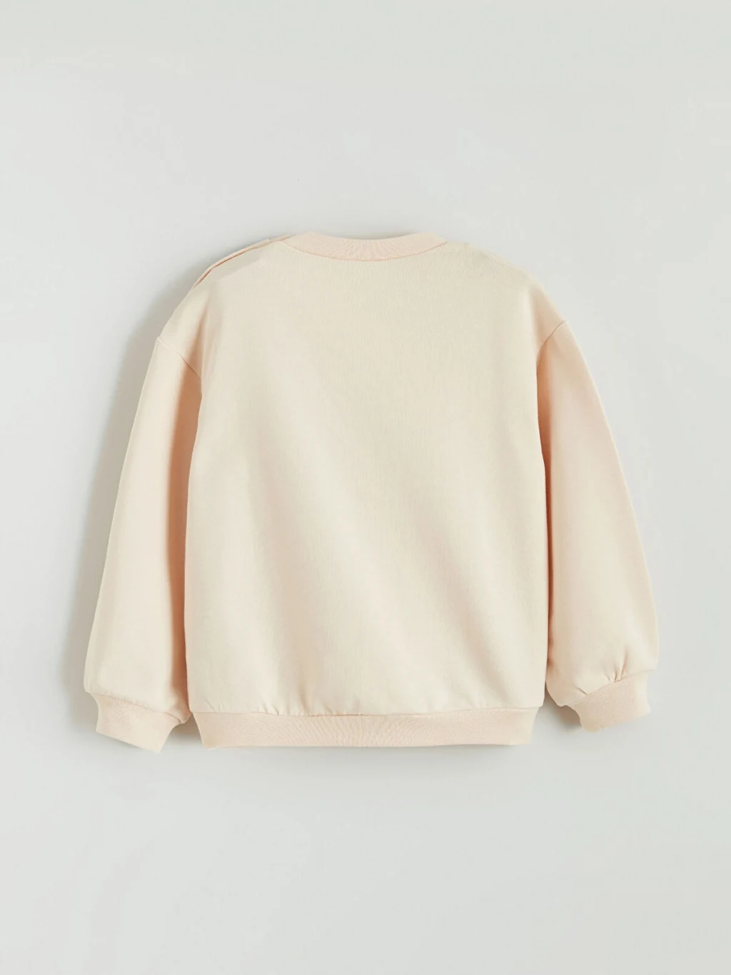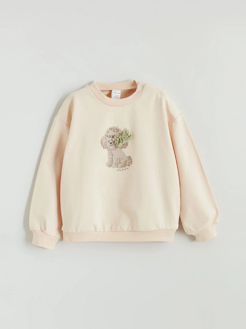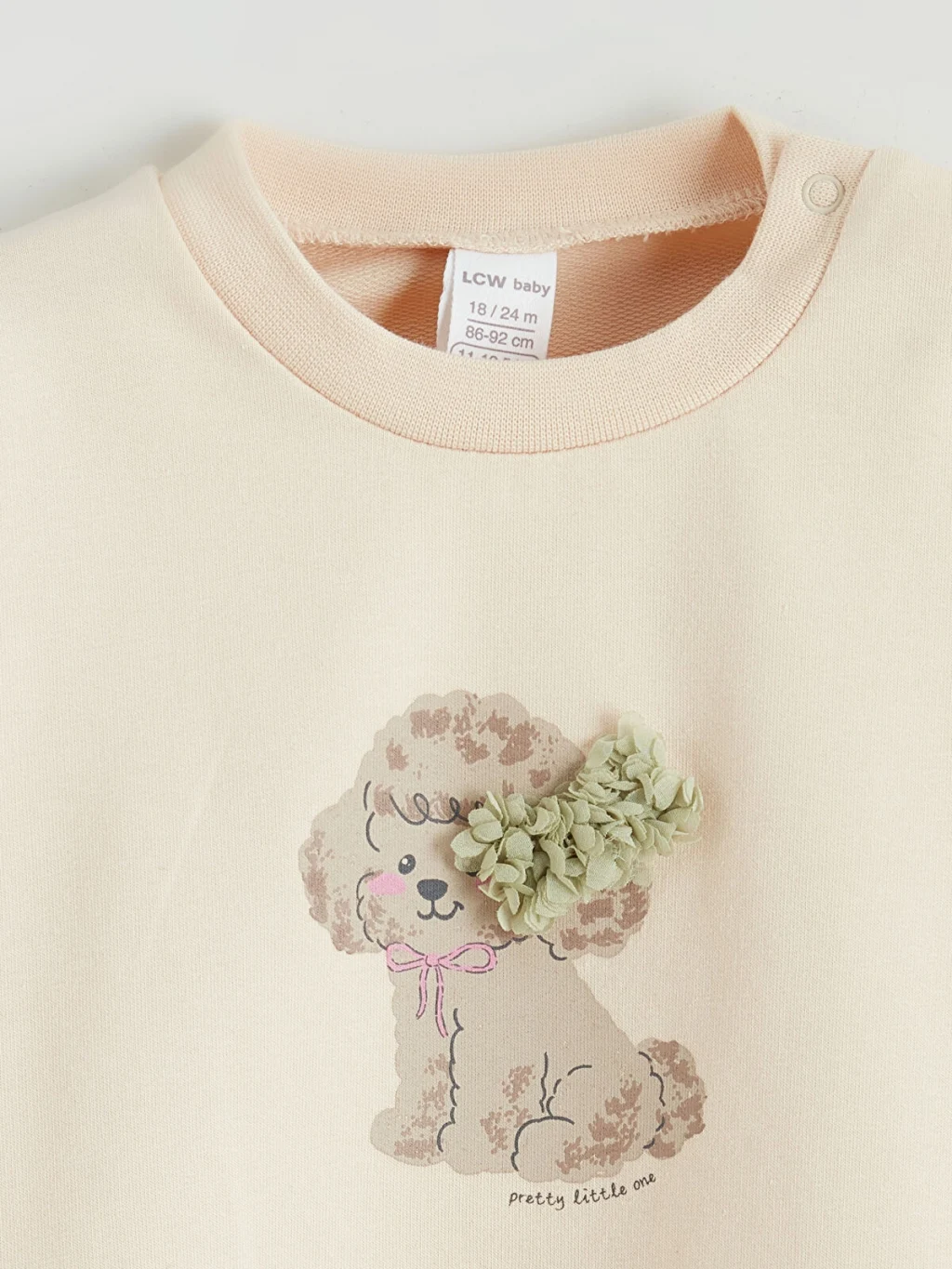 Kız bebek takımı; bisiklet yaka, uzun kollu, omuzdan çıtçıtlı, köpek baskılı ve aplike detaylı sweatshirt ile fitilli ispanyol paçalı tayttan oluşur.