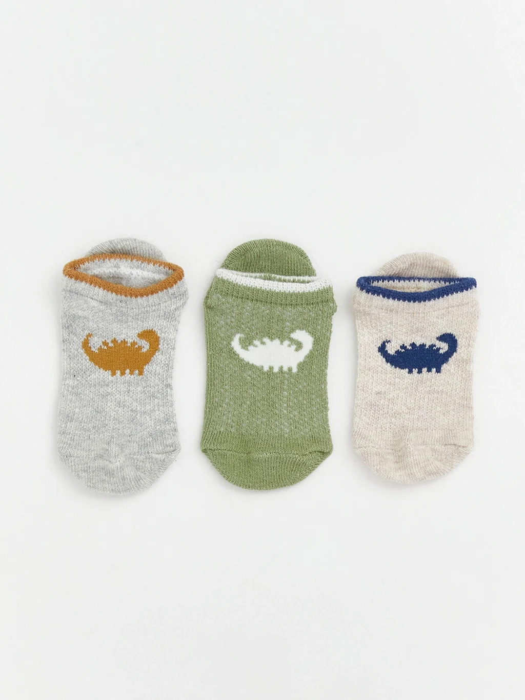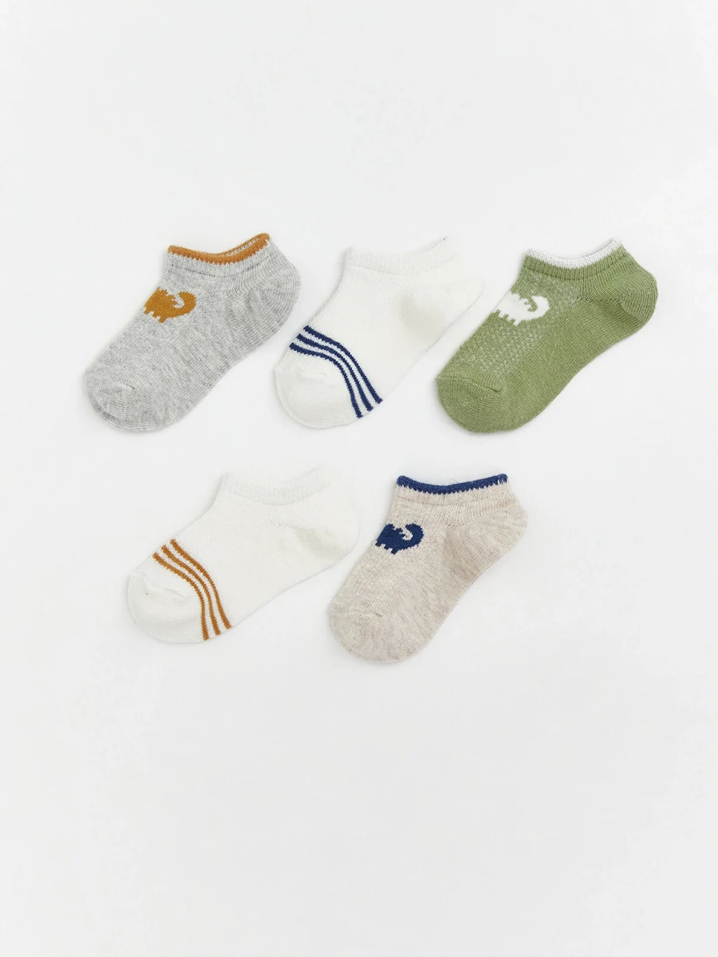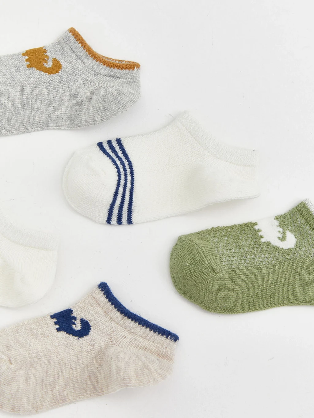 Erkek bebek için üretilmiş, hayvan figürlü ve çizgili desenlere sahip, bilek kısmı lastikli patik çorap seti.