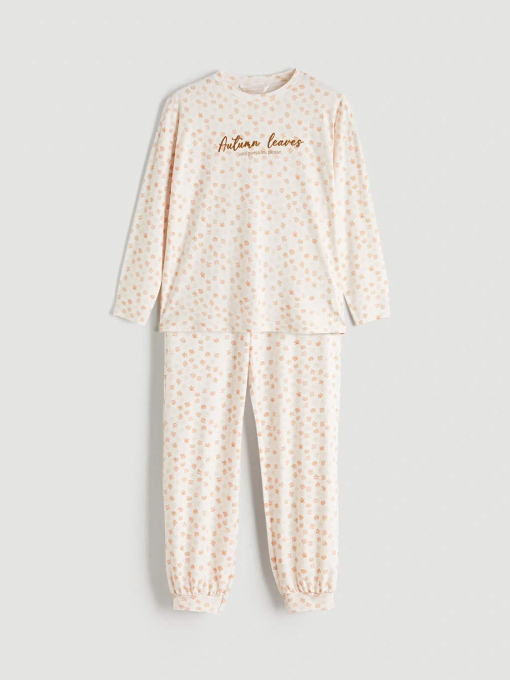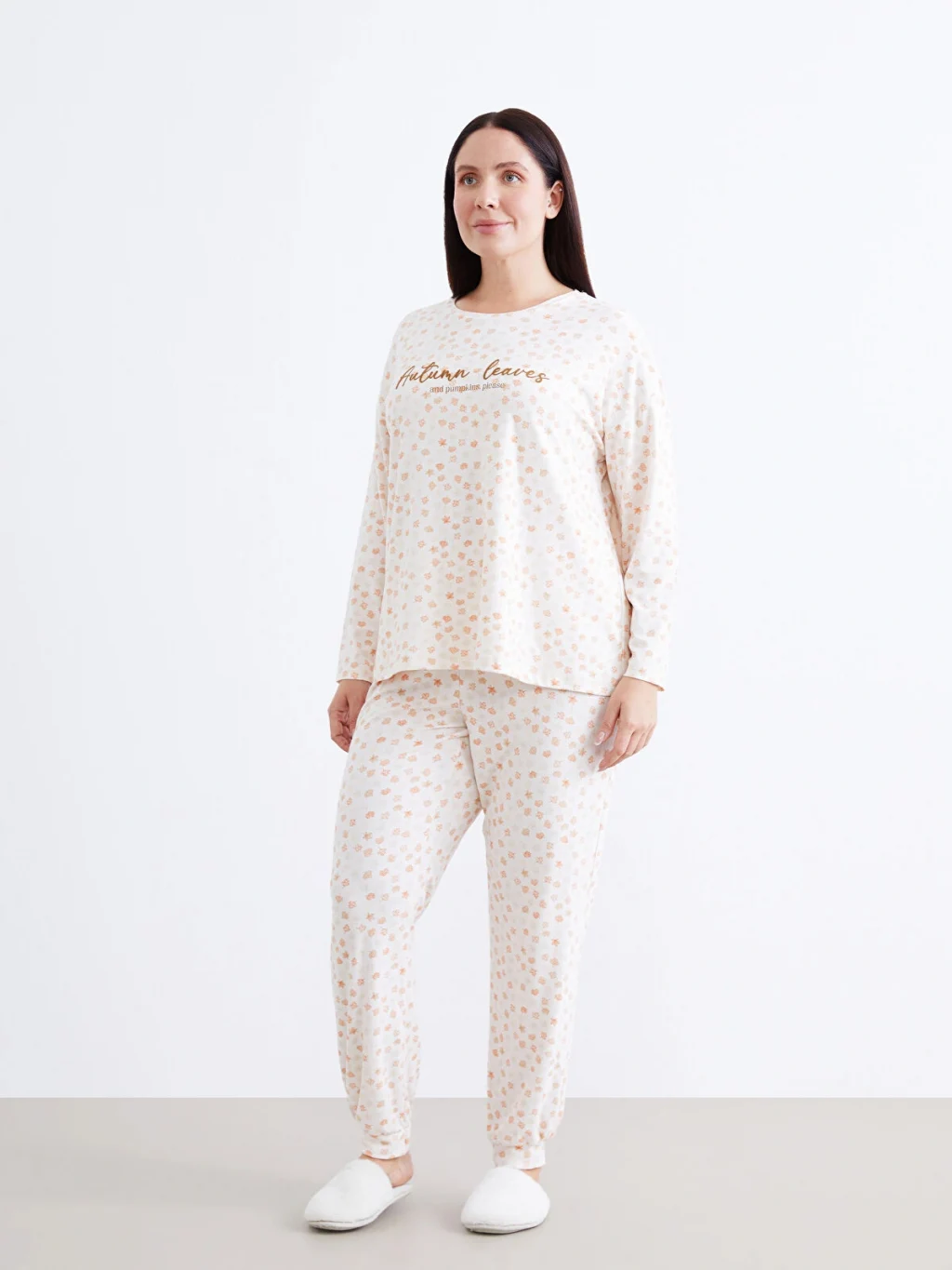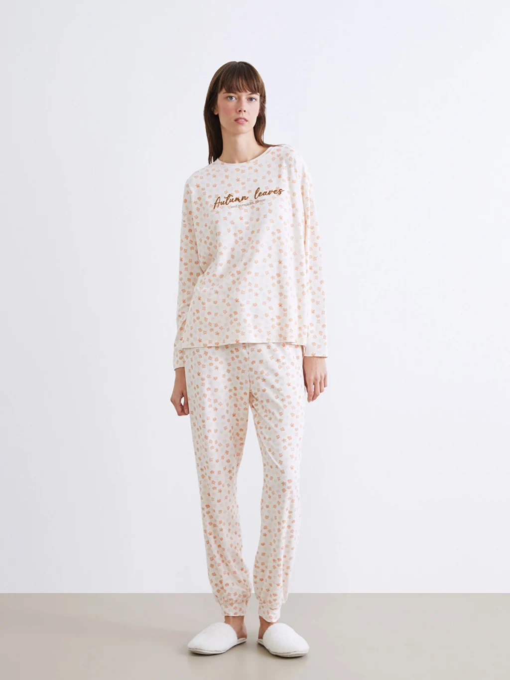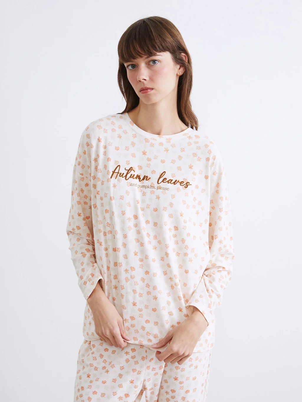 Bisiklet yaka, uzun kollu, önü yazılı ve desenli üst ile paçaları lastikli alttan oluşan kadın pijama takımı, polar kumaştan üretilmiştir.