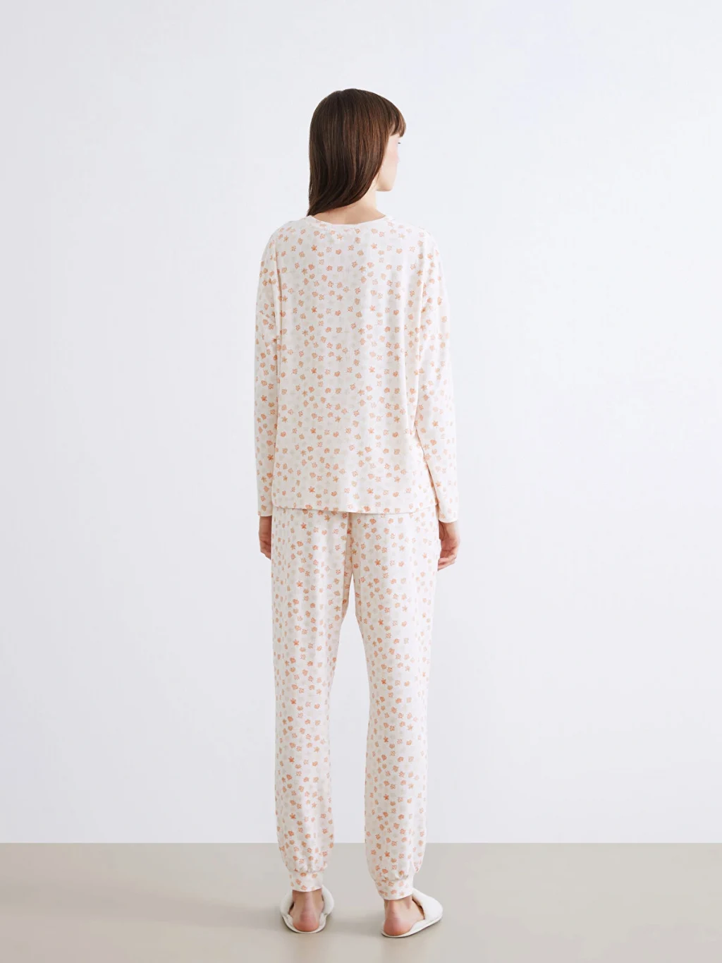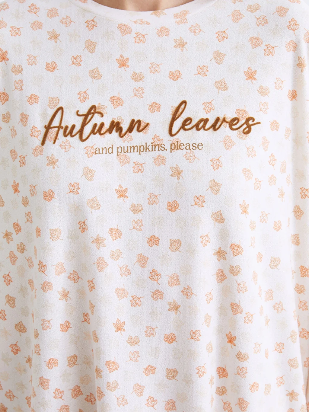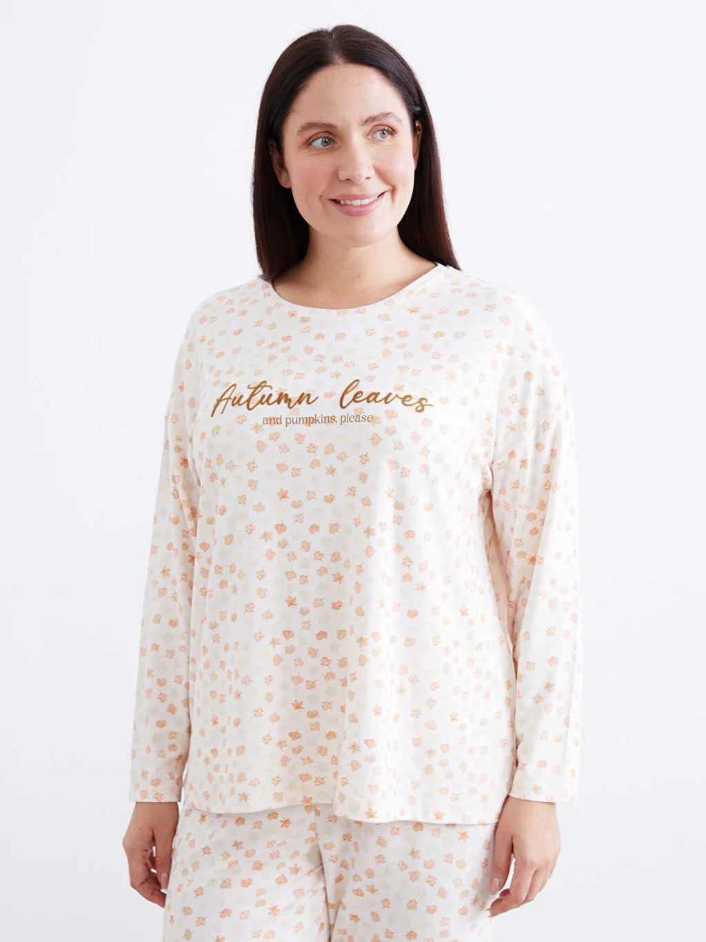 Bisiklet yaka, uzun kollu, önü yazılı ve desenli üst ile paçaları lastikli alttan oluşan kadın pijama takımı, polar kumaştan üretilmiştir.