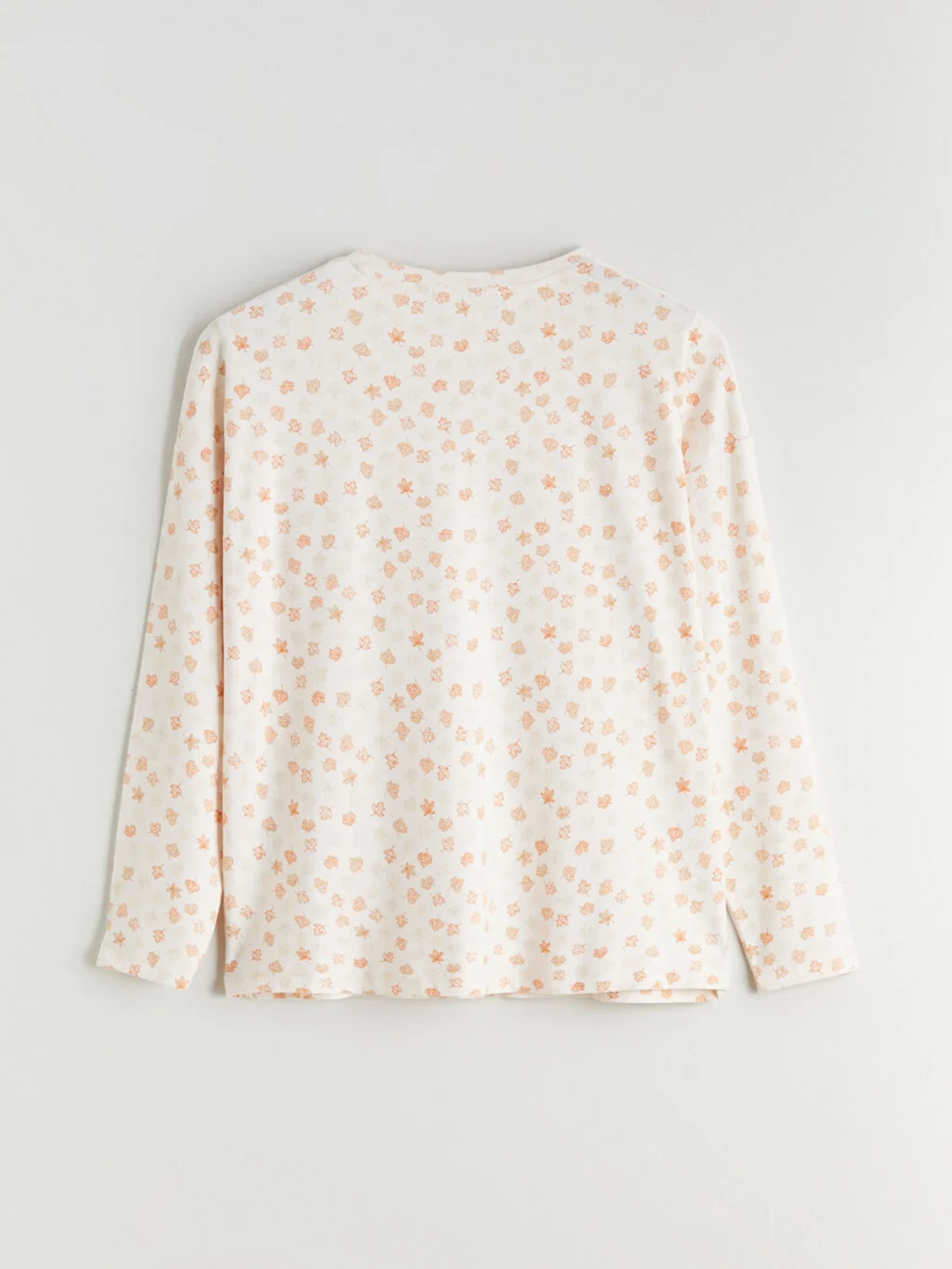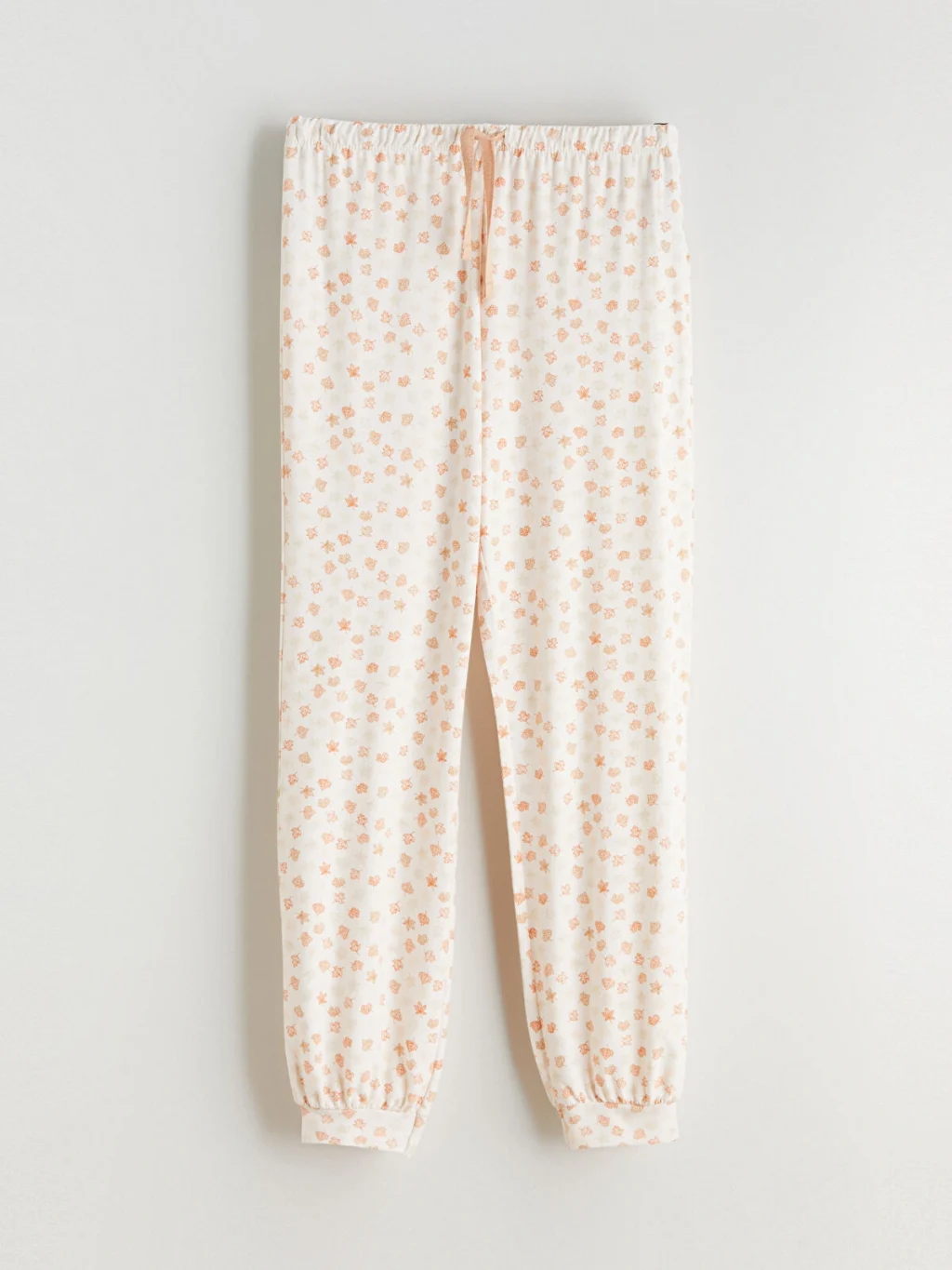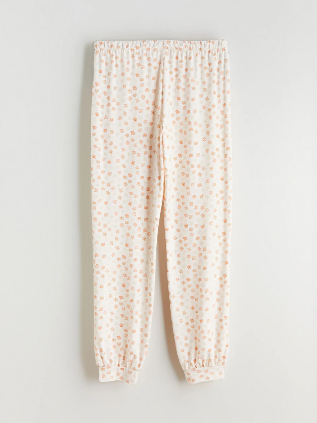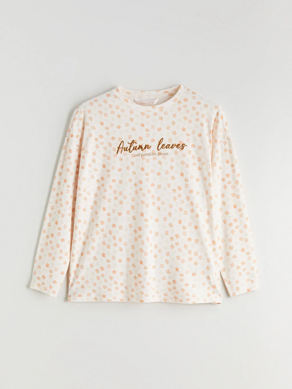 Bisiklet yaka, uzun kollu, önü yazılı ve desenli üst ile paçaları lastikli alttan oluşan kadın pijama takımı, polar kumaştan üretilmiştir.