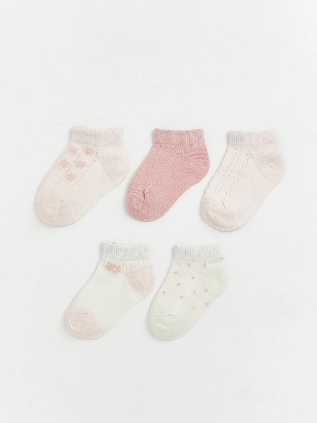Pamuk karışımlı kumaştan üretilmiş, farklı desen ve doku seçeneklerine sahip, beş çiftten oluşan kız bebek patik çorap seti.