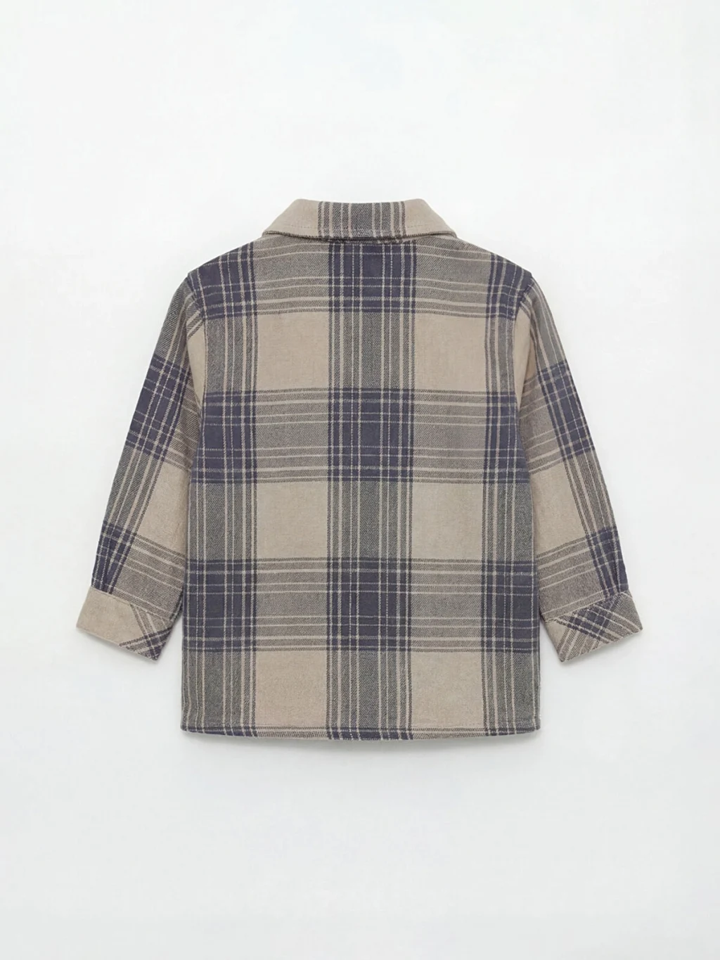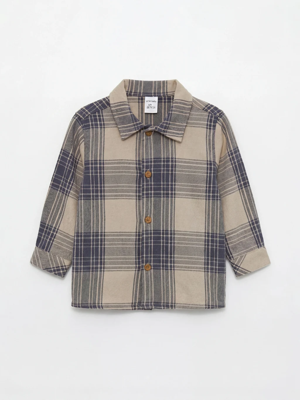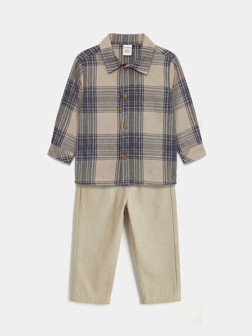 Erkek bebek takım, uzun kollu, yakalı ve ekose desenli gömlek ile pantolondan oluşur. Önden düğme kapamalıdır ve %100 pamuklu kumaştan üretilmiştir.