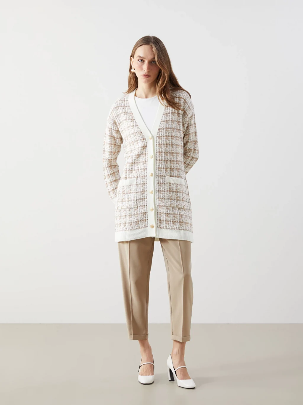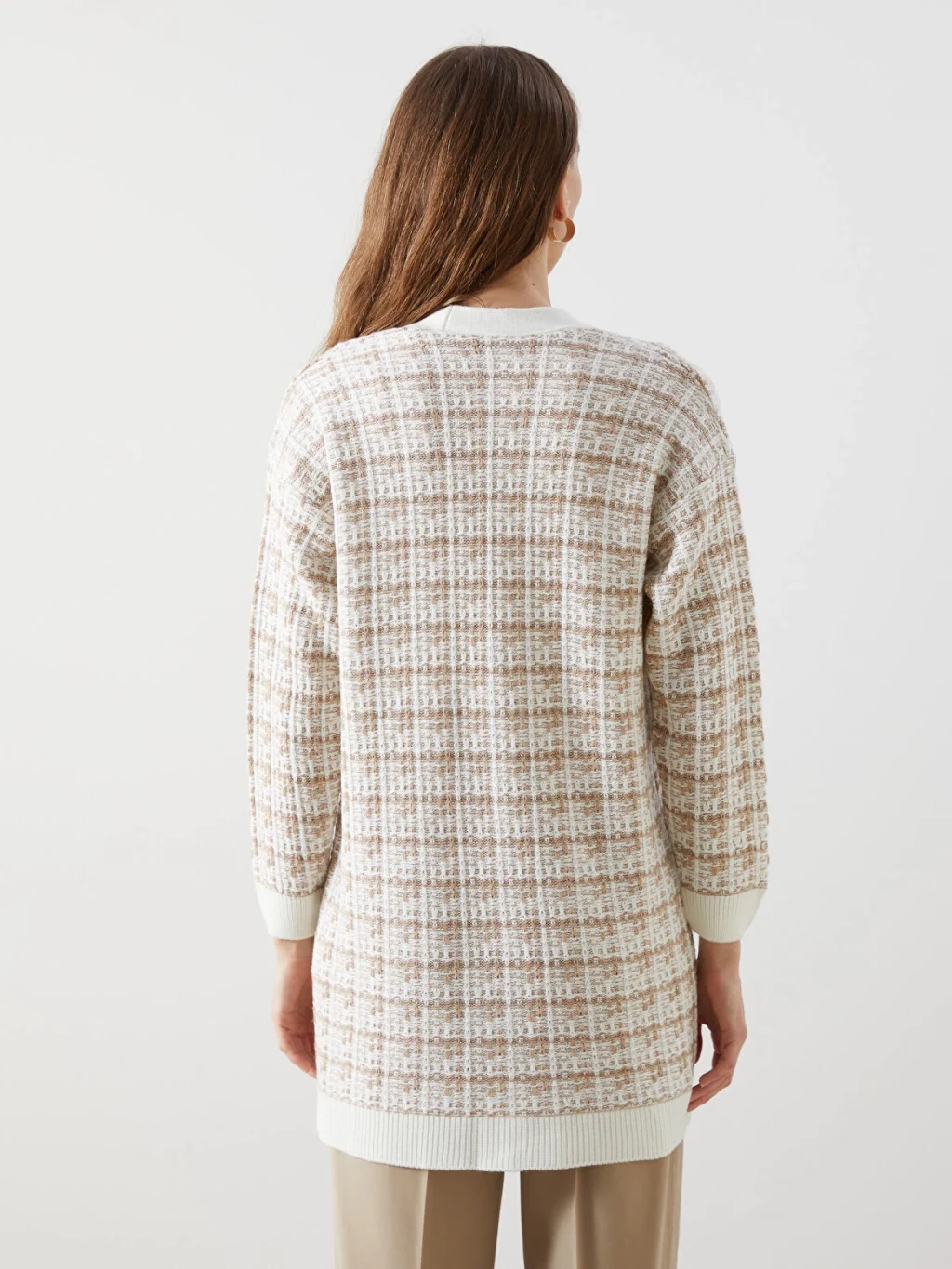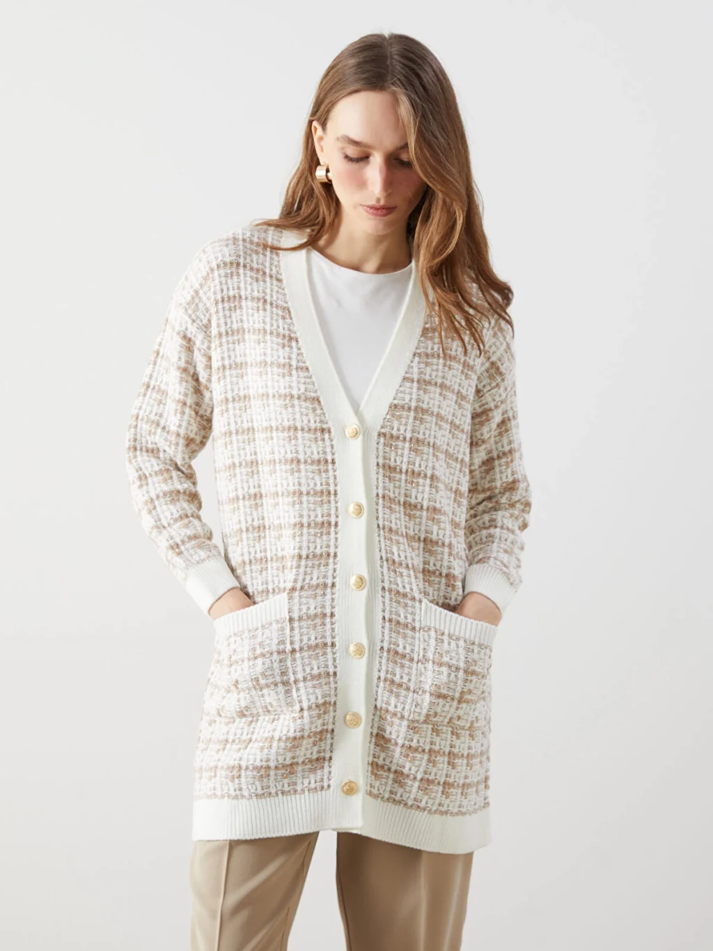 V yaka, uzun kollu kadın triko hırka. Ekose desenli, önden düğme kapamalı ve iki cepli tasarıma sahiptir. Orta kalınlıkta kumaştan üretilmiştir.