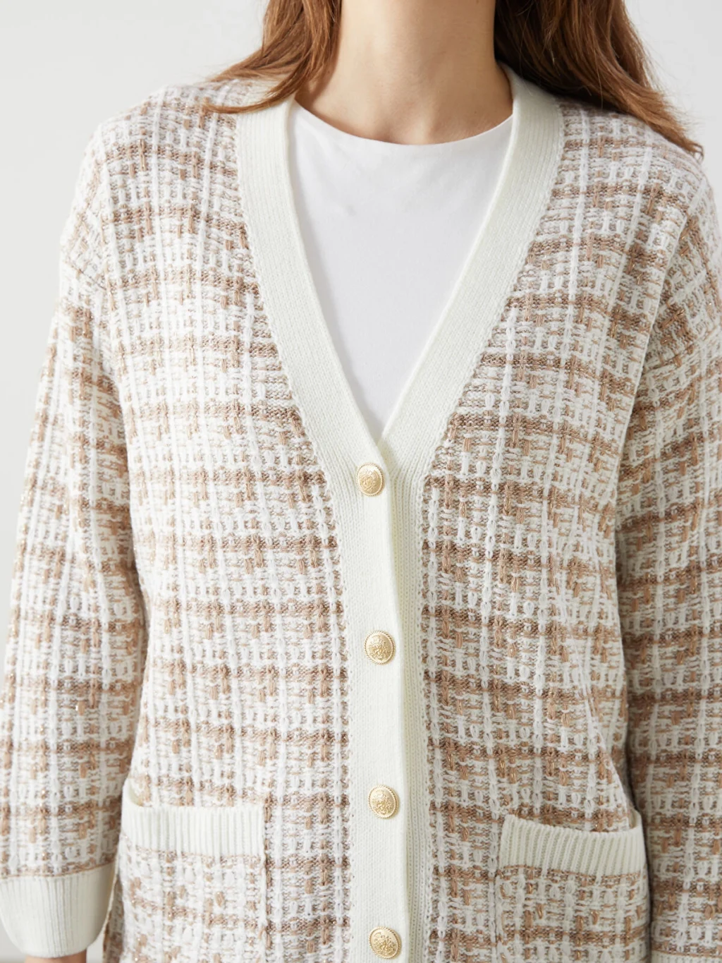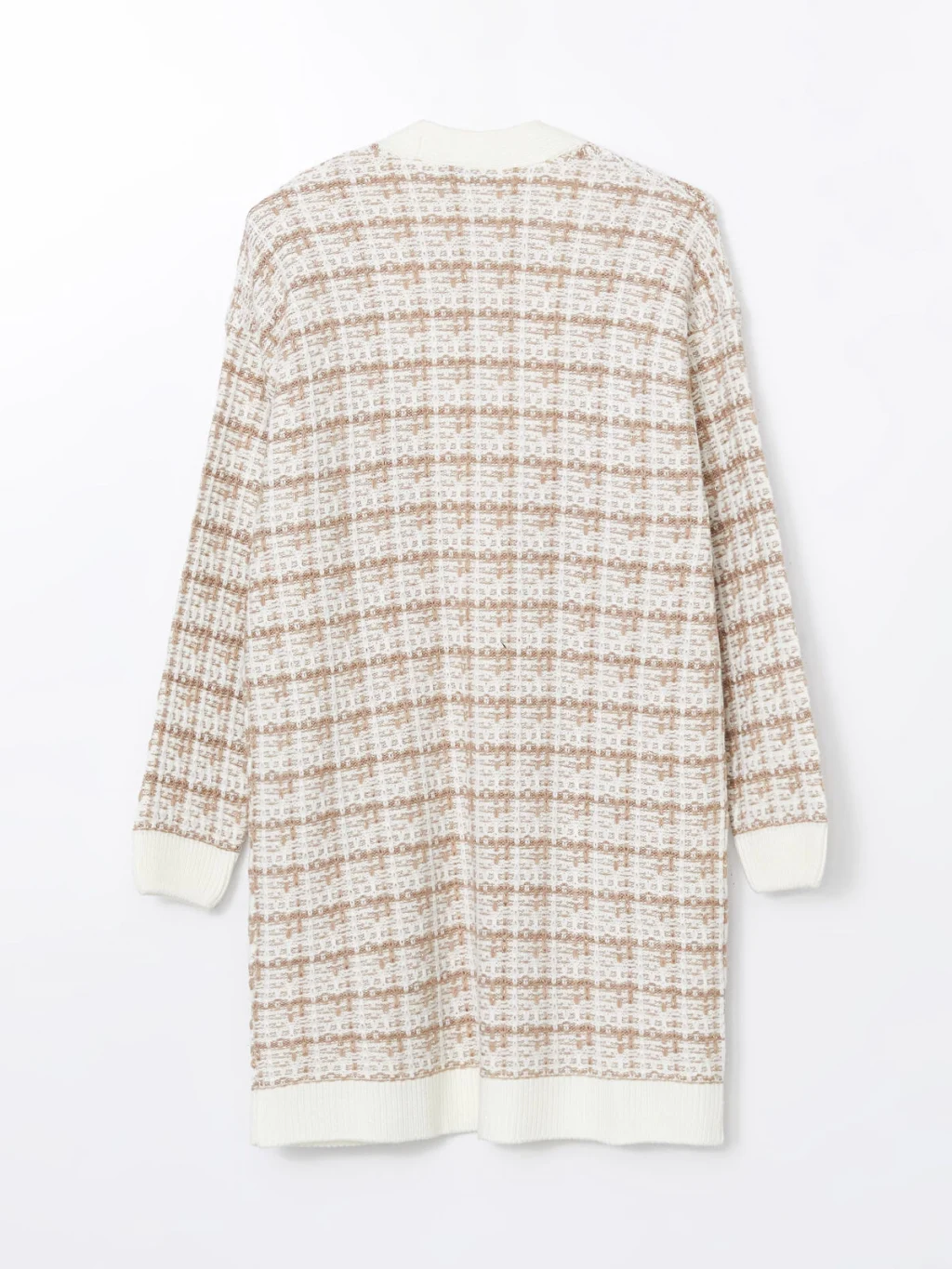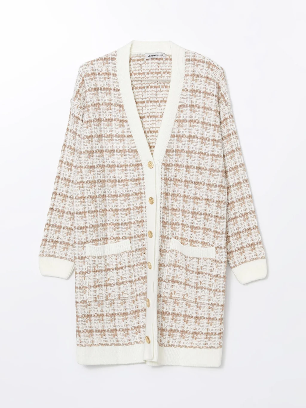 V yaka, uzun kollu kadın triko hırka. Ekose desenli, önden düğme kapamalı ve iki cepli tasarıma sahiptir. Orta kalınlıkta kumaştan üretilmiştir.
