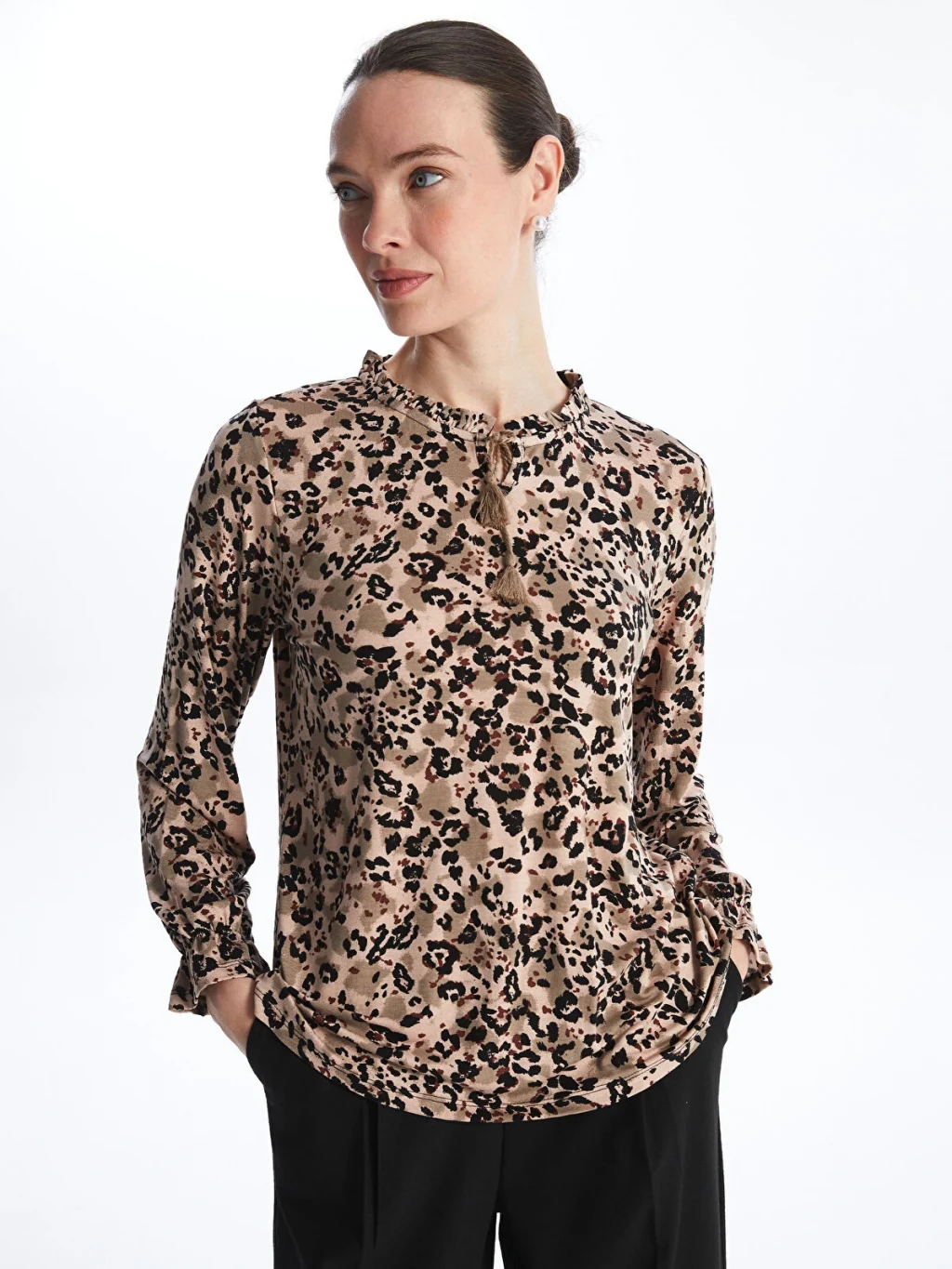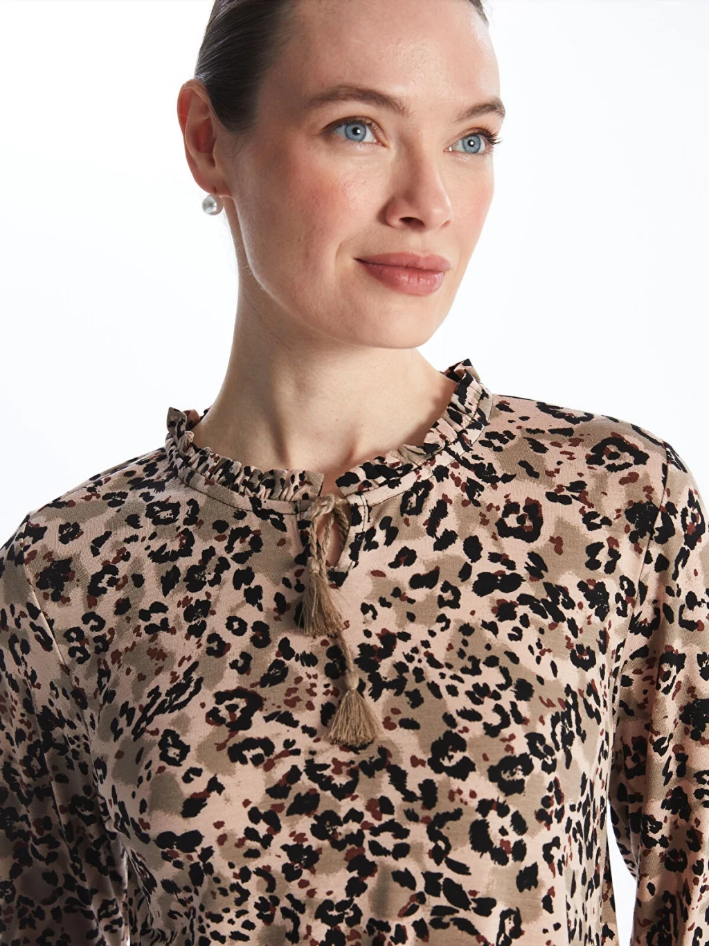 Yakası bağlama detaylı bluz, süprem kumaştan üretildiği için yumuşak bir dokuya sahiptir. Bilekleri lastikli olan tasarımı şık bir görünüm sunar. Desenli detayları ise bluza canlılık ve hareket katar.