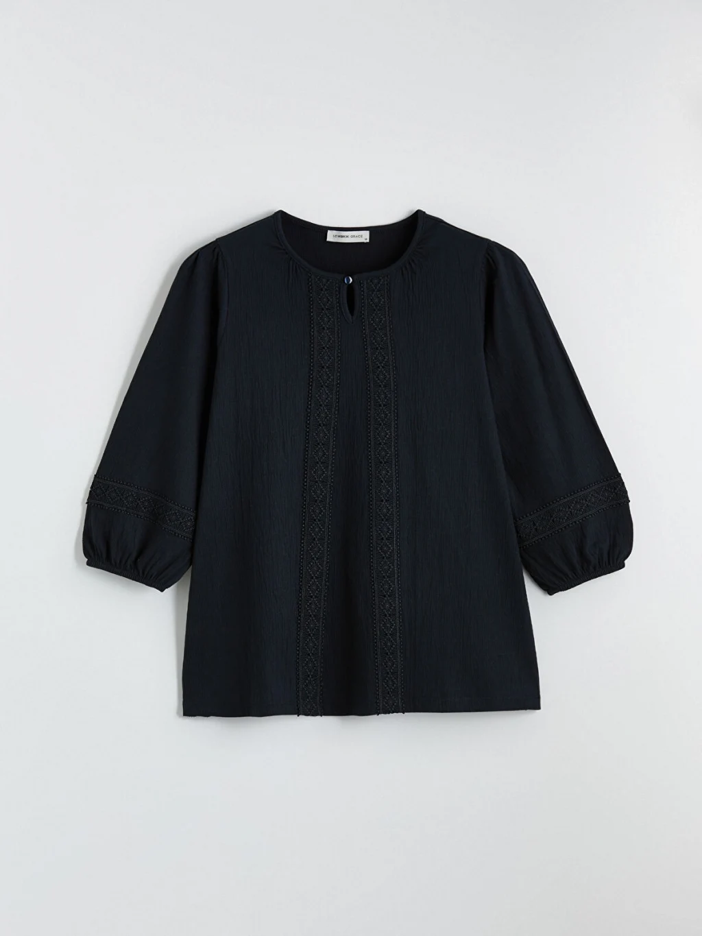 Yüksek pamuk içerikli kumaştan üretilen kadın bluz, bisiklet yakalı ve truvakar kolludur. Önü ve kolları nakışlıdır, kol ucu lastiklidir.
