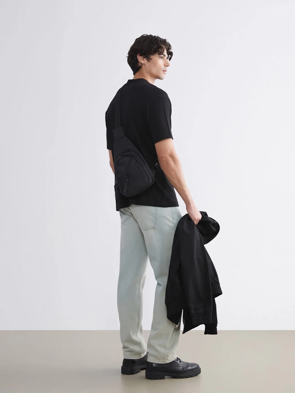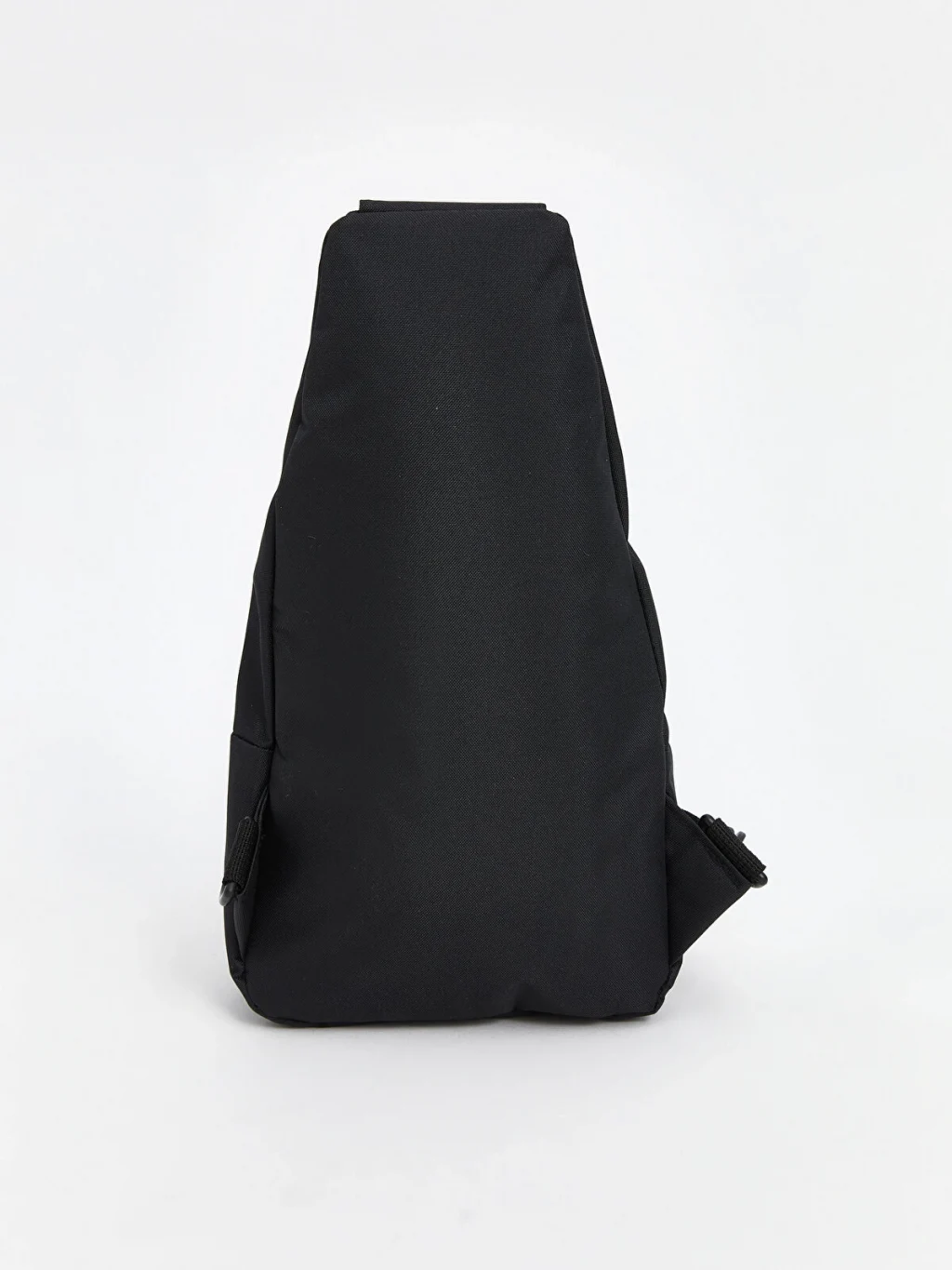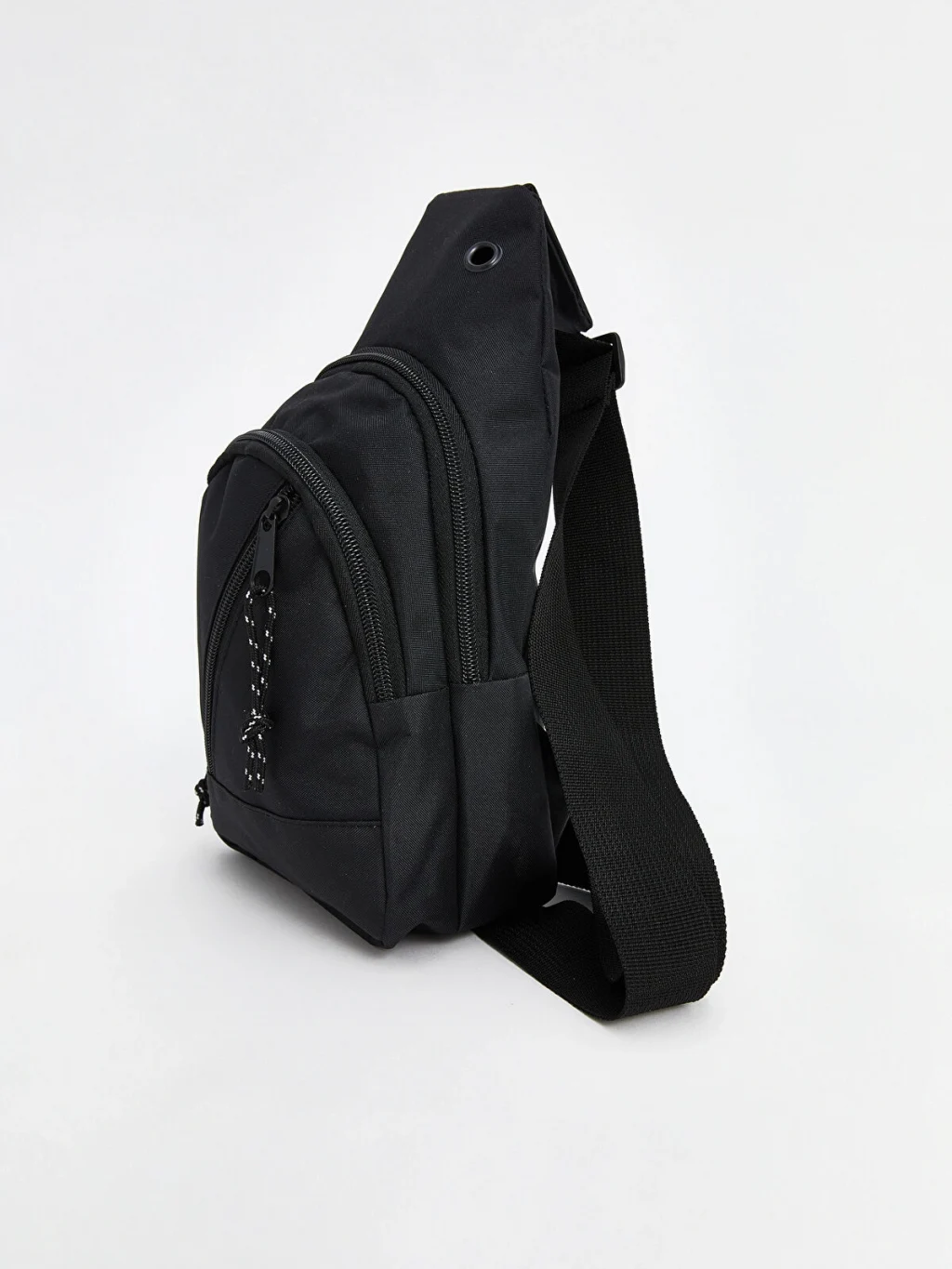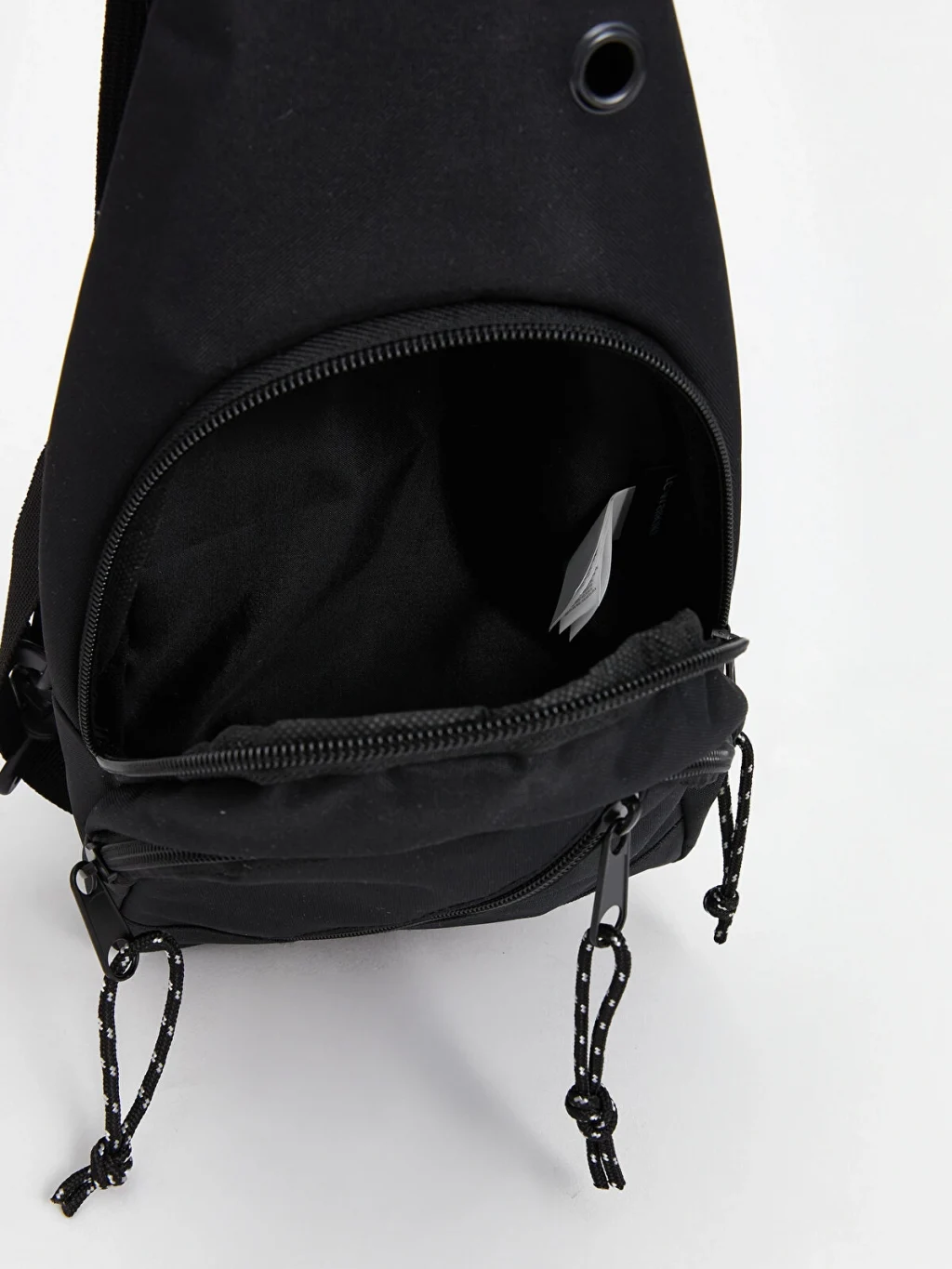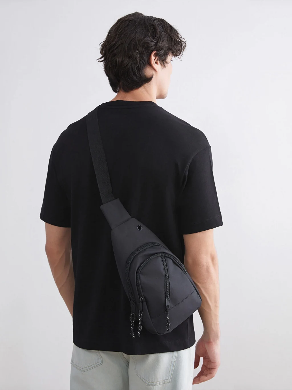 Erkek göğüs çantası, fermuar kapamalı ana bölmeye ve ön yüzünde çapraz fermuarlı bir cebe sahiptir. Kulaklık çıkışı için halka detayı bulunur.