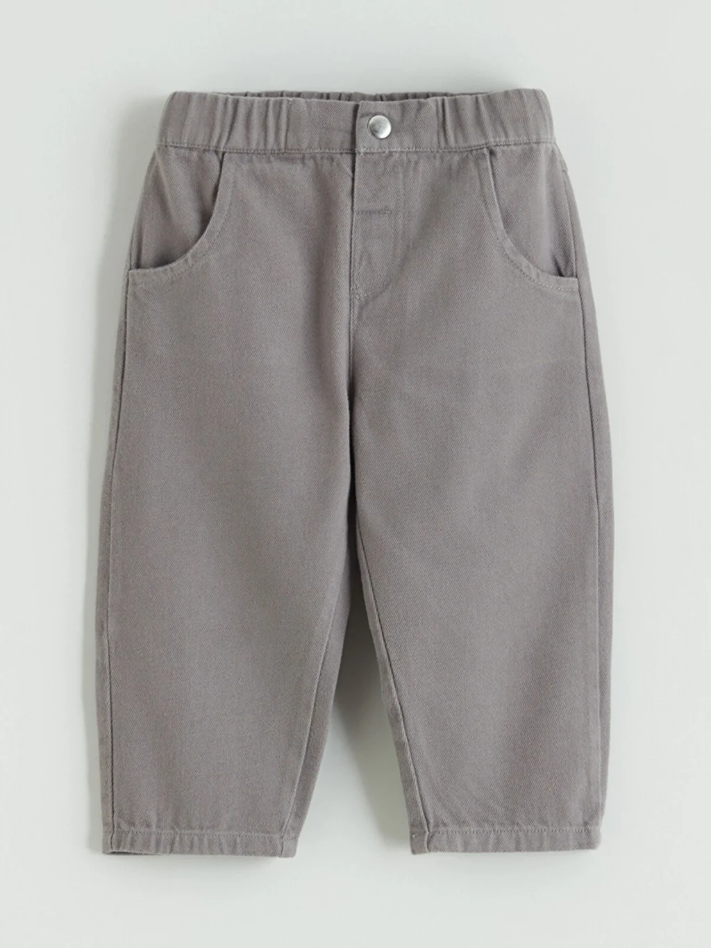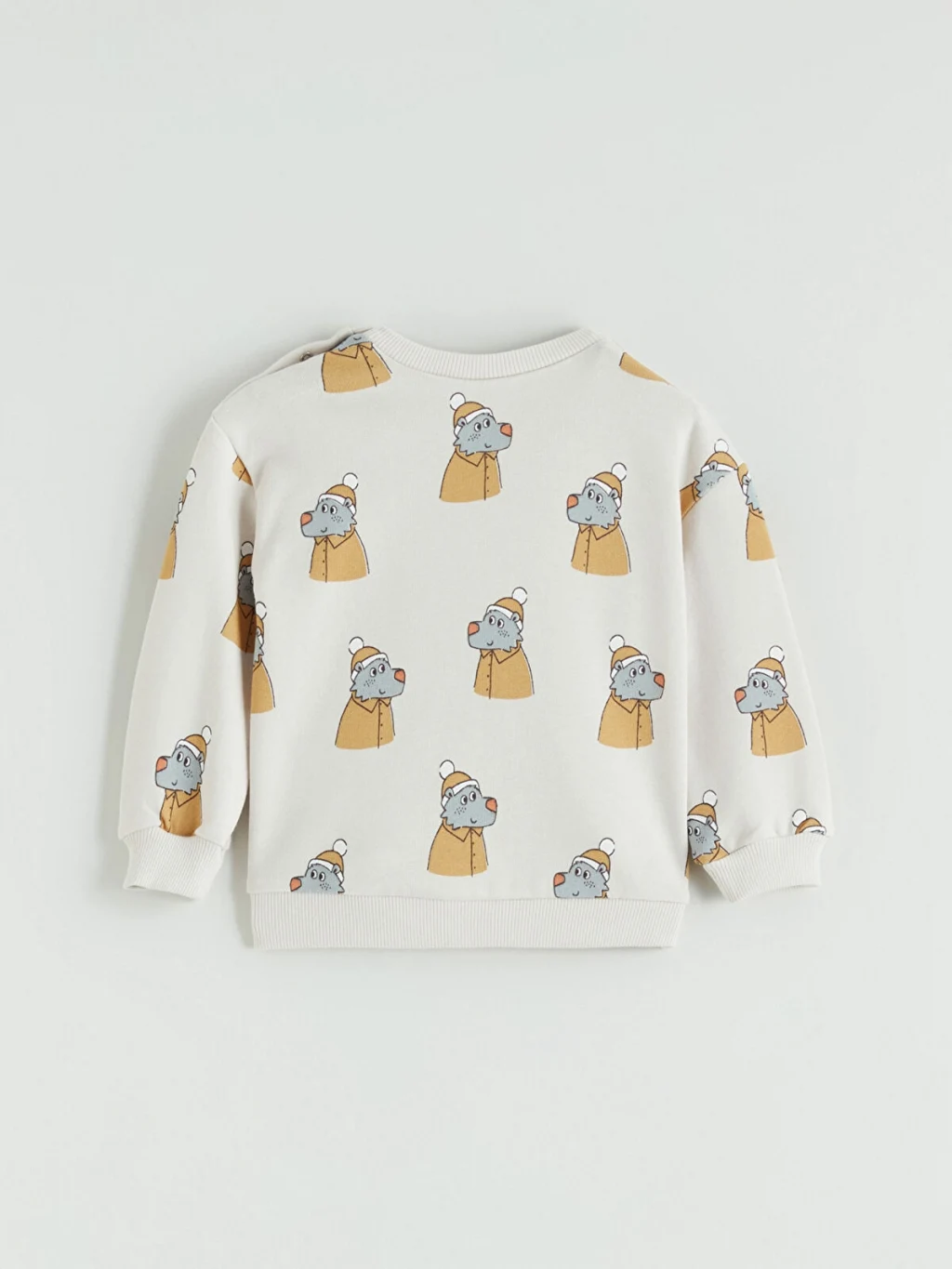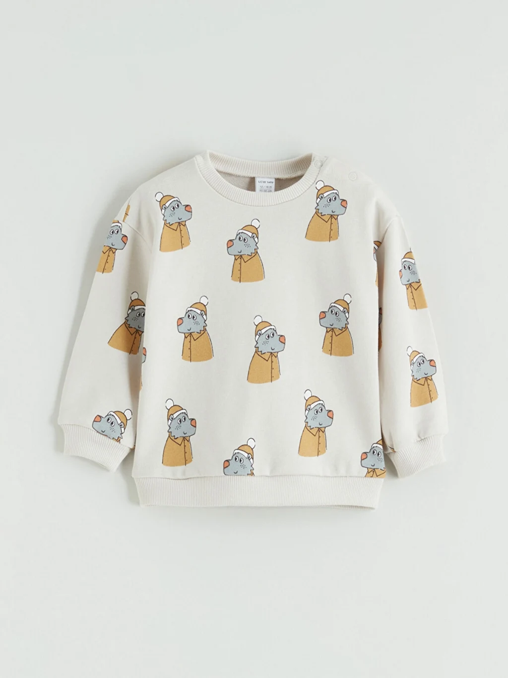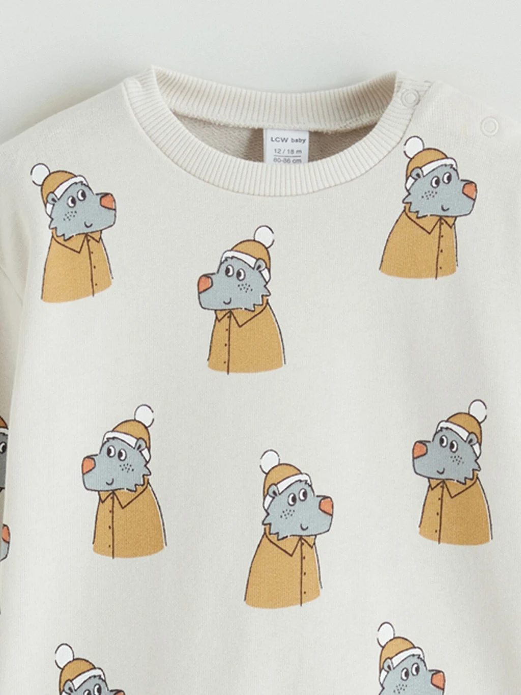 %100 pamuk 3 iplik kumaştan üretilen erkek bebek takım, bisiklet yaka, uzun kollu, desenli sweatshirt ve pantolondan oluşur. Sweatshirt omuzdan çıtçıt kapamalıdır.