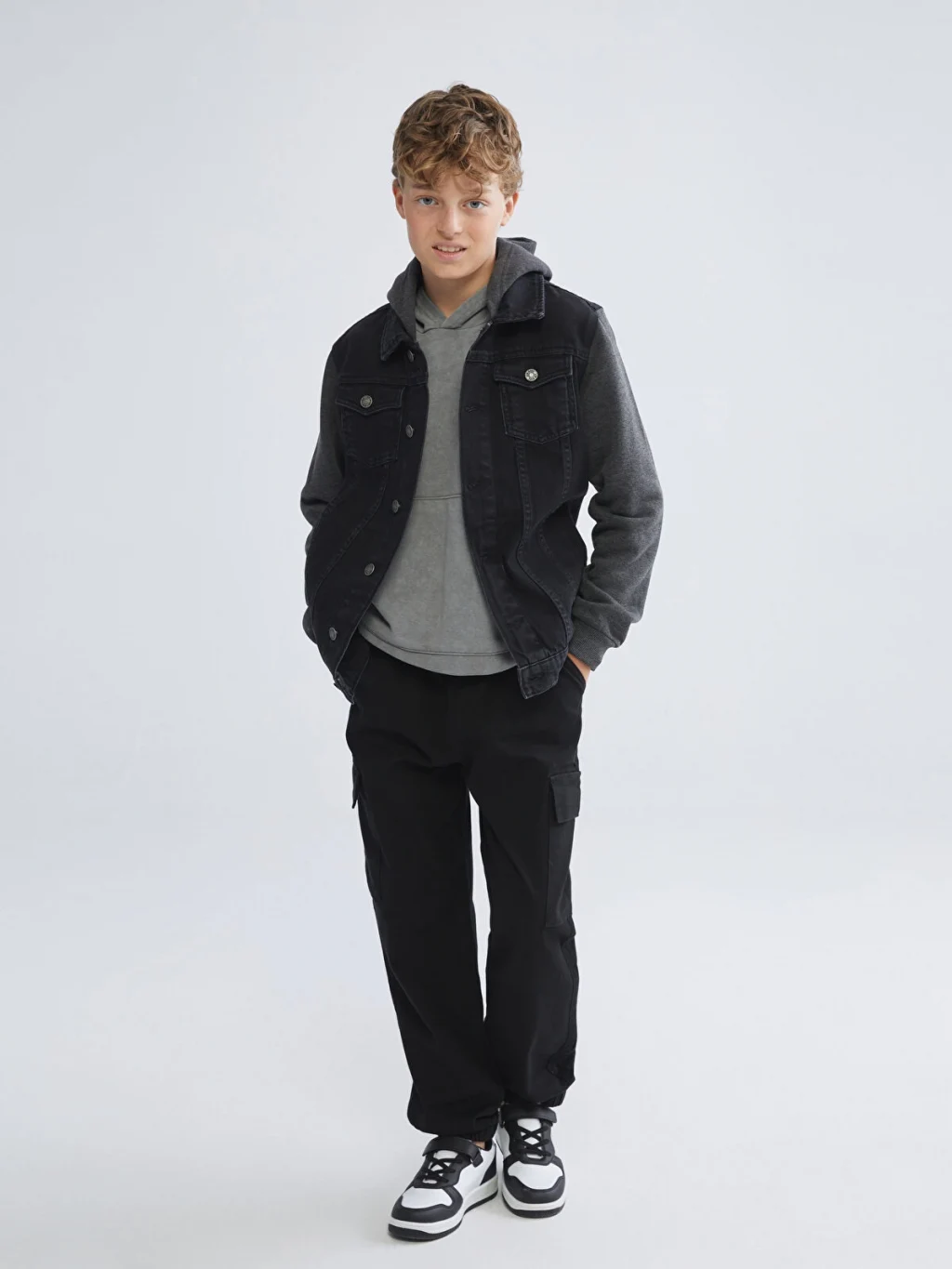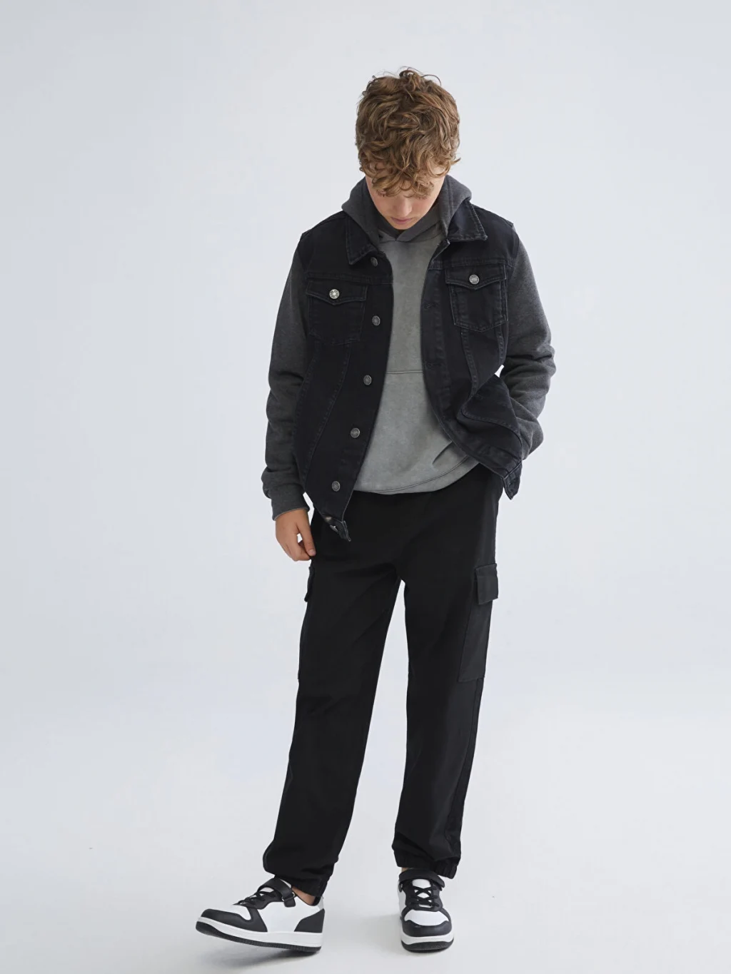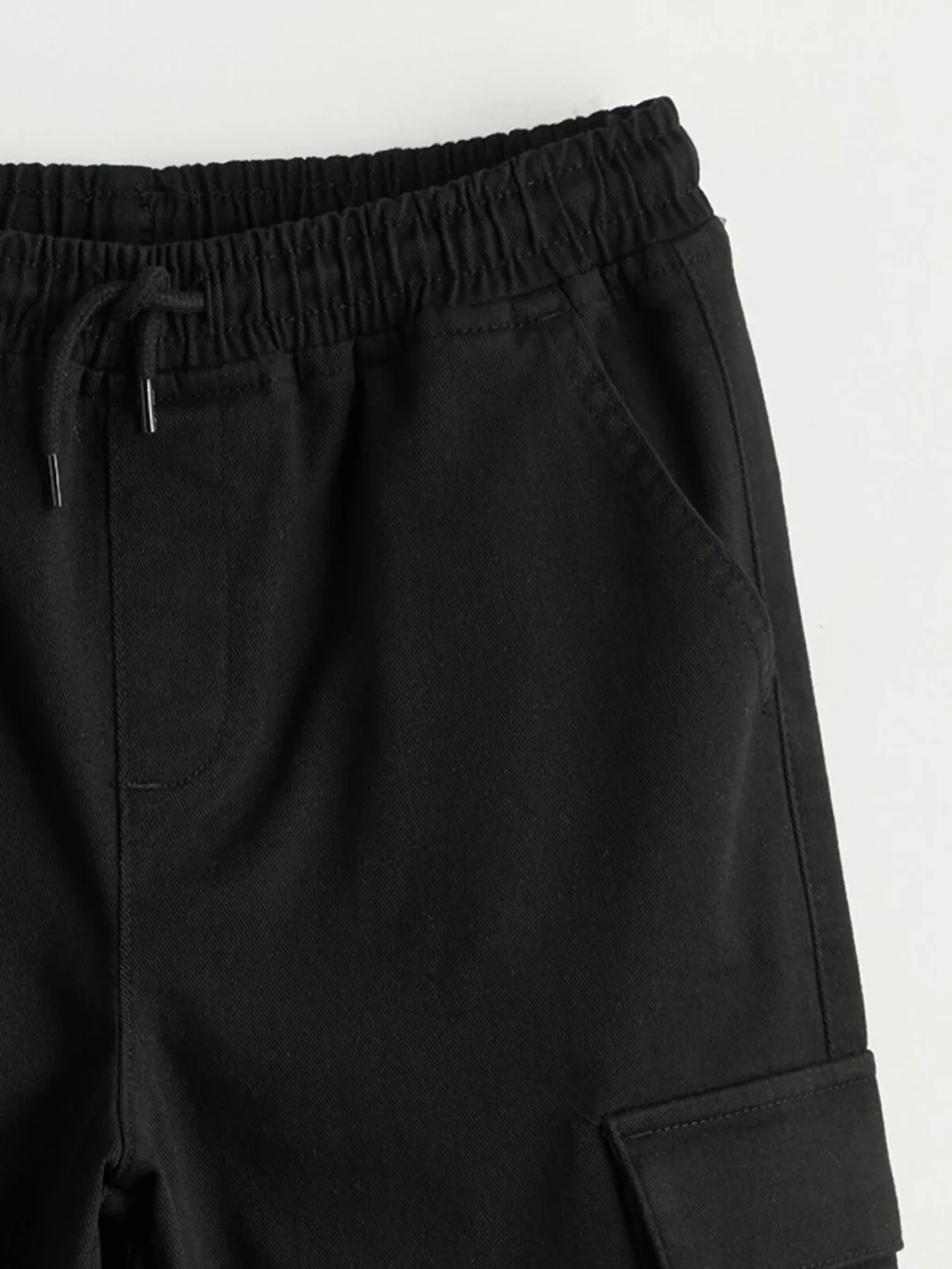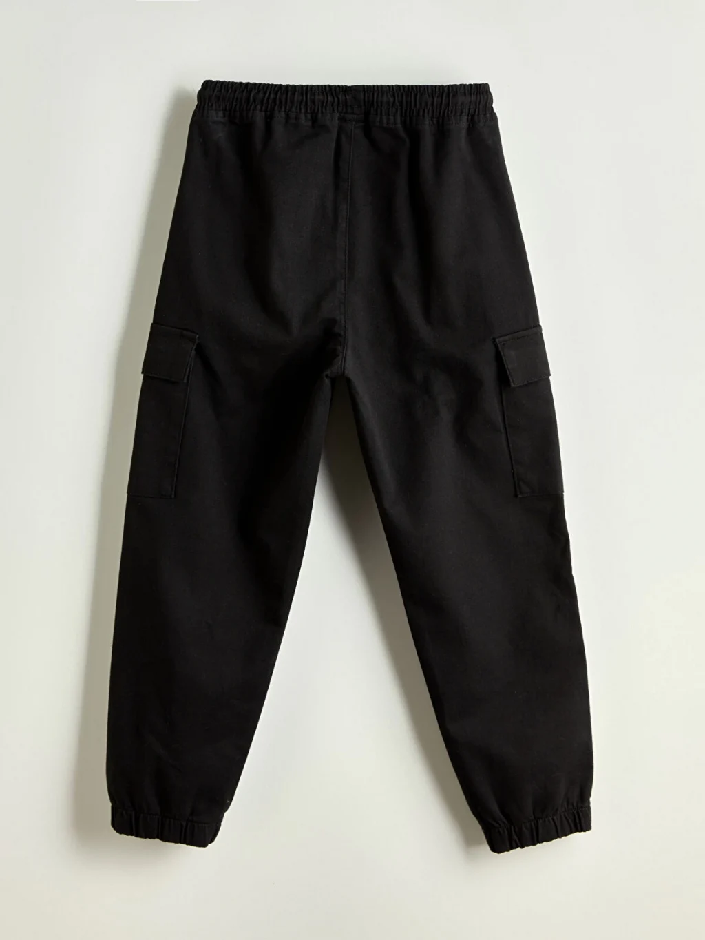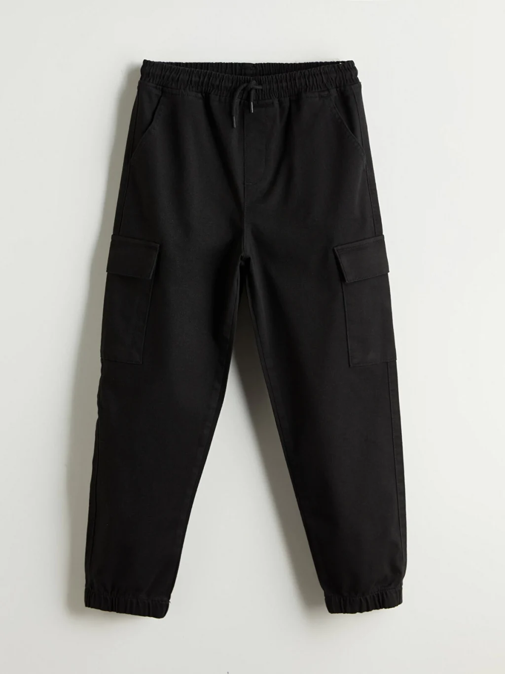 Beli lastikli pantolon, gabardin kumaştan üretilmiştir. Yan cepleri ve kapaklı kargo cepleri bulunur. Paçaları lastiklidir.