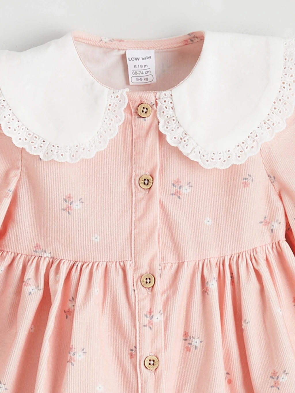 Bebe yakalı ve uzun kollu kız bebek elbise, çiçek desenlidir. Önden düğme kapamalıdır, beli büzgülü ve kol uçları lastiklidir.