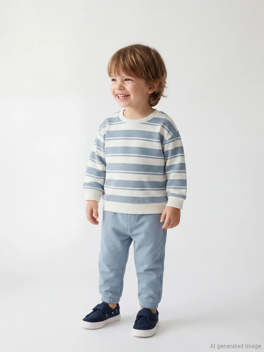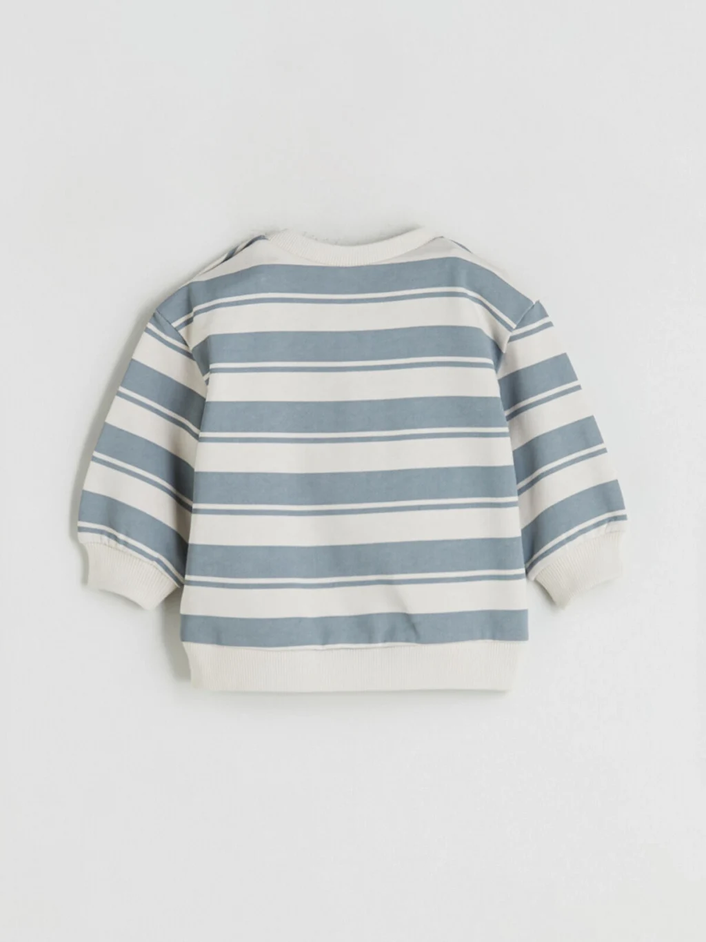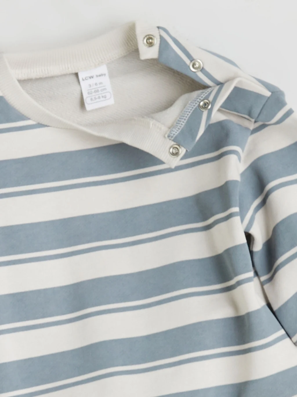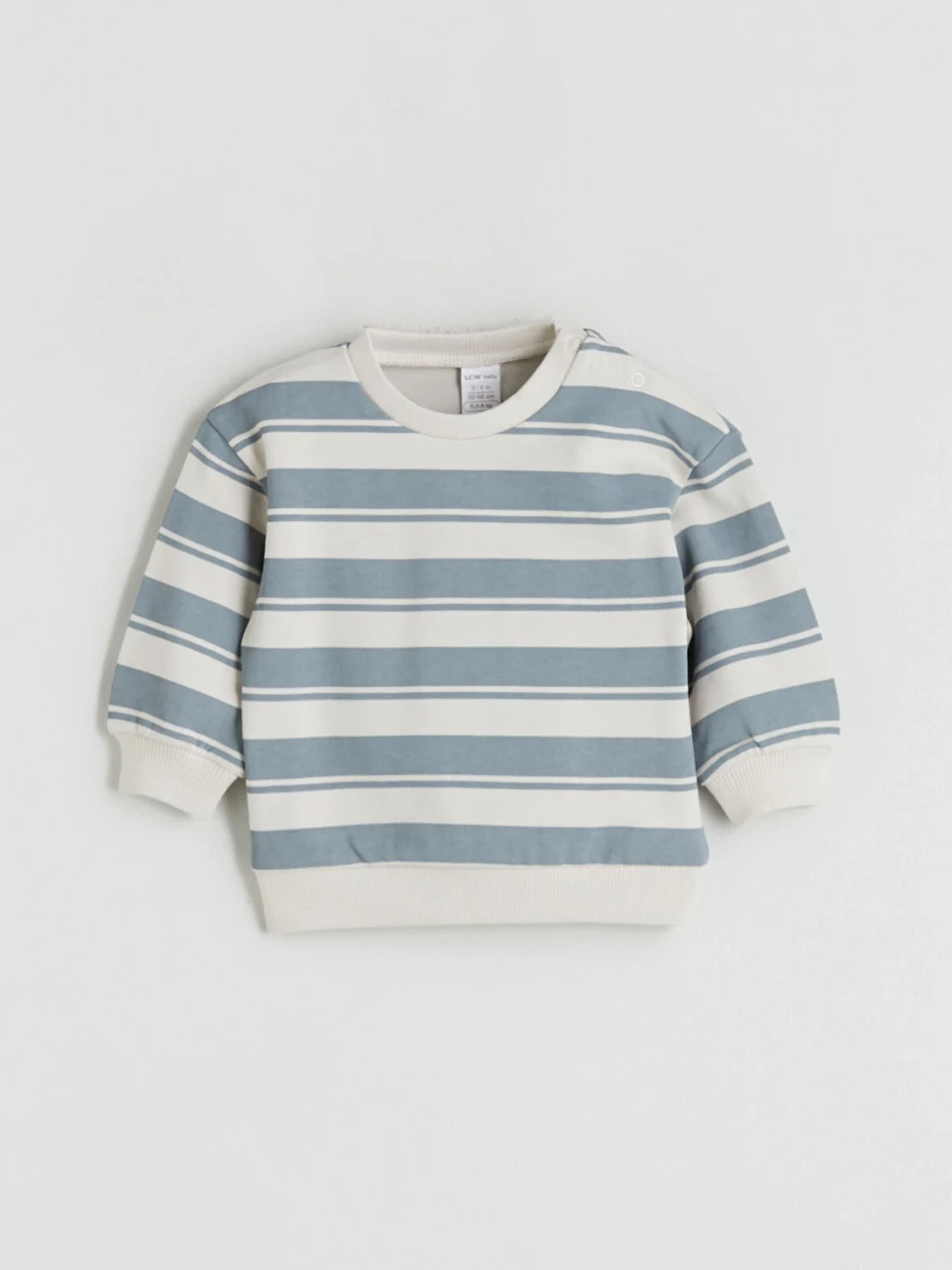 Erkek bebek takımı, omuzdan çıtçıt kapamalı, bisiklet yaka, çizgili ve uzun kollu bir sweatshirt ile paçaları ribanalı eşofman altından oluşur.
