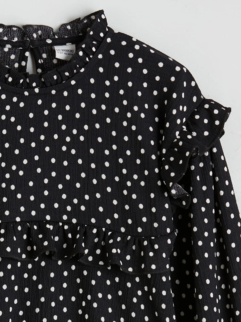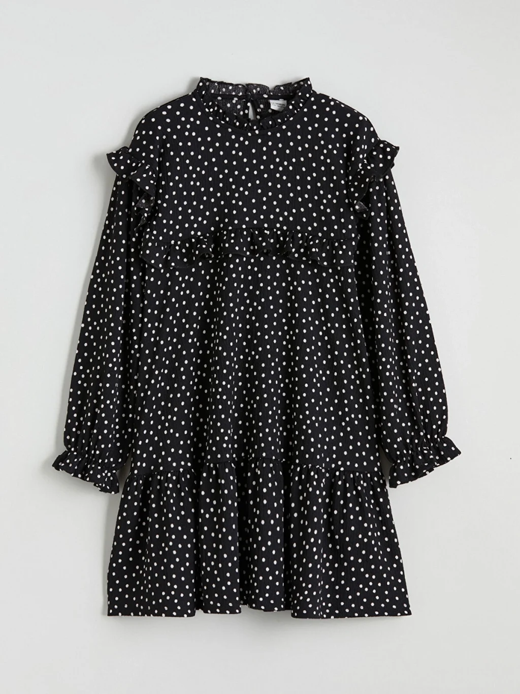 Puantiyeli kız çocuk elbise; fırfırlı dik yakalı, uzun kollu ve katlı tasarımlıdır. Kol uçları ve omuzları fırfırlıdır. Enseden düğmelidir.