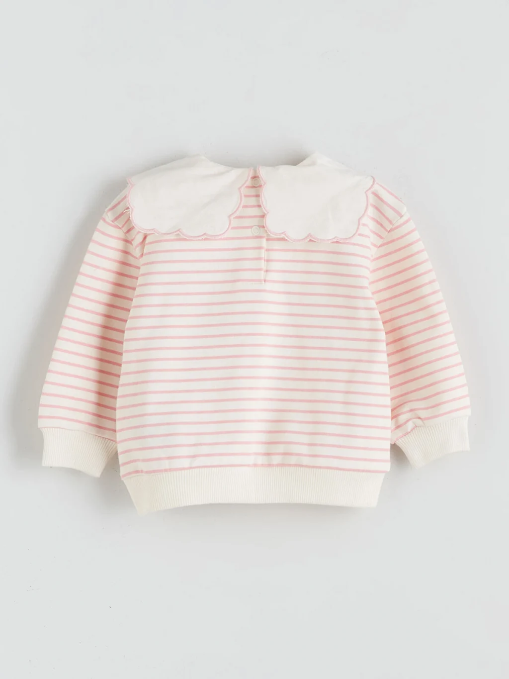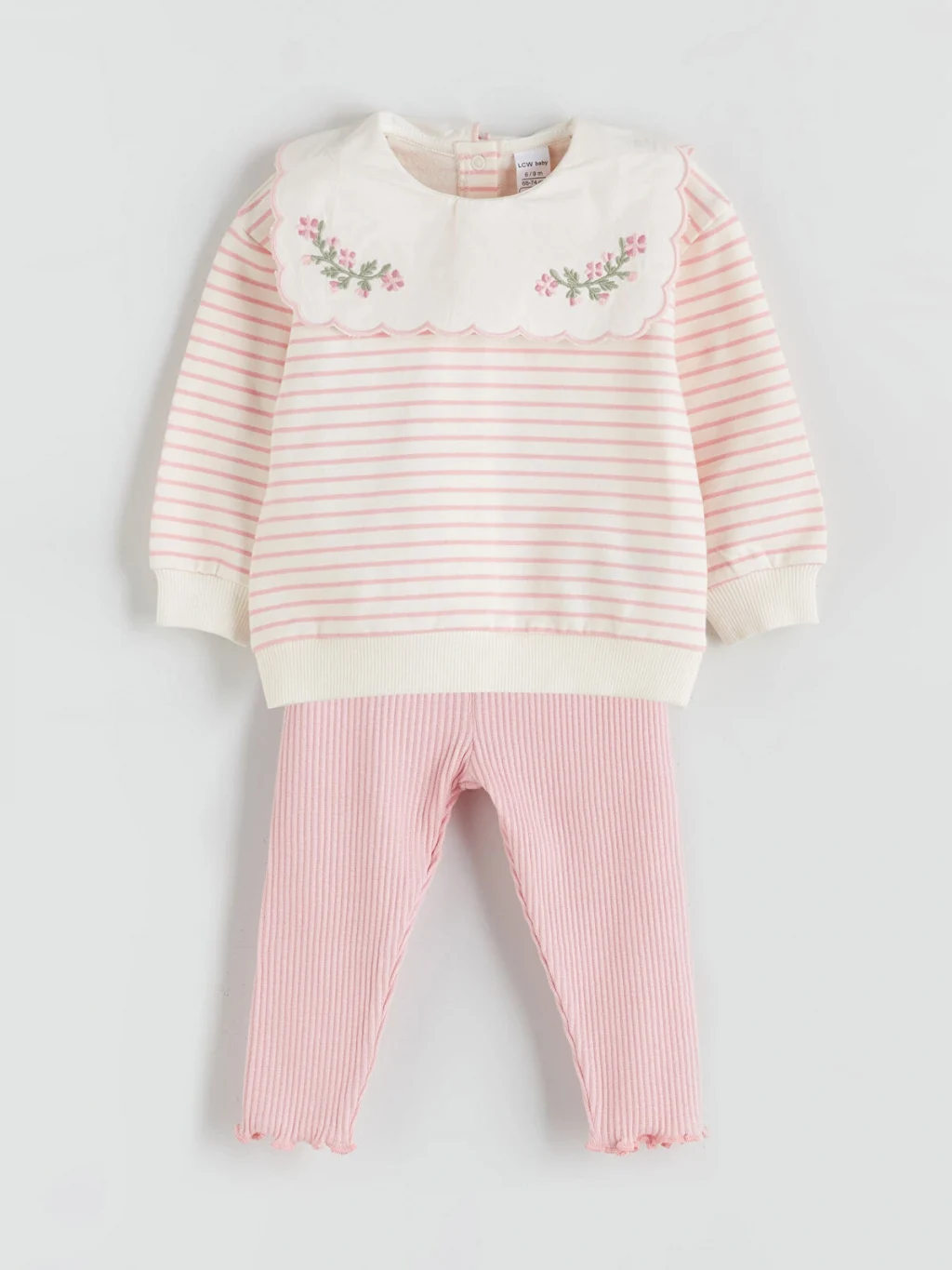 Kız bebek takım, çiçek nakışlı ve fistolu bebe yakalı, uzun kollu, çizgili sweatshirt ve paçası kıvrımlı fitilli tayttan oluşur.