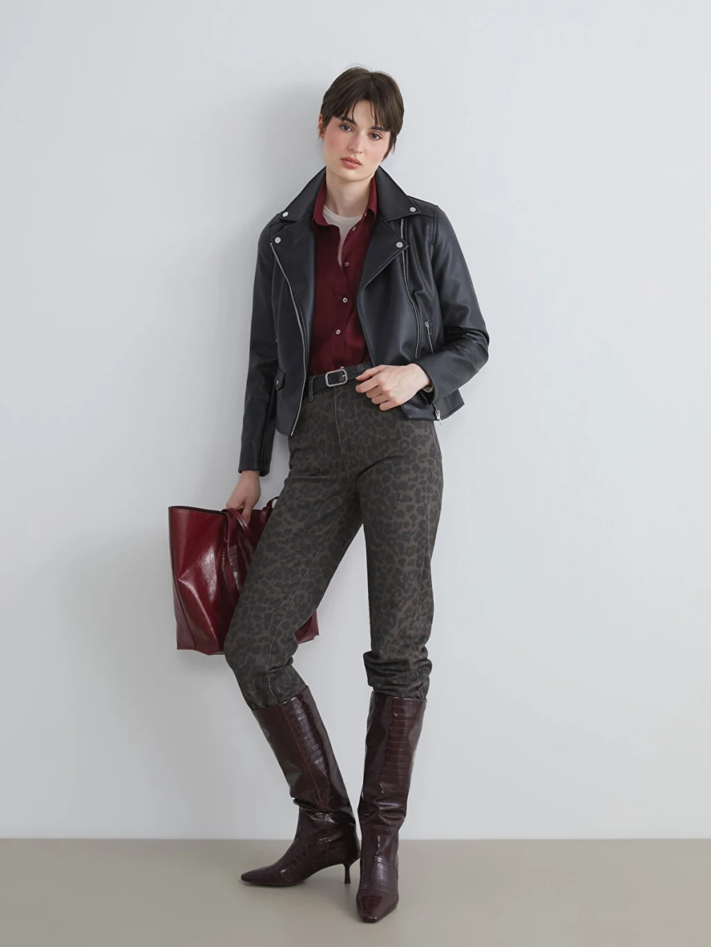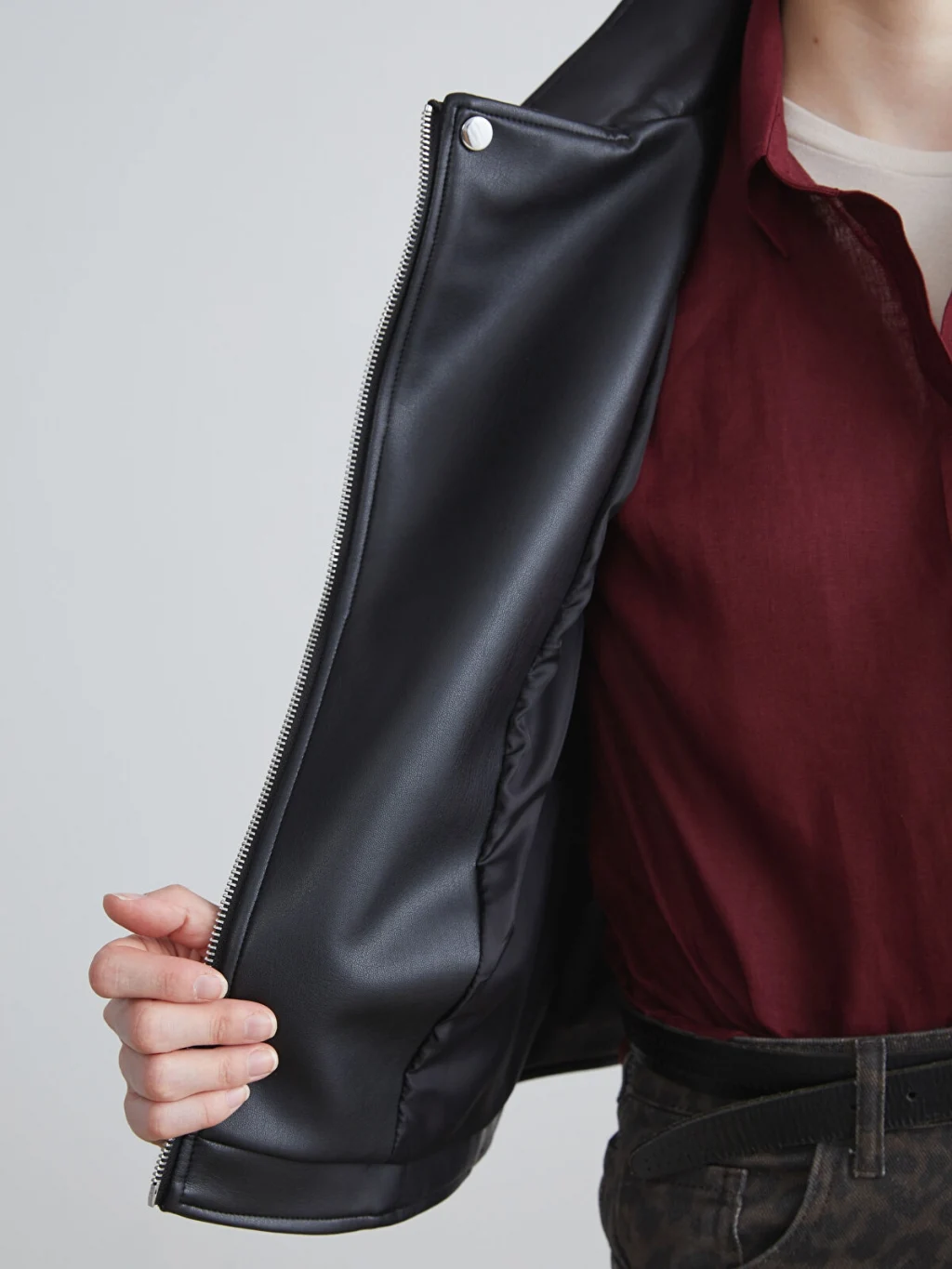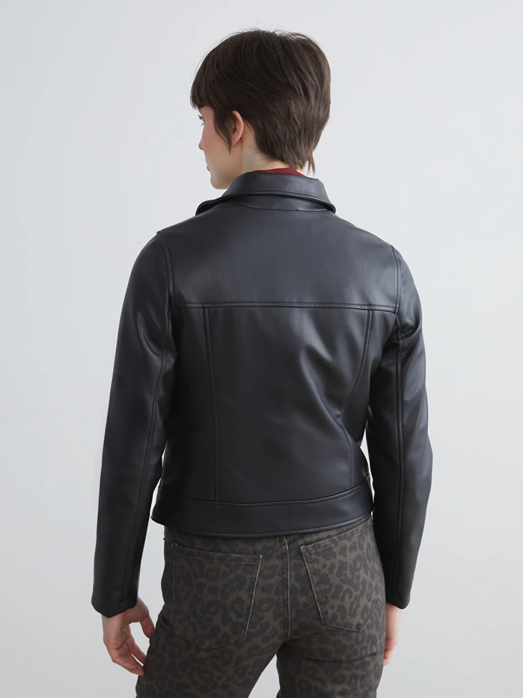 Düz uzun kollu kadın deri görünümlü ceket, önden fermuar kapamalıdır. Fermuarlı çift cepli tasarıma sahiptir.